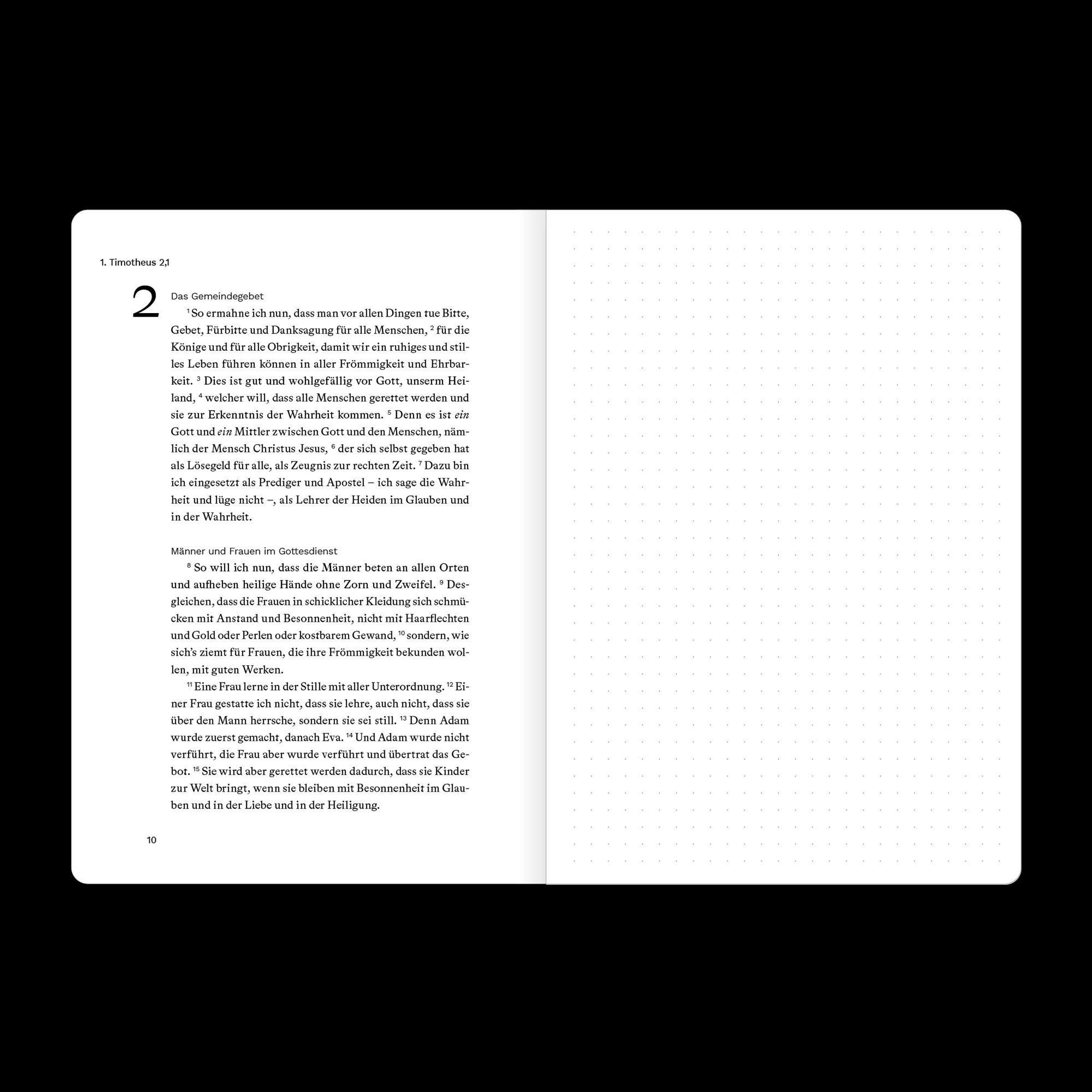Diefses Bibeljournal kombiniert den vollständigen Bibeltext eines biblischen Buches (Luther 2017) und eine gegenüberliegende Seite mit dezentem Punktraster für deine persönlichen Notizen, Gedanken oder Gebete. So kannst du direkt neben dem Text festhalten, was dich beim Lesen bewegt.