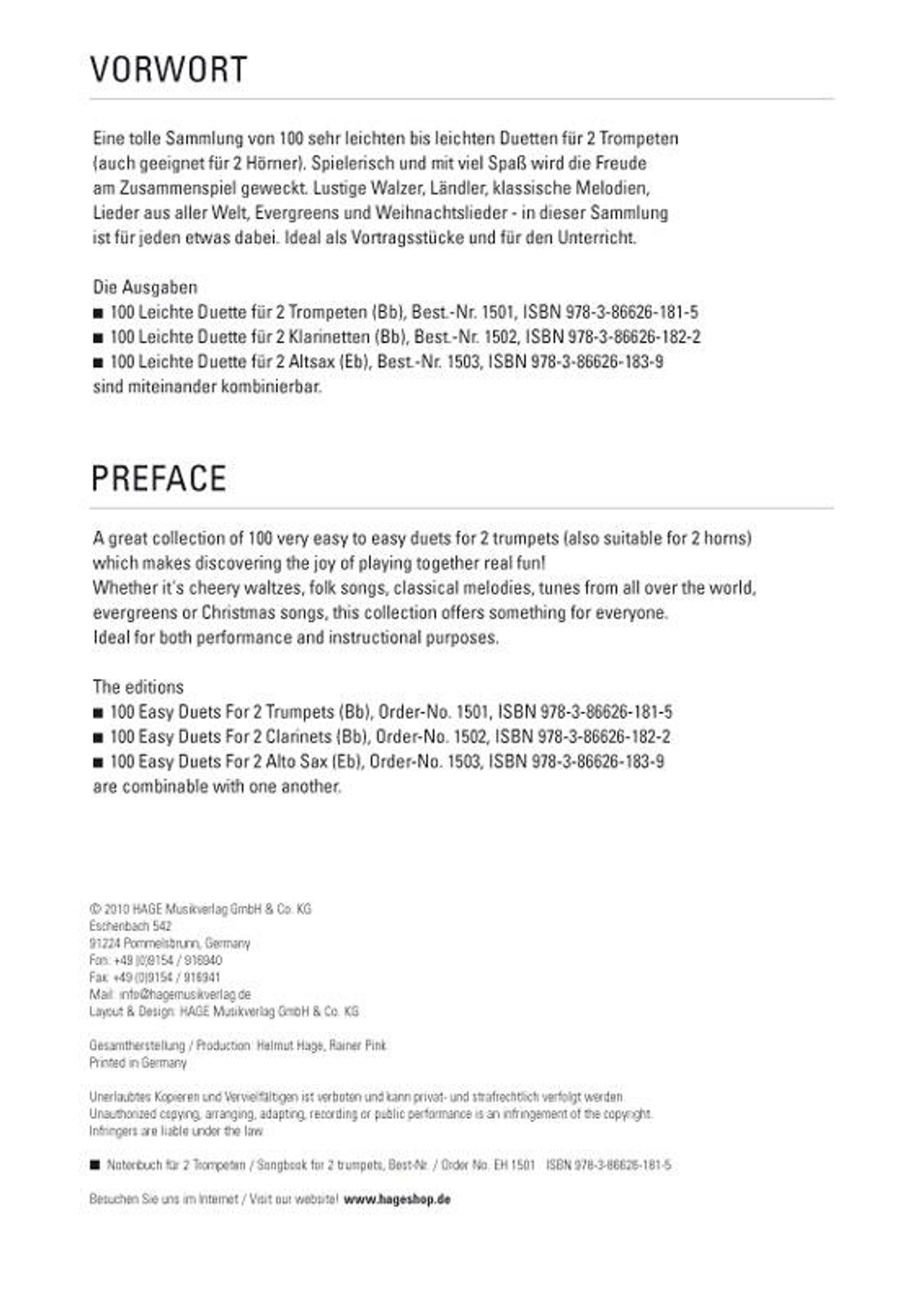 Eine tolle Sammlung von 100 sehr leichten bis leichten Duetten für 2 Trompeten (auch geeignet für 2 Hörner). Spielerisch und mit viel Spaß wird die Freude am Zusammenspiel geweckt. Lustige Walzer, Ländler, klassische Melodien, Lieder aus aller Welt, Evergreens und Weihnachtslieder - in dieser Sammlung ist für jeden etwas dabei. Ideal als Vortragsstücke und für den Unterricht.