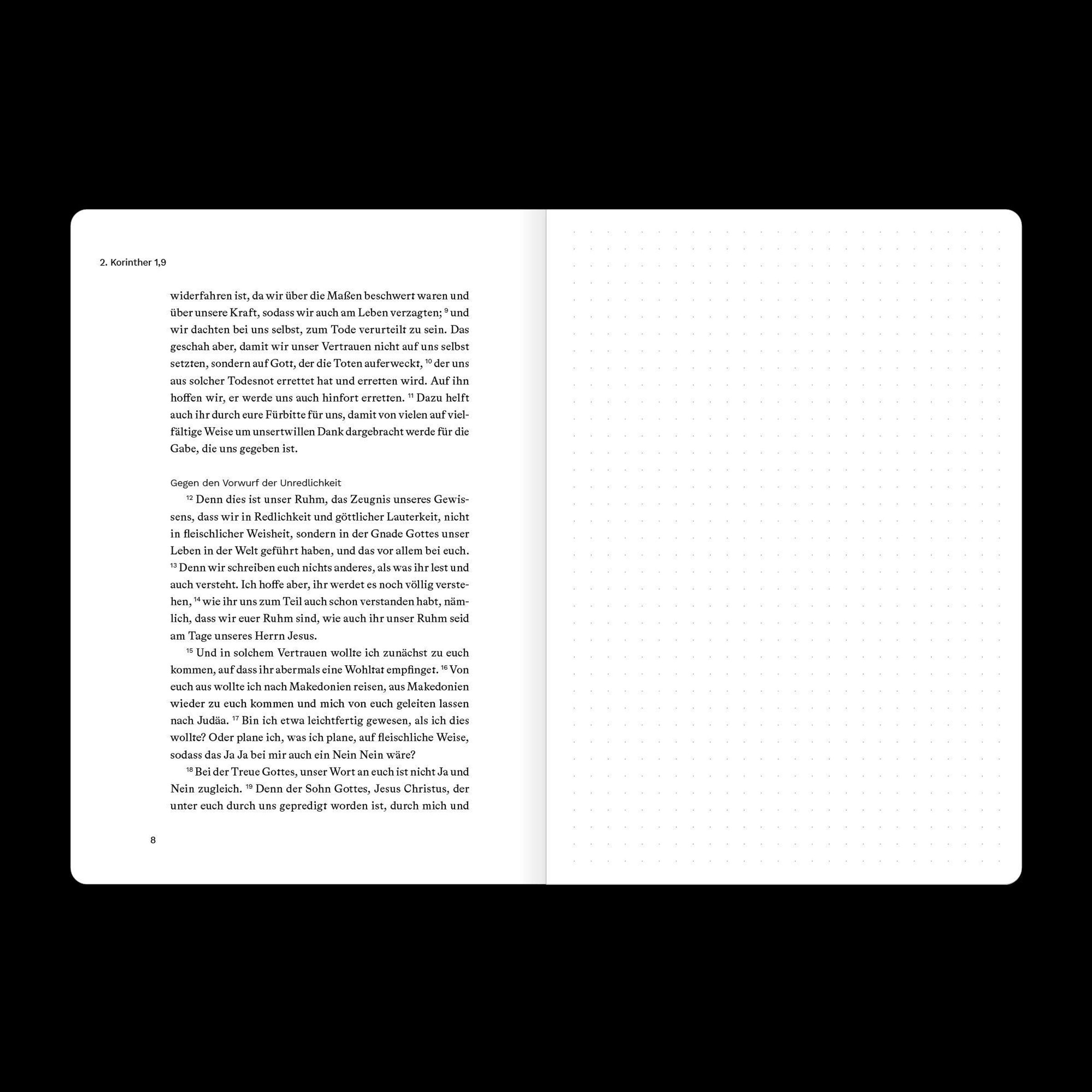 Dieses Bibeljournal kombiniert den vollständigen Bibeltext eines biblischen Buches (Luther 2017) und eine gegenüberliegende Seite mit dezentem Punktraster für deine persönlichen Notizen, Gedanken oder Gebete. So kannst du direkt neben dem Text festhalten, was dich beim Lesen bewegt.