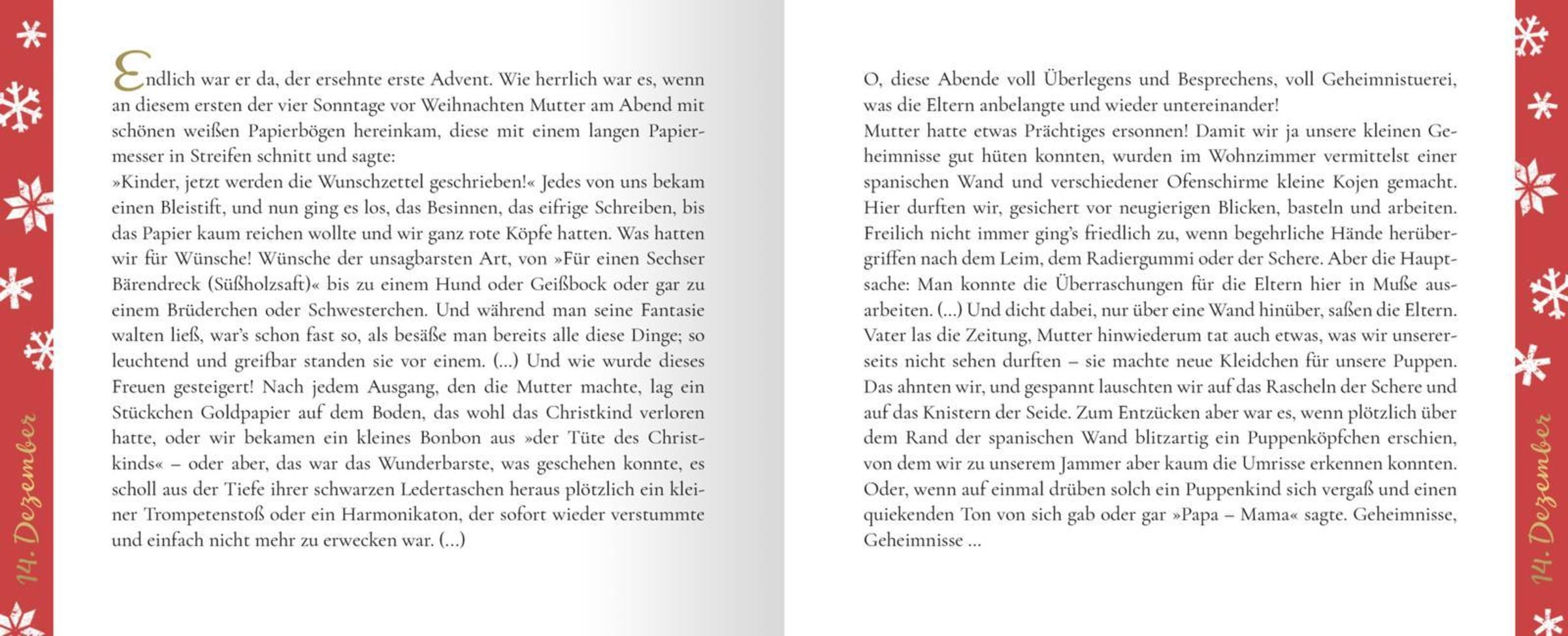 Dieses Adventsbuch schenkt in der Weihnachtszeit viel Freude und Inspiration, denn an jedem Tag kann eine der seitlich geschlossenen Seiten aufgeschnitten oder -getrennt werden. Das Adventskalenderbuch beinhaltet eine weihnachtliche Sammlung von Geschichten und Gedichten, die man mit der ganzen Familie zusammen lesen kann. In den gemütlichen Stunden auf dem Sofa oder vor dem Kamin, wenn das Kaminfeuer vor sich hin knistert, kann man sich wunderbar in die Geschichtensammlung vertiefen und die schönen literarischen Geschichten lesen. Die Texte eignen sich auch zum Vorlesen, wenn man in geselliger Runde zusammensitzt. Somit ist das Buch ein wunderbares Geschenk für die ganze Familie!