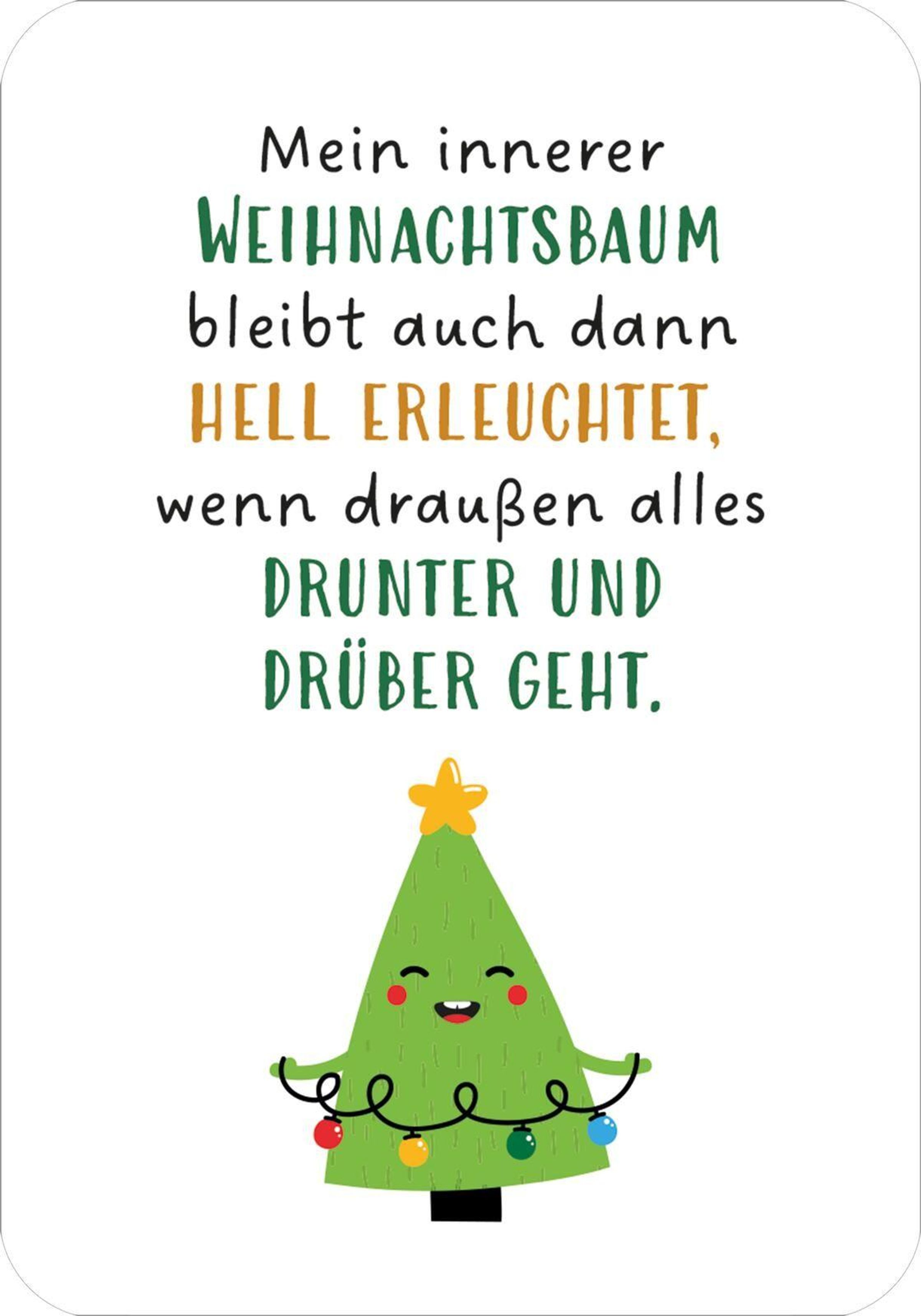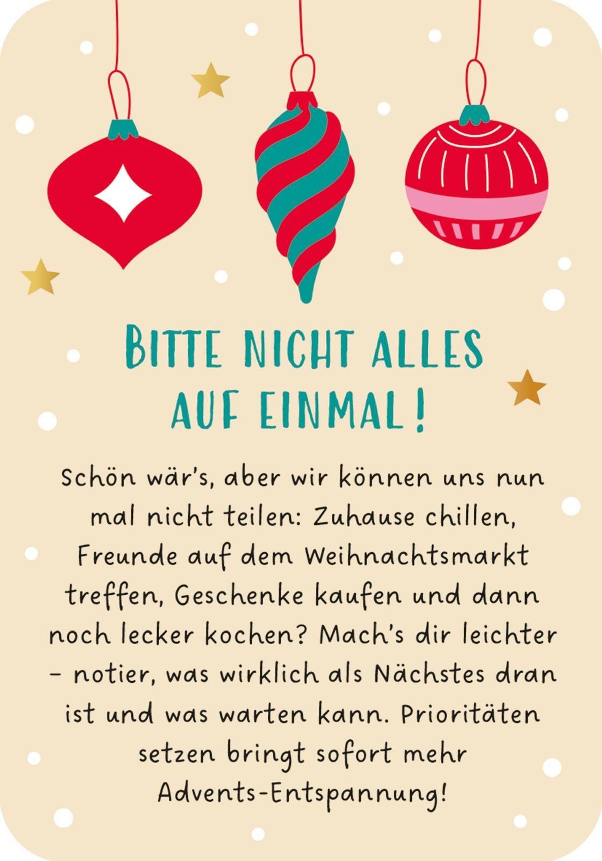 - **Achtsamkeit mit Augenzwinkern:**24 Karten mit humorvollen Sprüchen, witzigen Impulsen und entspannenden Mini-Übungen - für mehr Leichtigkeit im Advent