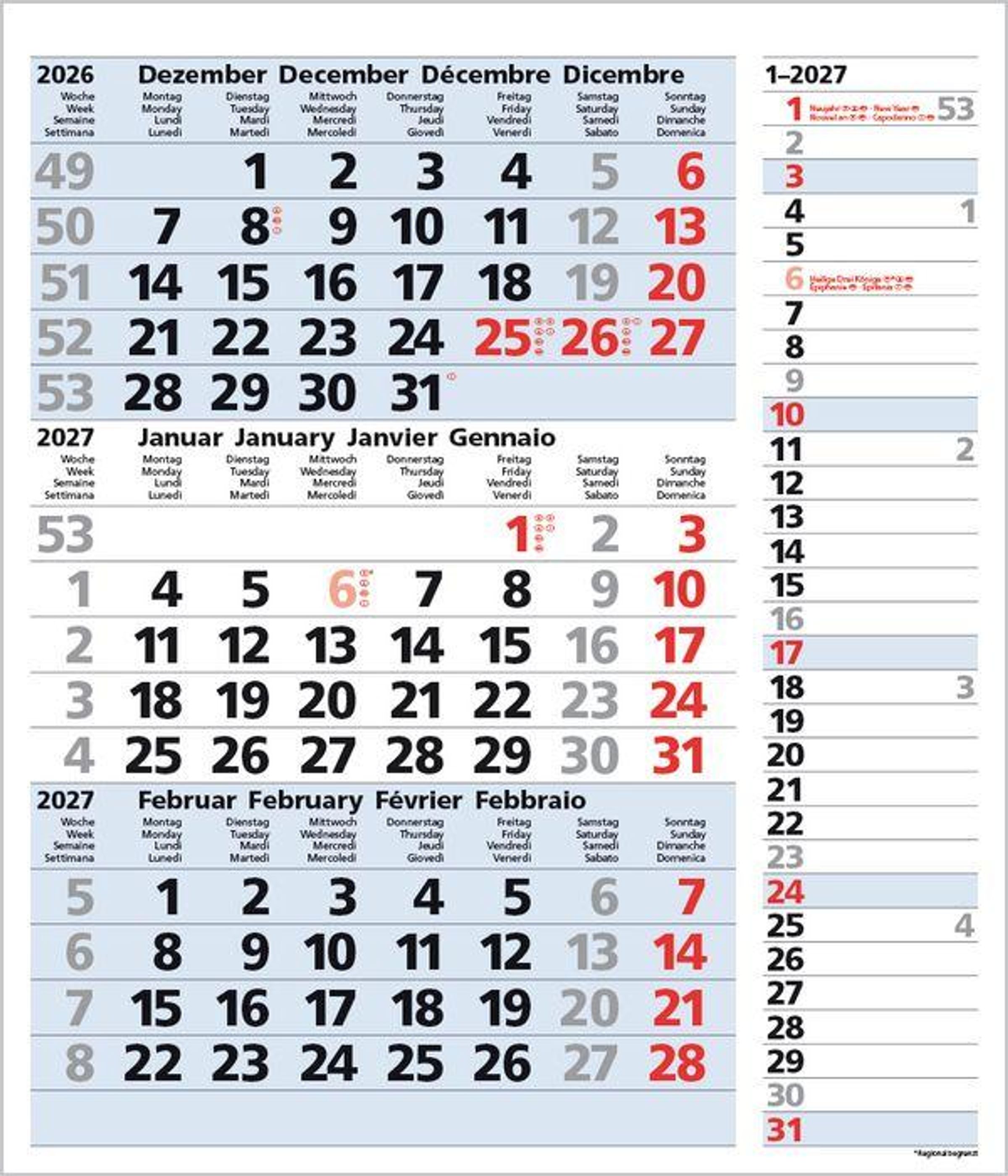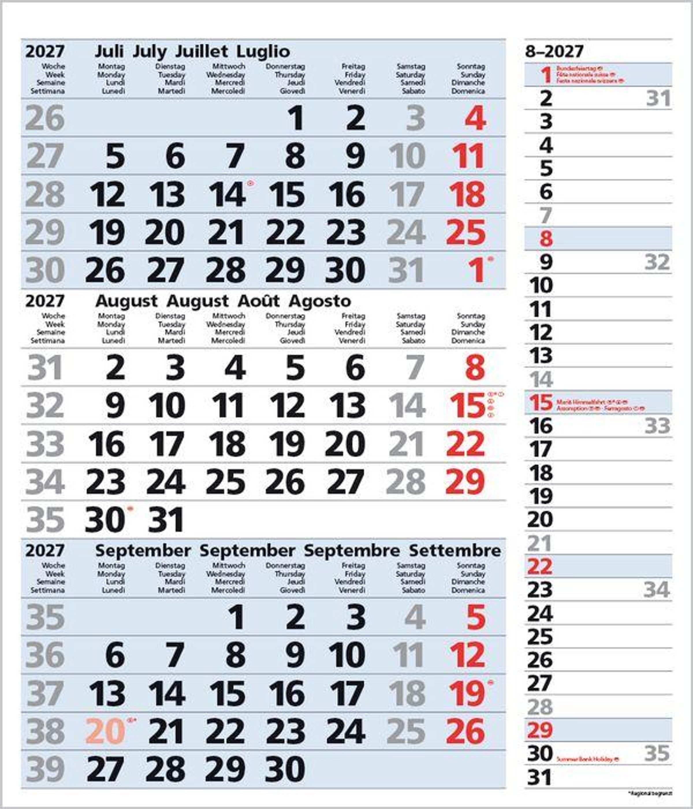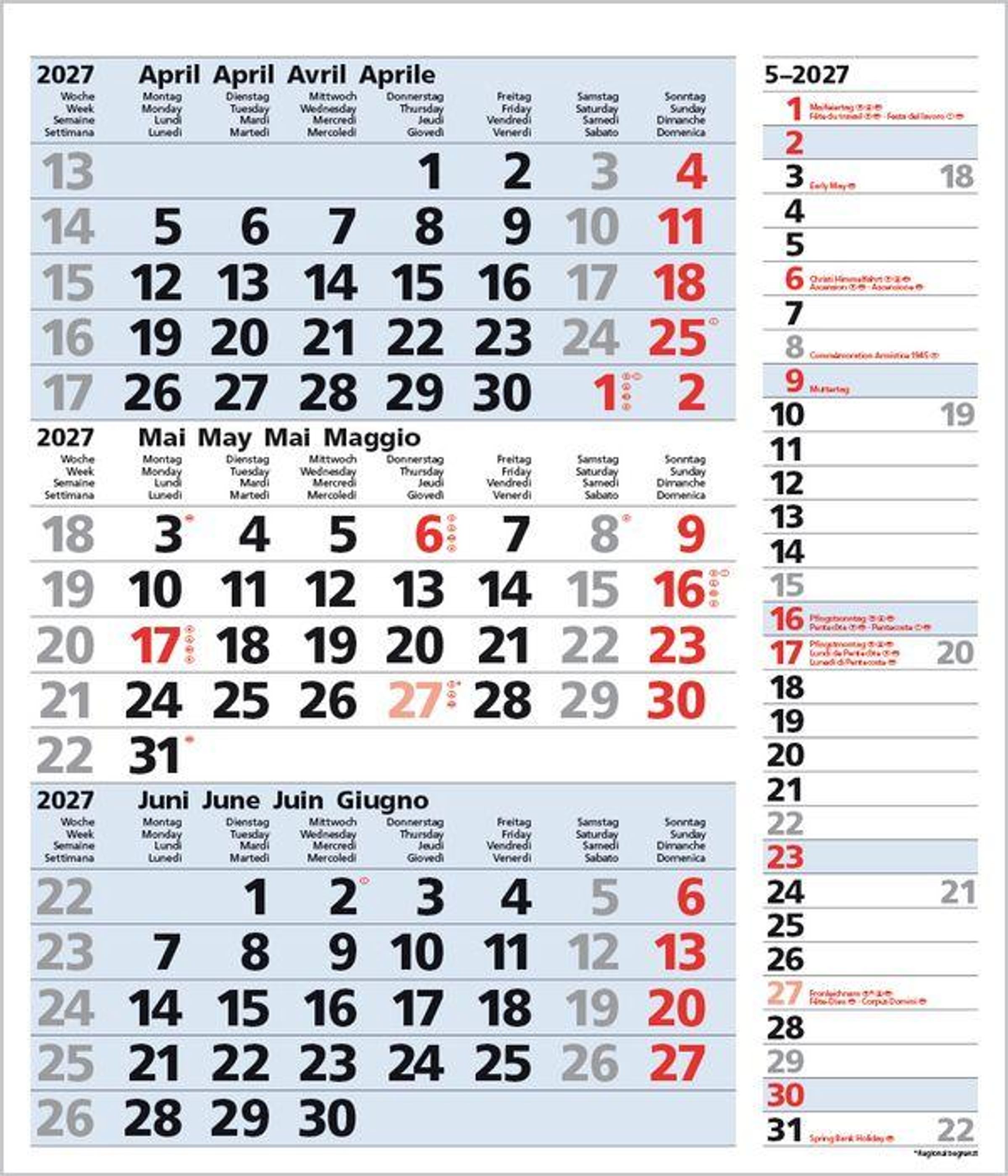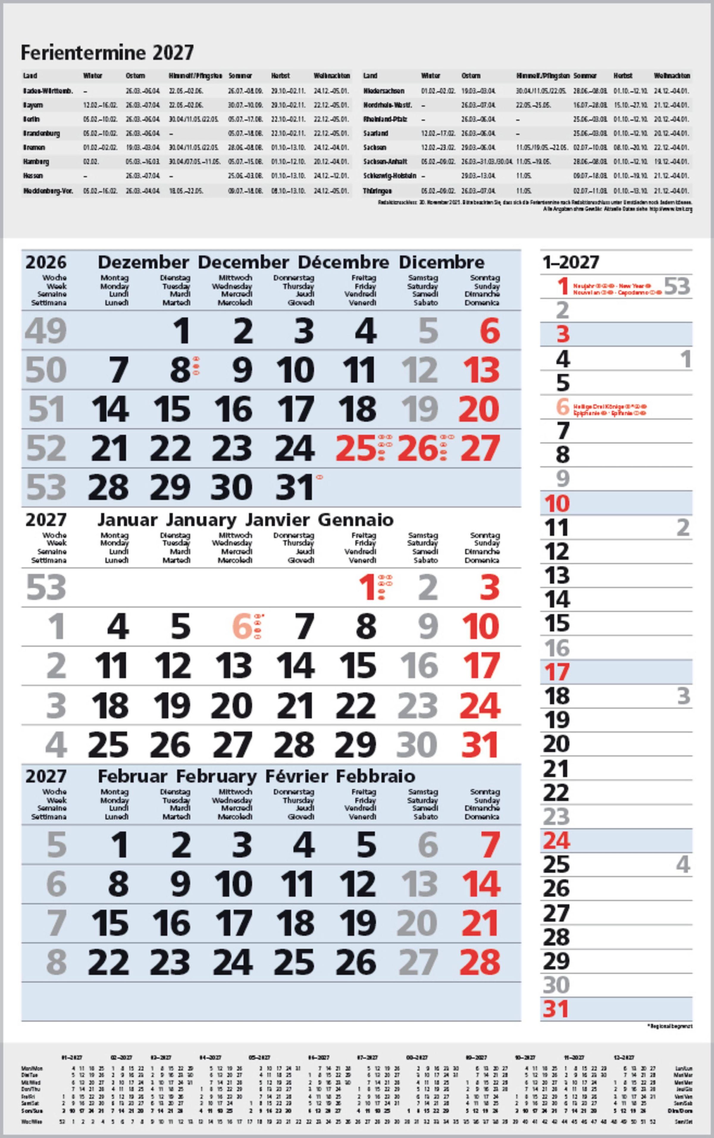 - Kalendarium auf D/E/F/I mit farblich hervorgehobenen Feiertagen für Deutschland, Österreich und Schweiz.