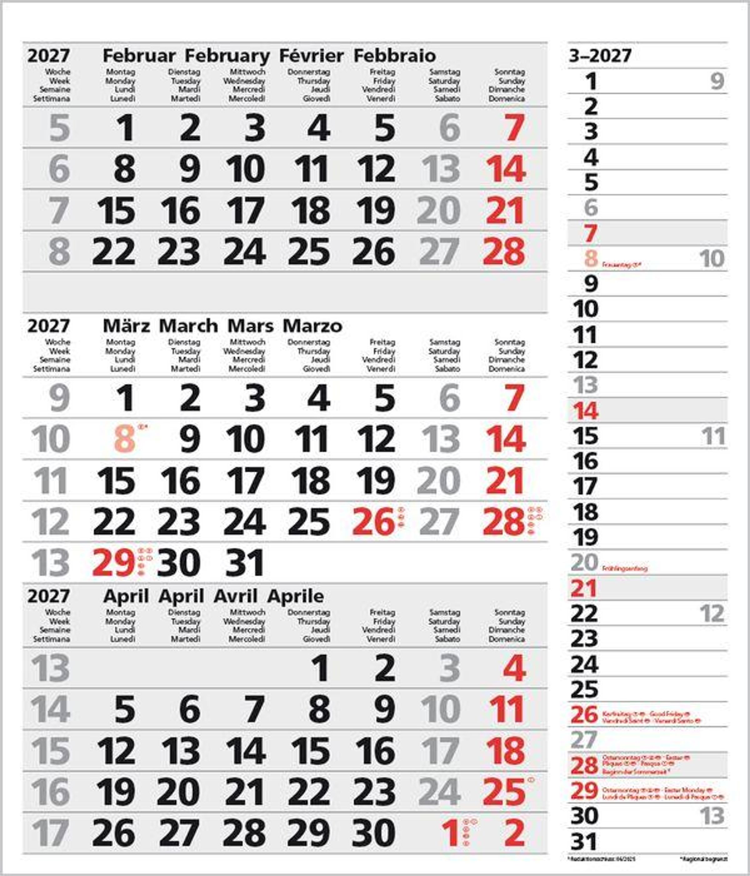 - Kalendarium auf D/E/F/I mit farblich hervorgehobenen Feiertagen für Deutschland, Österreich und Schweiz.