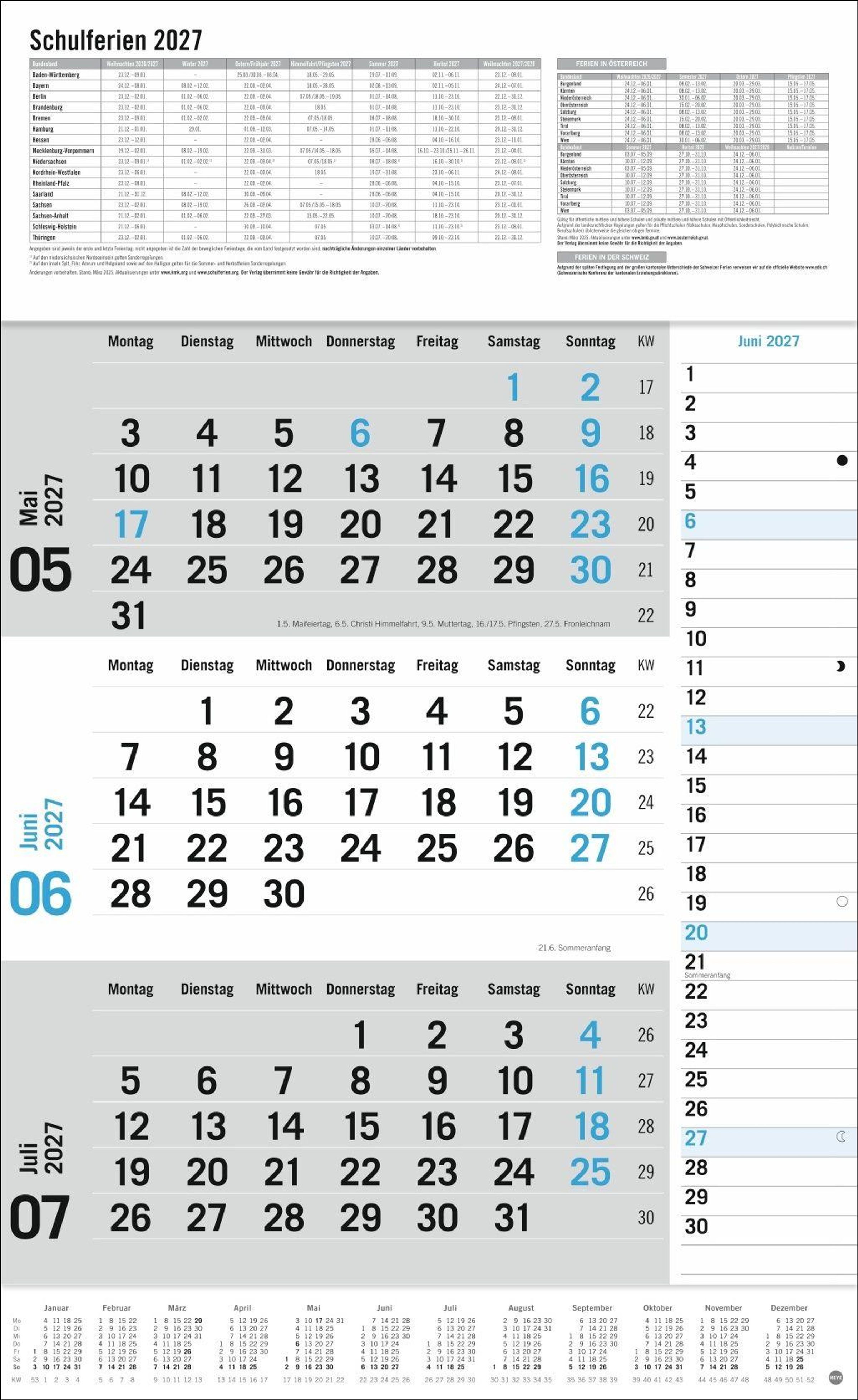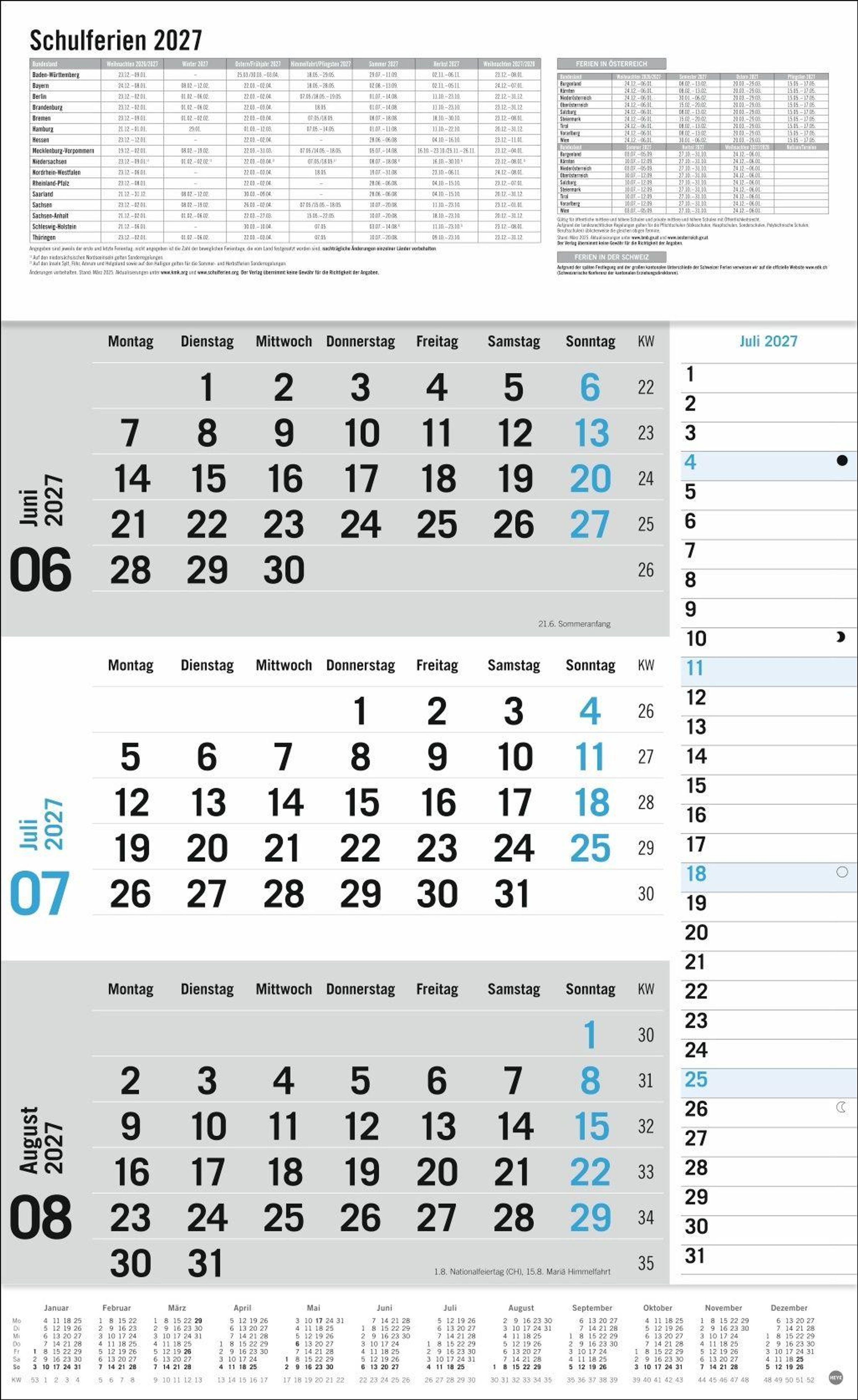 Volle Konzentration auf das Wesentliche: 3-Monats-Kombiplaner mit einer Spalte für Notizen und farblich abgesetzten Wochenenden und Feiertagen