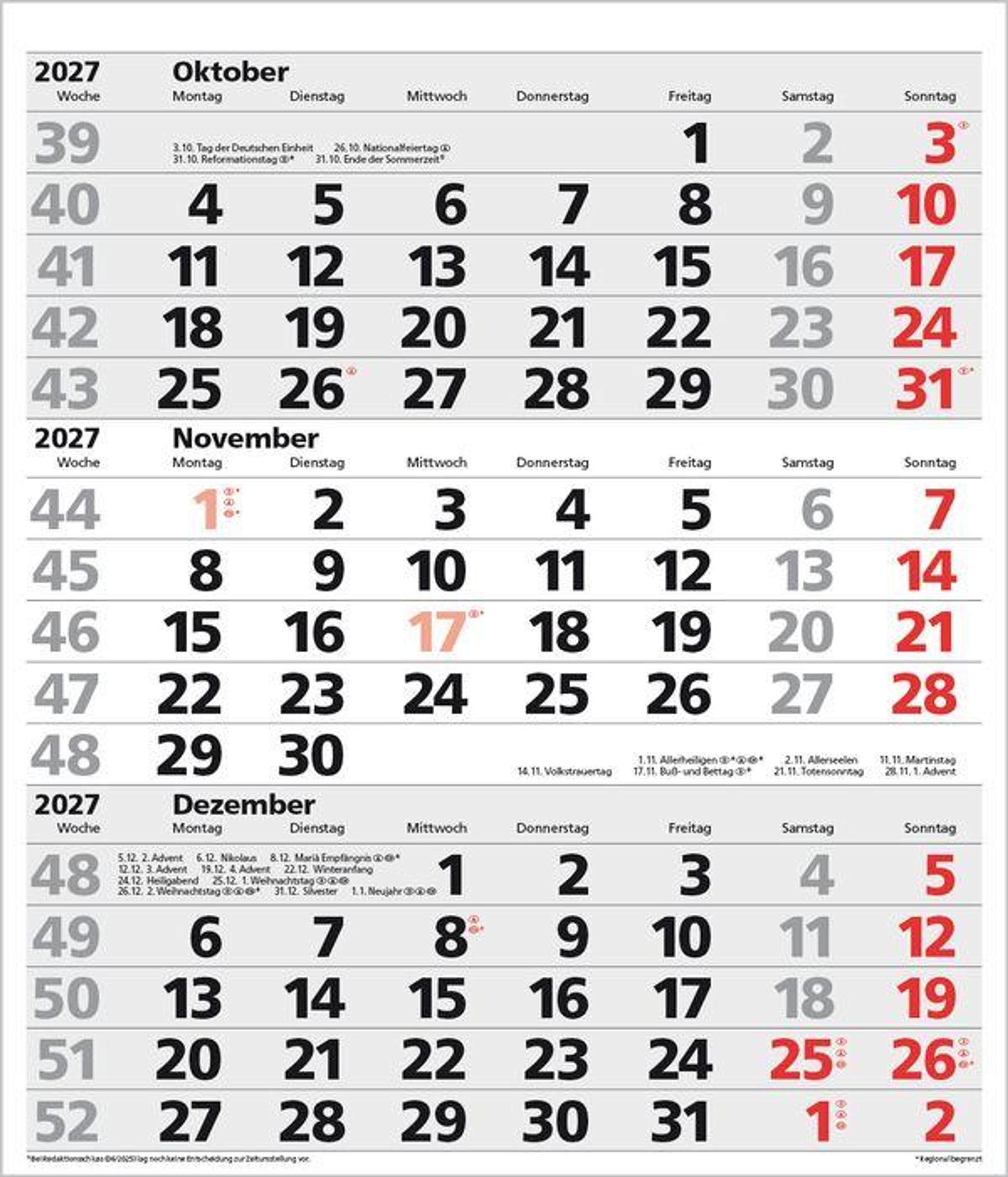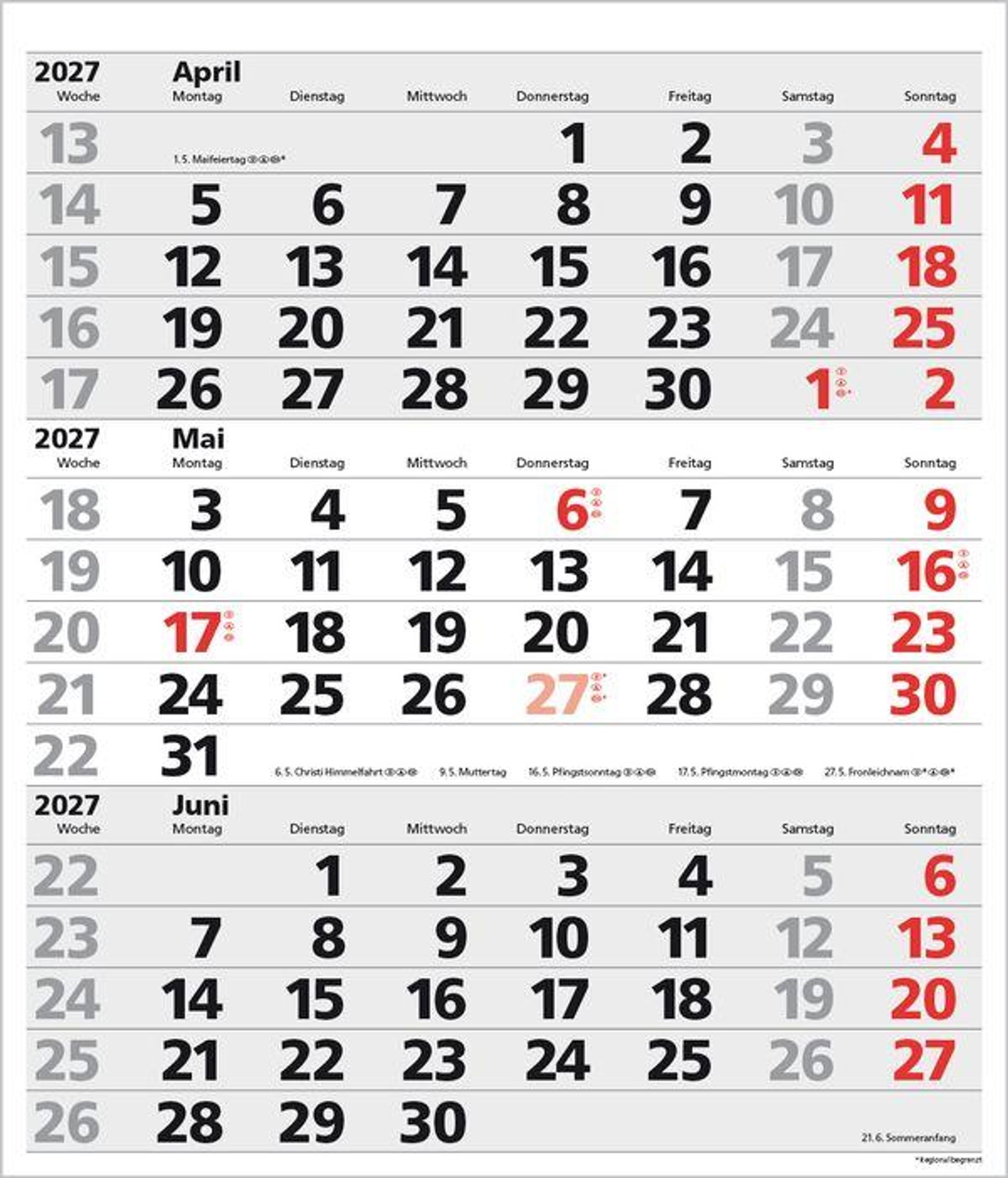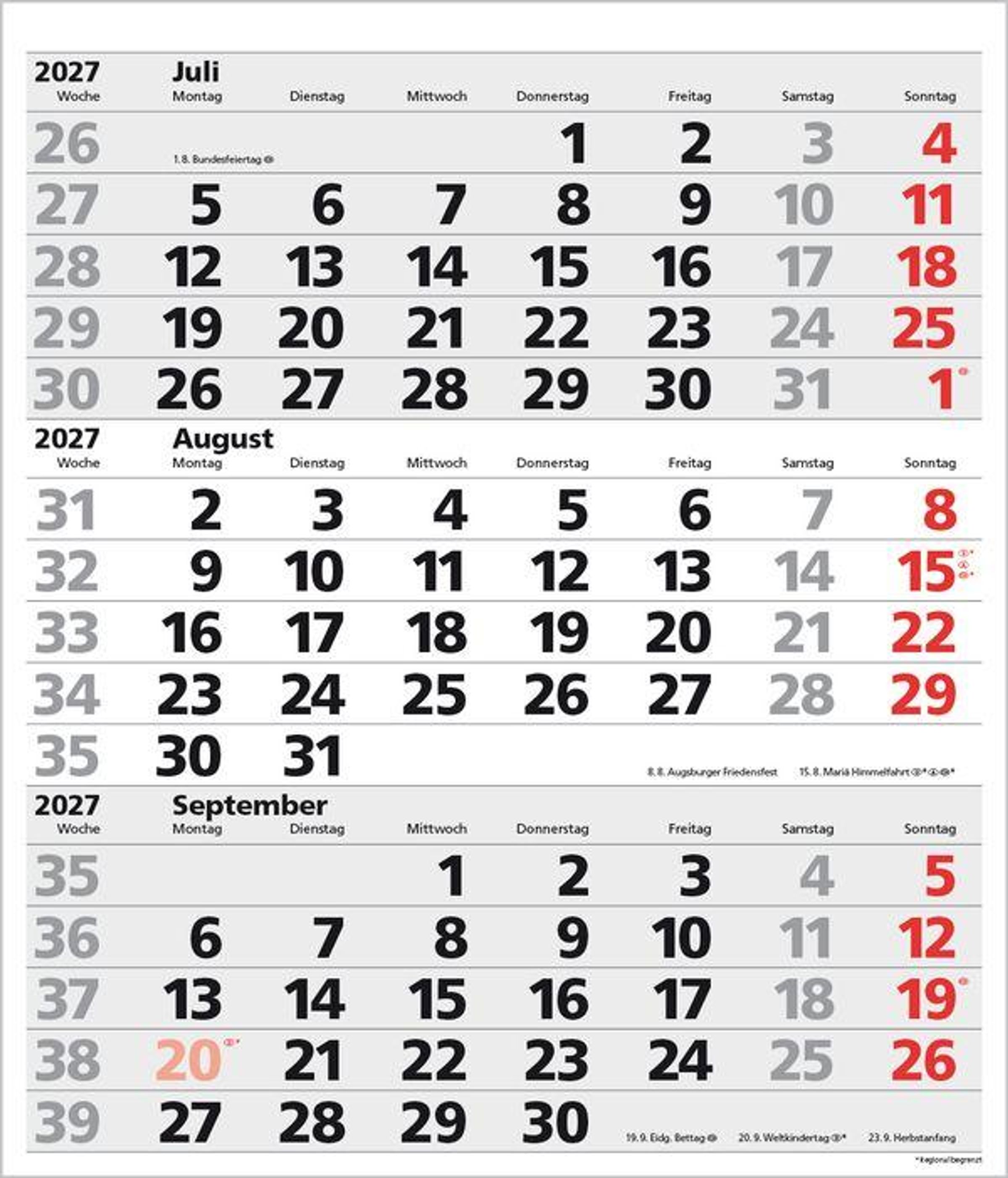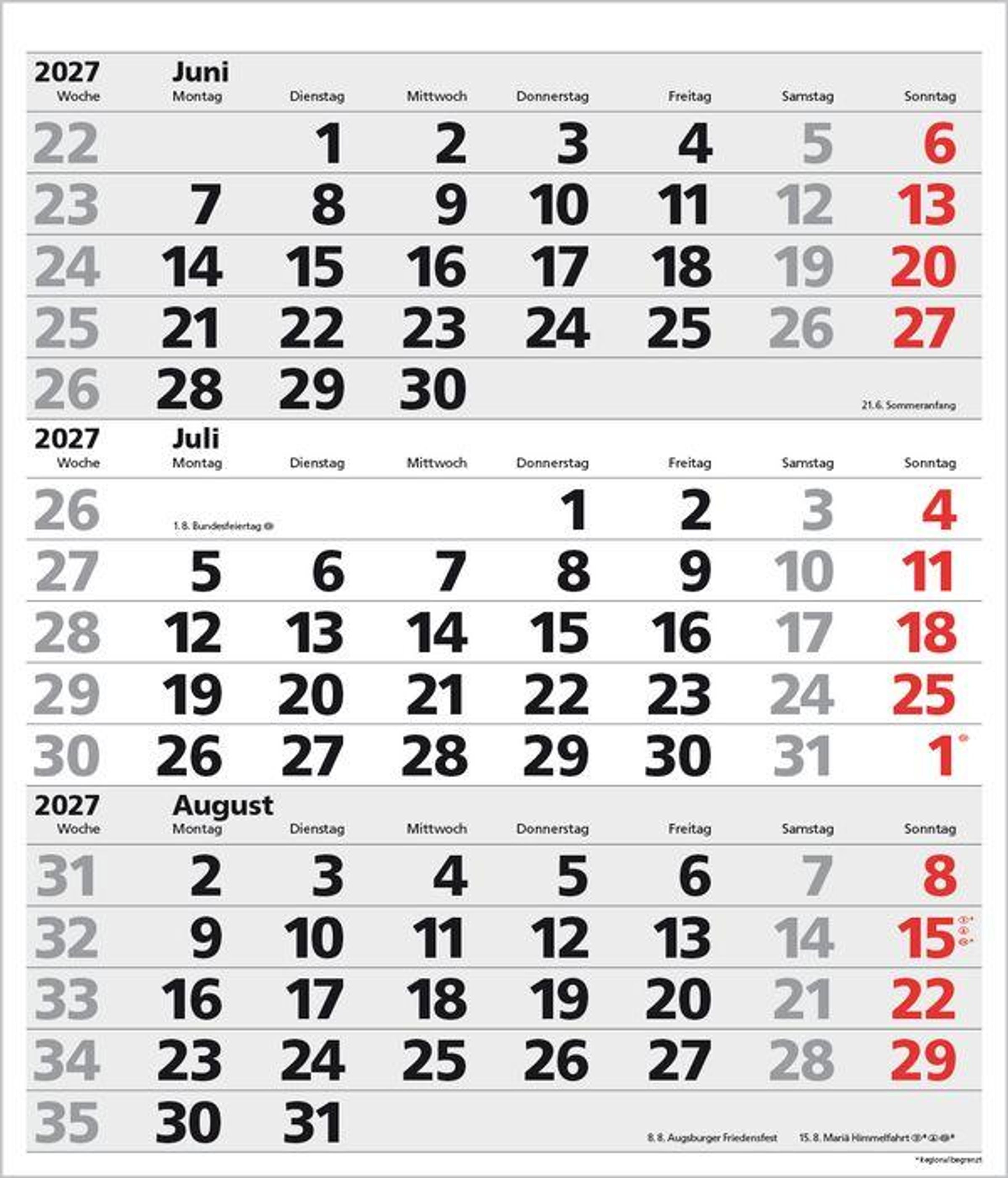 - Kalendarium auf D/E/F/I mit farblich hervorgehobenen Feiertagen für Deutschland, Österreich und Schweiz.