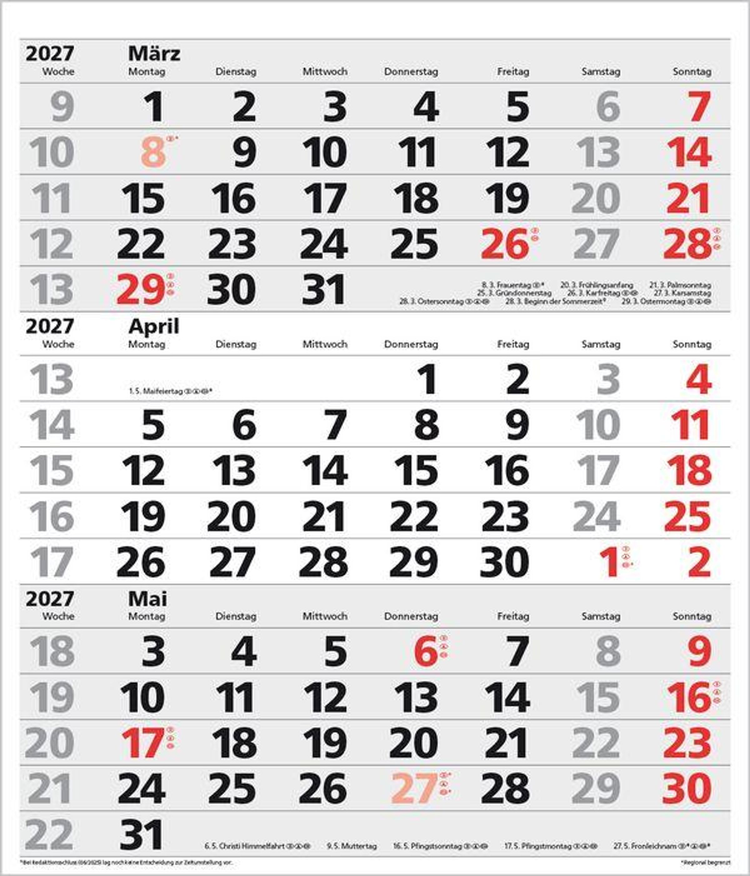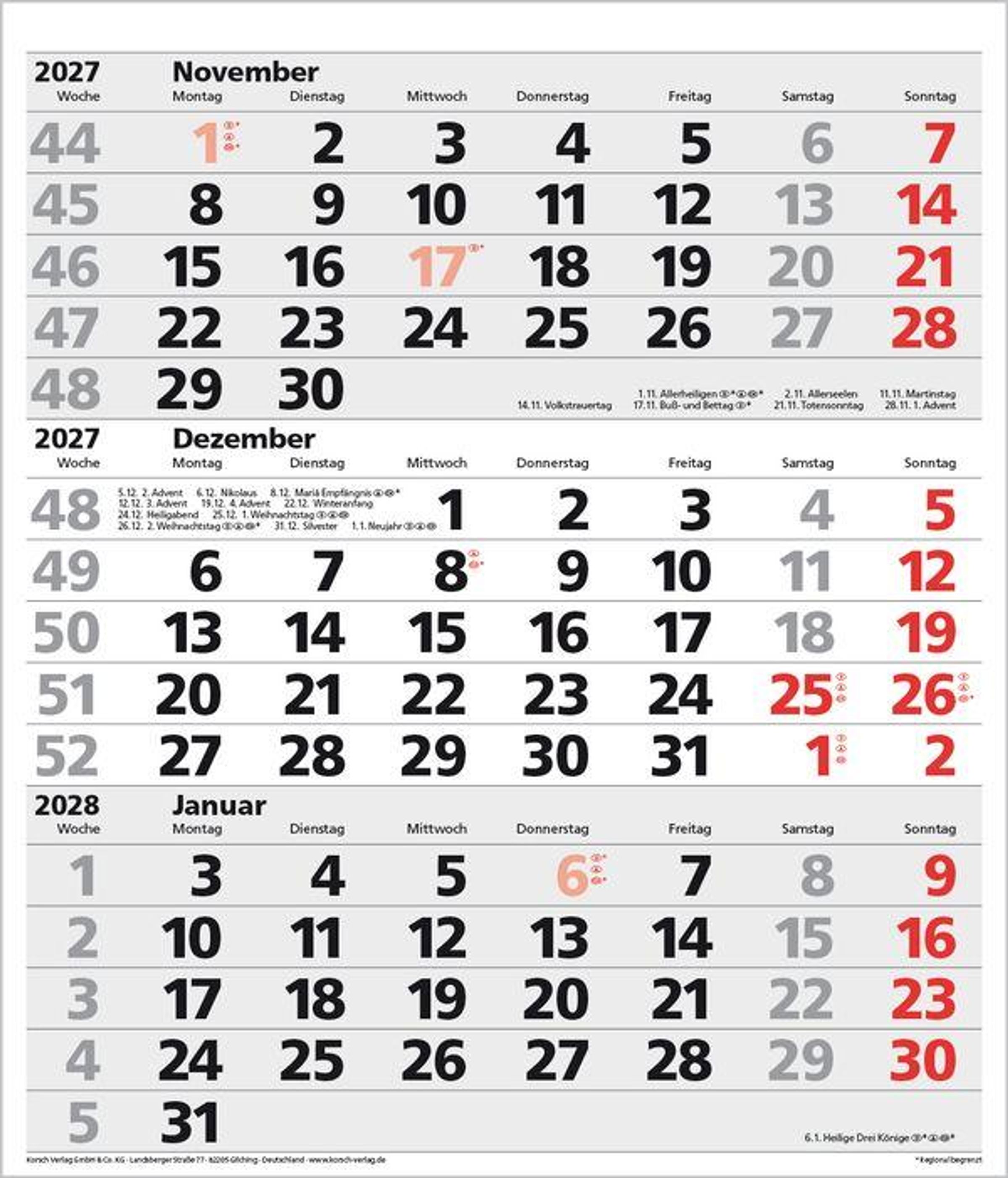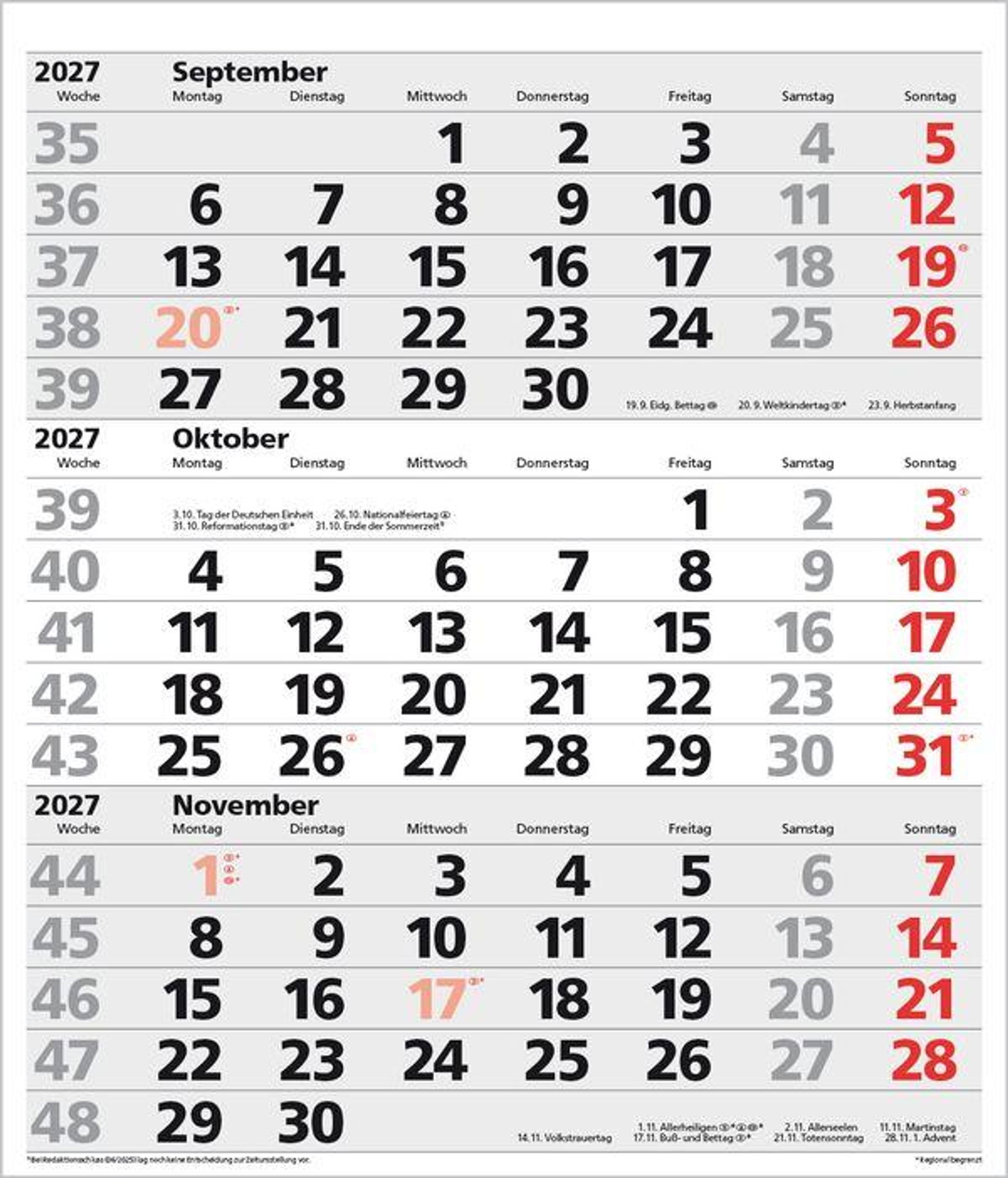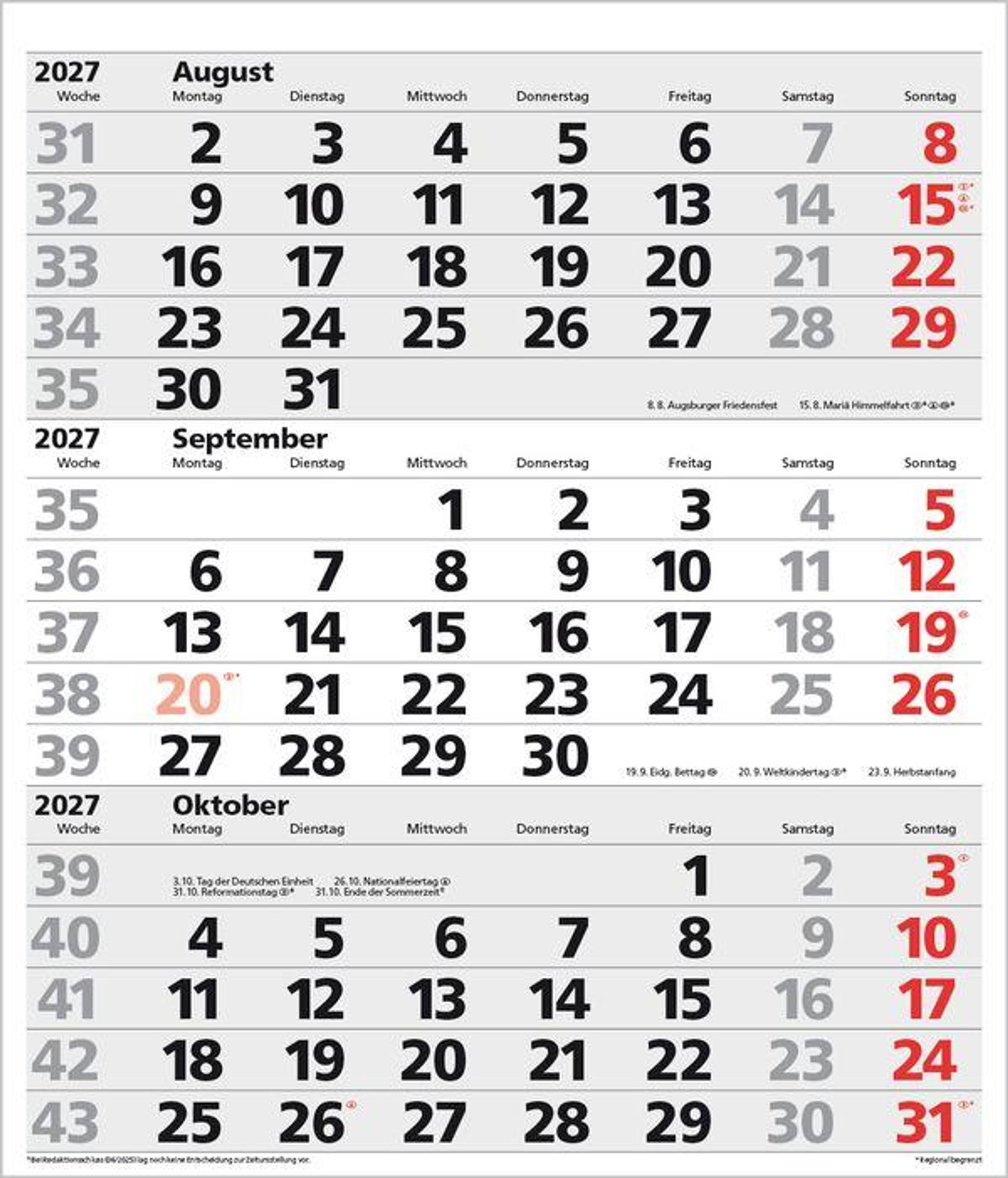 - Kalendarium auf D/E/F/I mit farblich hervorgehobenen Feiertagen für Deutschland, Österreich und Schweiz.