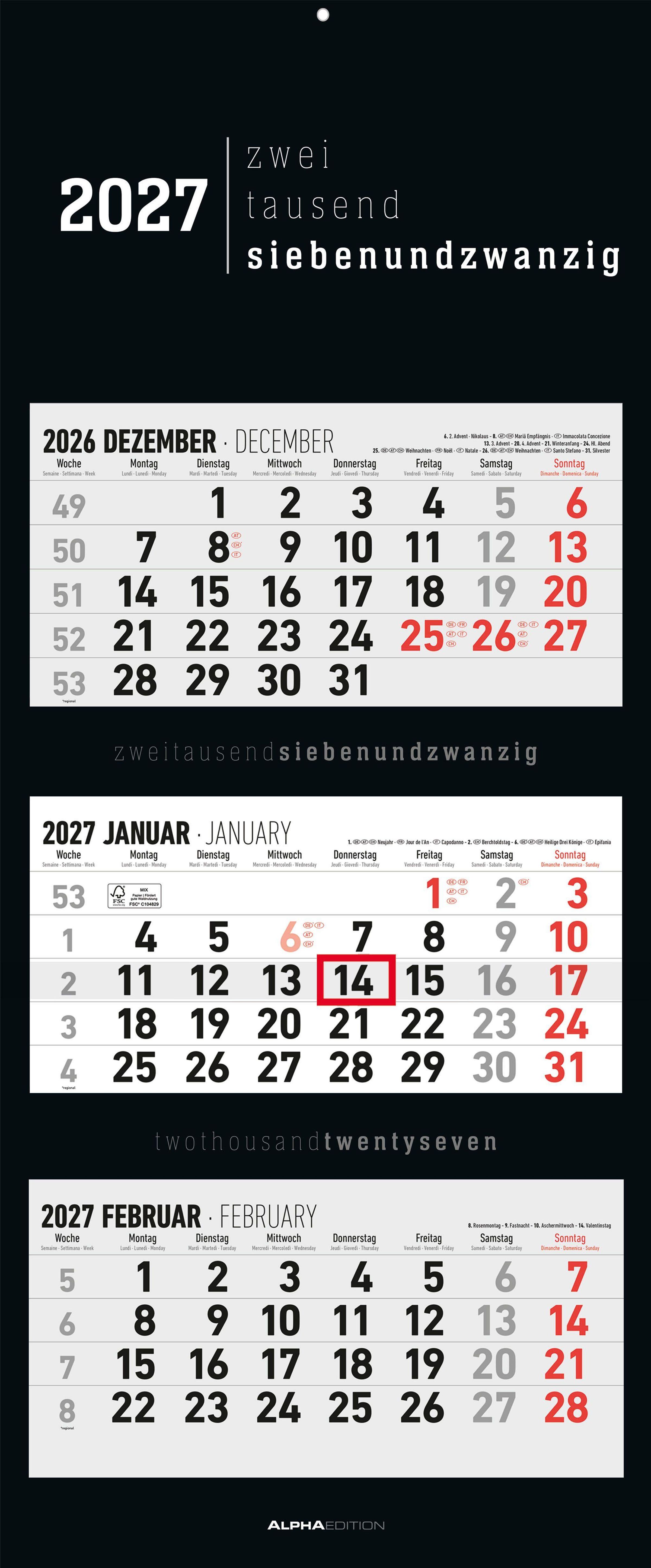 Mit dem Alpha Edition 3-Monatskalender Black 2027 behalten Sie Ihre Termine stilvoll im Blick -- zuverlässig, übersichtlich und ideal für jede Arbeitsumgebung.