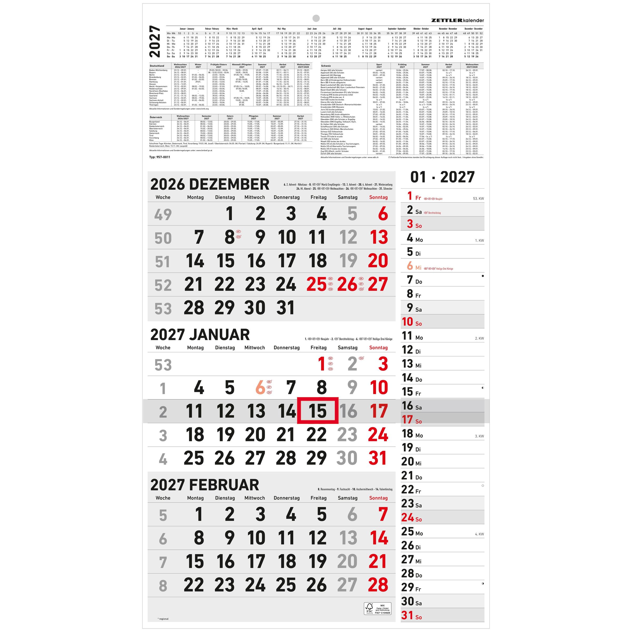 Mit dem Zettler 3-Monatskalender Kombi 2027 behalten Sie nicht nur drei Monate gleichzeitig im Blick, sondern haben auch Platz für persönliche Eintragungen -- praktisch, übersichtlich und vielseitig.