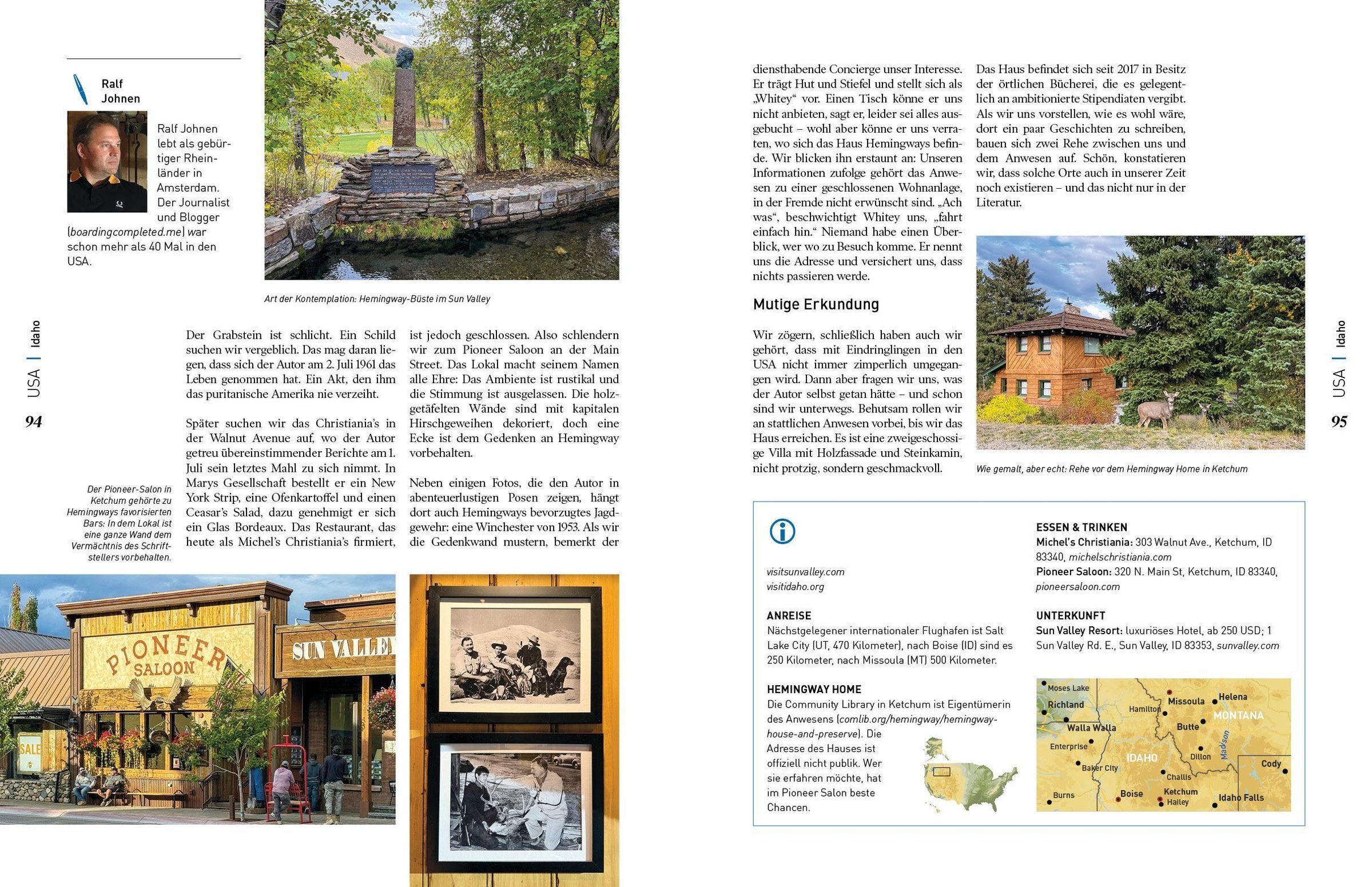 Dass man Nordamerika auch auf zwei nicht motorisierten Rädern genießen kann, zeigt Reinhard Pantke im zweiten Teil seine Reportage: Jetzt nimmt er uns mit auf die Etappe zwischen Whitehorse im Yukon Territory und Anchorage in Alaska. Virginias Vielfalt lässt sich gut in Norfolk und Virginia Beach erleben: zwischen der bekannten, weitläufigen Marinebasis und Delfinen bei einer Kajaktour. Zwei Bundesstaaten weiter, in South Carolina, erwarten drei unterschätzte Schönheiten die Urlauber: die Hauptstadt Columbia, das nahe Camden mit Kleinstadtflair und Historie sowie der Congaree National Park. Mount Rushmore ist eine der ganz großen Attraktionen des Landes. Doch es gibt in South Dakota noch weitere "Gesichter im Fels" wie Sandra Wickert berichtet. In Idaho wiederum war Ralf Johnen unterwegs zum letzten Wohnort von Ernest Hemingway. Und aus Los Angeles hat Christian Dose sieben Empfehlungen mitgebracht - passend dazu, dass die "Stadt der Engel" dieses Jahr bei der Fußball-WM und 2028 bei den Olympischen Spielen im Fokus steht.