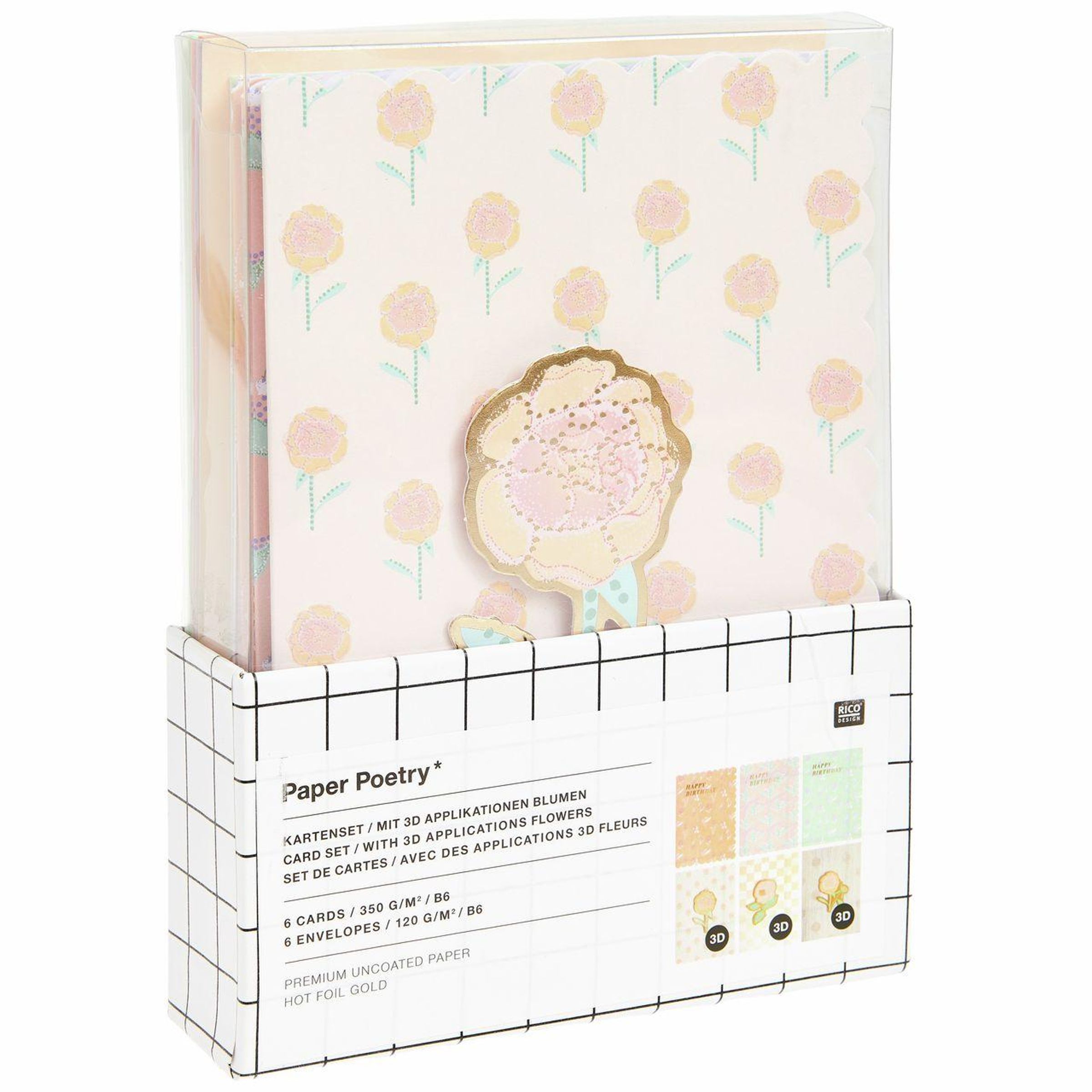 Das 3D-Kartenset "Blumen, Pastell" umfasst sechs Klappkarten im Format B6. Enthalten sind drei Karten mit Wellenrand sowie drei Karten mit 3D-Effekt. Zusätzlich gehören sechs passende Umschläge zum Set. Schrift und Motive sind mit Hot Foil Gold verziert und verleihen den Karten eine elegante, hochwertige Ausstrahlung. Die Karten eignen sich für persönliche Grüße, Einladungen oder besondere Anlässe.