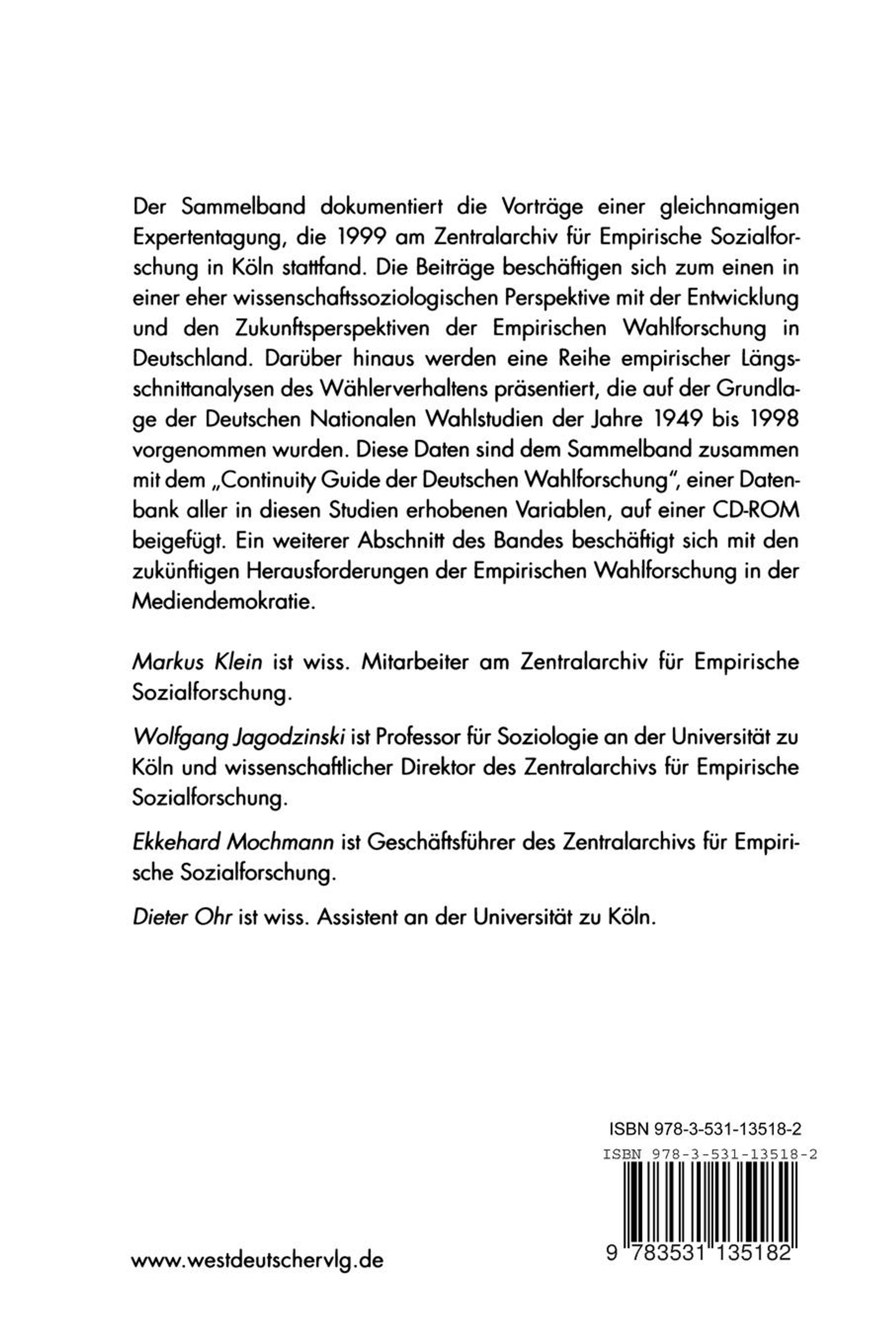 Einführung.- I. Die Entwicklung der Empirischen Wahlforschung in Deutschland.- Entwicklung und Stand der Empirischen Wahlforschung in Deutschland.- Die Kölner Wahlstudie zur Bundestagswahl 1961.- Der Beitrag der Wahlforschung zur Methodenentwicklung in der empirischen Sozialforschung.- II. Parteienwettbewerb und Parteiensystem in Deutschland.- Zur Theorie des Parteienwettbewerbs.- Die Entwicklung des deutschen Parteiensystems: eine quantitative Analyse.- III. Empirische Analysen des Wählerverhaltens in Deutschland.- Gruppenbindungen und Wahlverhalten: 50 Jahre Wahlen in der Bundesrepublik Deutschland.- Religion und Wahlverhalten in der längsschnittlichen Entwicklung.- Wählen im sozialen Kontext: Mehrebenenanalysen des Wählerverhaltens bei den Bundestagswahlen der Jahre 1969 bis 1998.- Lebensstile, soziale Milieus und Wahlverhalten in Westdeutschland.- Dreißig Jahre danach: Zur Validierung des Konzepts , Parteiidentifikation in der Bundesrepublik.- Wird das Wählerverhalten zunehmend personalisierter, oder: Ist jede Wahl anders? Kandidatenorientierungen und Wahlentscheidung in Deutschland von 1961 bis 1998.- Konjunkturentwicklung, Wahrnehmungen der Wirtschaftslage und Parteipräferenzen in Deutschland, 1977-1998.- Instrumentelles oder expressives Wählen? Zur Bedeutung des Rational-Choice-Ansatzes in der Empirischen Wahlforschung.- Stimmensplitting bei Bundestagswahlen ein Spiegelbild des Verhältnisses zwischen Bürgern und Parteien?.- Soll und Haben: Die deutsche Wählerschaft rechnet mit den Parteien ab.- IV. Parteien, Wähler und Wahlforschung in der Mediendemokratie.- Wählerverhalten in der Mediendemokratie.- Der Zwei-Stufen-Fluß der Massenkommunikation: Anmerkungen zu einer nie bewiesenen und längst überholten These der Wahlforschung.- Wahlkampf in der Mediendemokratie: Die Kampagne der SPD 1997 / 98.- Demoskopie im Wahlkampf Leitstern oder Irrlicht?.- Postmoderne Wahlkampftechnologien: Direct Mailing als neue Form direkter Kommunikation zwischen Parteien und Wählern.- V. Zukunftsperspektiven der Empirischen Wahlforschung in Deutschland.- Die Deutsche Nationale Wahlstudie eher kollektive Aufgabe als aktuelle Realität.- Politische Einstellungen, politische Partizipation und Wählerverhalten im vereinigten Deutschland: Die Deutsche Nationale Wahlstudie 1998.- Methodische Entwicklungen in der Empirischen Wahlforschung.- VI. Die Deutschen Nationalen Wahlstudien und der Continuity Guide der Deutschen Wahlforschung.- Nationale Wahlstudien als Datenschwerpunkt im Zentralarchiv für empirische Sozialforschung.- Der Continuity Guide der deutschen Wahlforschung und der ZA CodebookExplorer.- Verzeichnis der Autorinnen und Autoren.