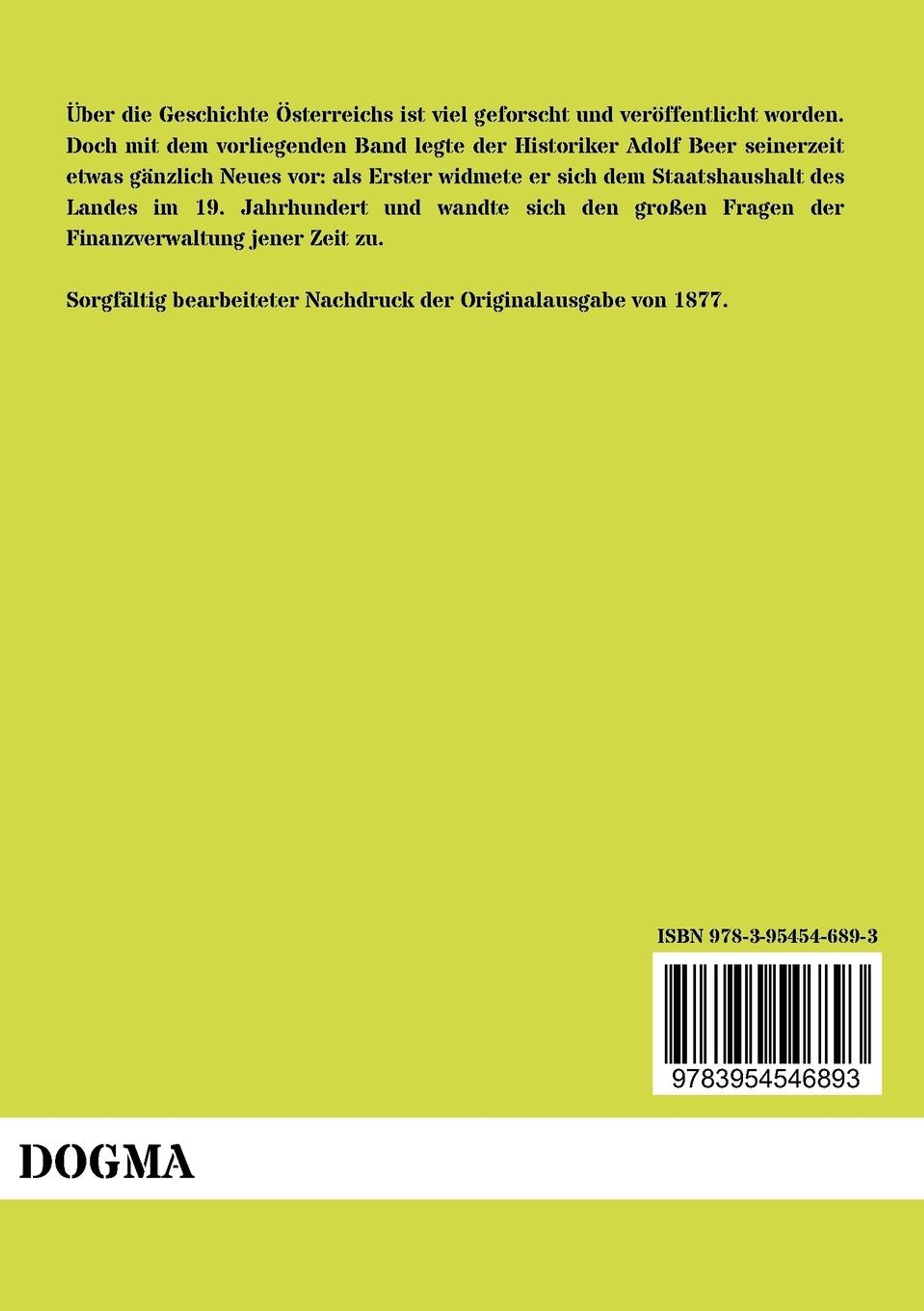 Über die Geschichte Österreichs ist viel geforscht und veröffentlicht worden. Doch mit dem vorliegenden Band legte der Historiker Adolf Beer seinerzeit etwas gänzlich Neues vor: als Erster widmete er sich dem Staatshaushalt des Landes im 19. Jahrhundert und wandte sich den großen Fragen der Finanzverwaltung jener Zeit zu.