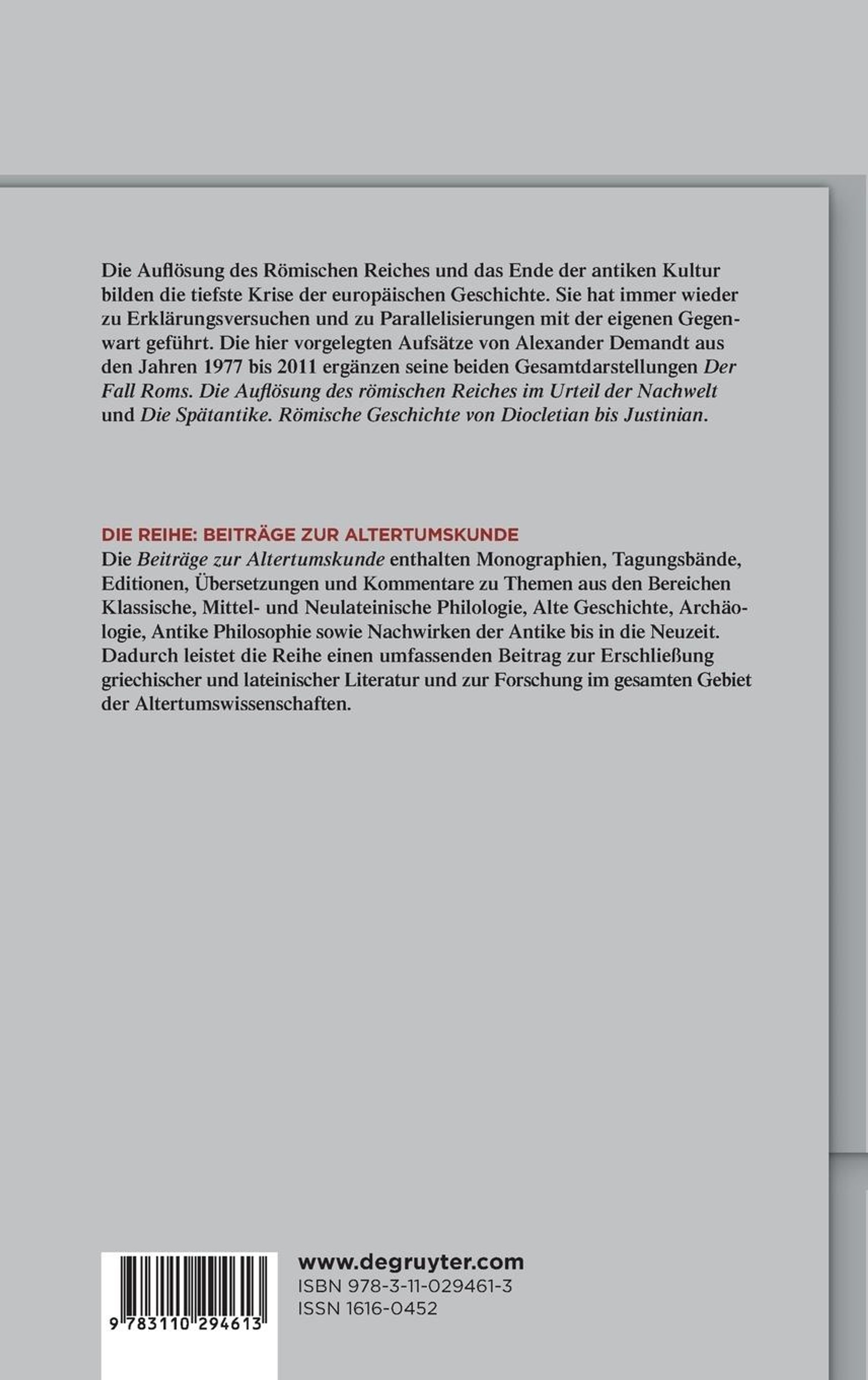 Die Auflösung des Römischen Reiches und das Ende der antiken Kulturbilden die tiefste Krise der europäischen Geschichte. Sie hat immer wieder zu Erklärungsversuchen und zu Parallelisierungen mit der eigenen Gegenwart geführt. Die hier vorgelegten Aufsätze von Alexander Demandt aus den Jahren 1977 bis 2011 ergänzen seine beiden Gesamtdarstellungen Der Fall Roms. Die Auflösung des römischen Reiches im Urteil der Nachwelt und Die Spätantike. Römische Geschichte von Diocletian bis Justinian.