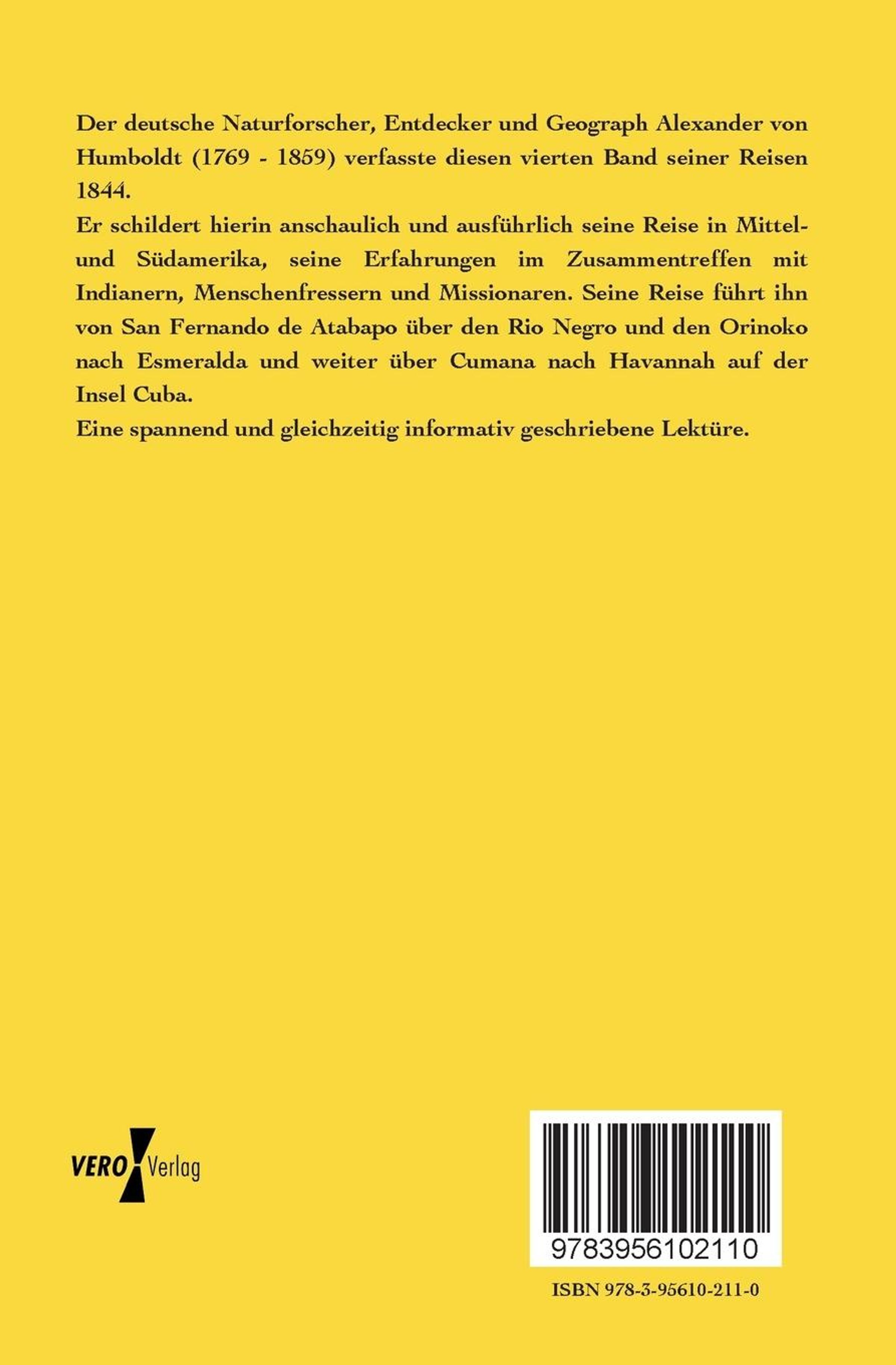 Der deutsche Naturforscher, Entdecker und Geograph Alexander von Humboldt (1769 - 1859) verfasste diesen vierten Band seiner Reisen 1844. Er schildert hierin anschaulich und ausführlich seine Reise in Mittel- und Südamerika, seine Erfahrungen im Zusammentreffen mit Indianern, Menschenfressern und Missionaren. Seine Reise führt ihn von San Fernando de Atabapo über den Rio Negro und den Orinoko nach Esmeralda und weiter über Cumana nach Havannah auf der Insel Cuba. Eine spannend und gleichzeitig informativ geschriebene Lektüre.