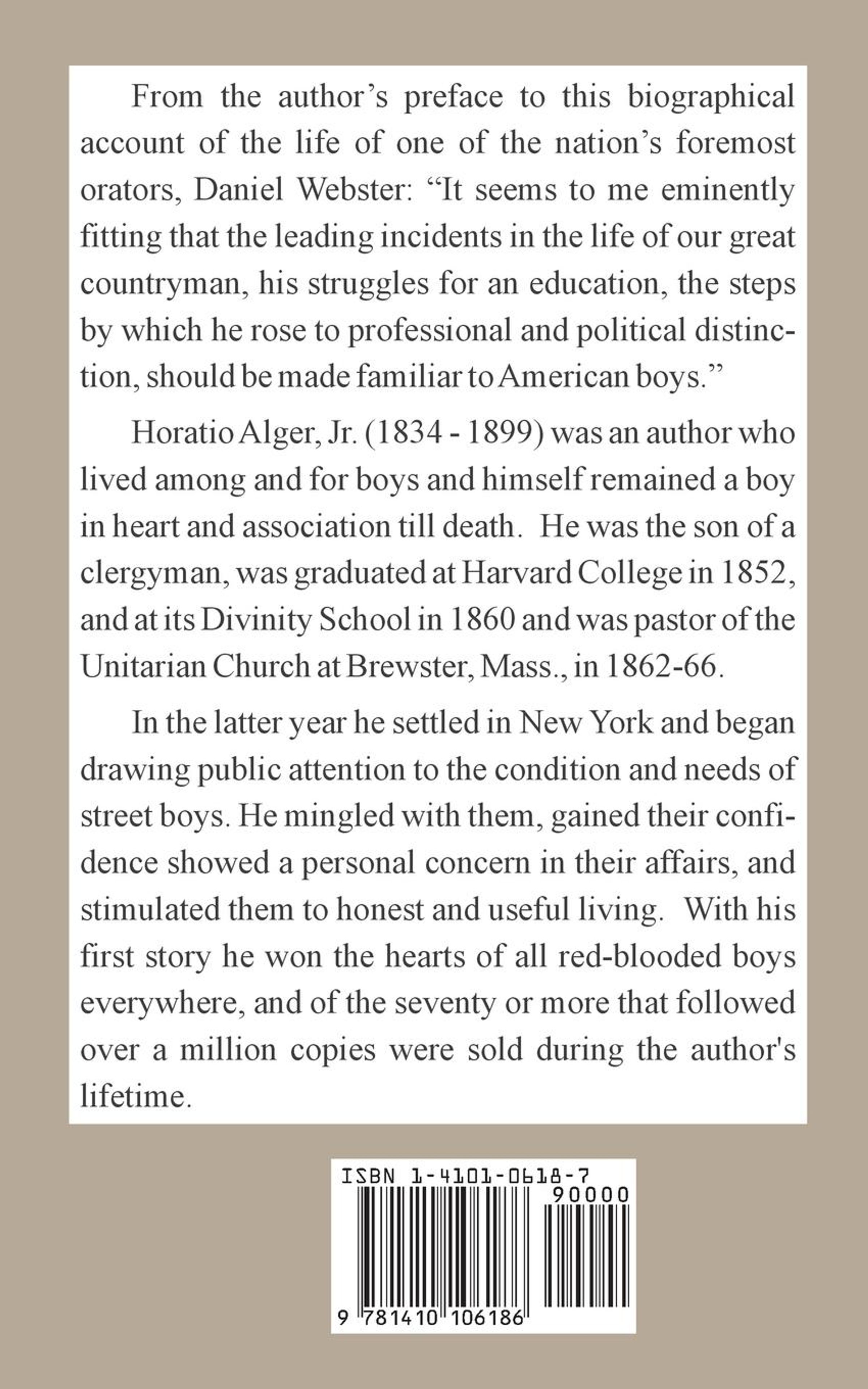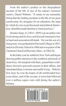 From the author's preface to this biographical account of the life of one of the nation's foremost orators, Daniel Webster: "It seems to me eminently fitting that the leading incidents in the life of our great countryman, his struggles for an education, the steps by which he rose to professional and political distinction, should be made familiar to American boys." Horatio Alger, Jr. (1834 - 1899) was an author who lived among and for boys and himself remained a boy in heart and association till death. He was the son of a clergyman, was graduated at Harvard College in 1852, and at its Divinity School in 1860 and was pastor of the Unitarian Church at Brewster, Mass., in 1862-66. In the latter year he settled in New York and began drawing public attention to the condition and needs of street boys. He mingled with them, gained their confidence showed a personal concern in their affairs, and stimulated them to honest and useful living. With his first story he won the hearts of all red-blooded boys everywhere, and of the seventy or more that followed over a million copies were sold during the author's lifetime.