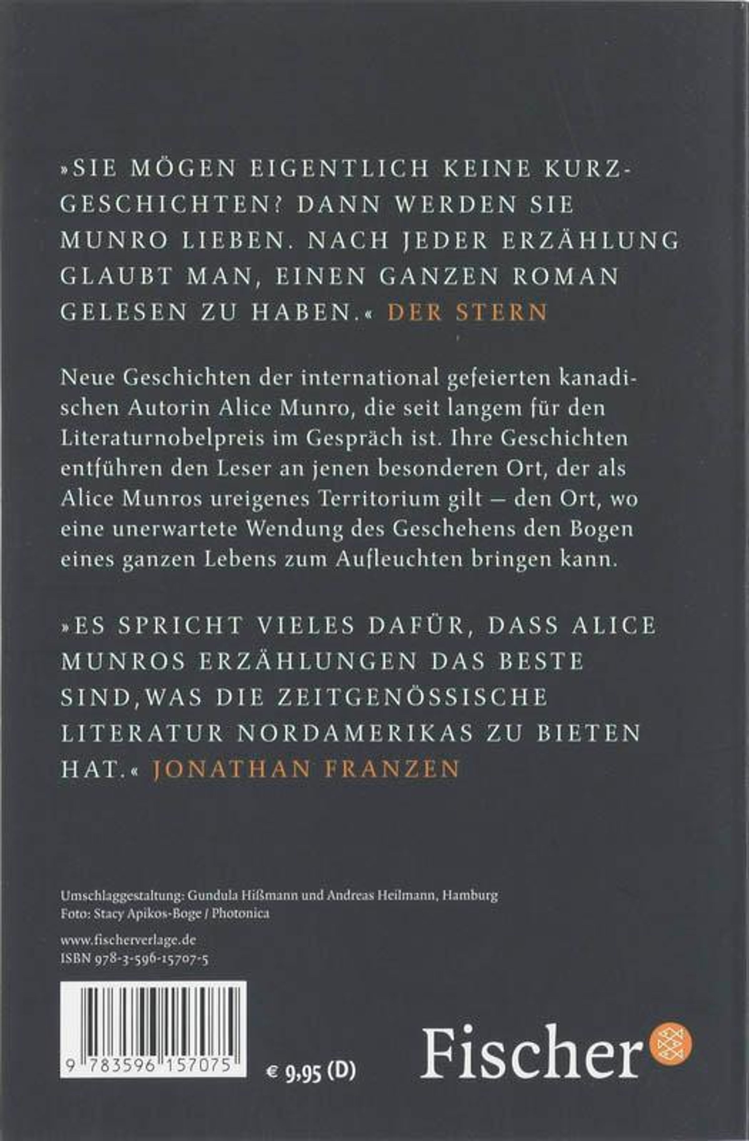 Alice Munro, geb. 1931 in Ontario, gehört zu den bedeutendsten Autorinnen der Gegenwart und gilt seit Jahren als Kandidatin für den Literaturnobelpreis. Mit ihrem umfangreichen erzählerischen Werk sie hat elf Erzählungsbände und einen Roman veröffentlicht ist sie Bestsellerautorin in ihrem Heimatland Kanada und der gesamten angelsächsischen Welt.Anmerkungen: