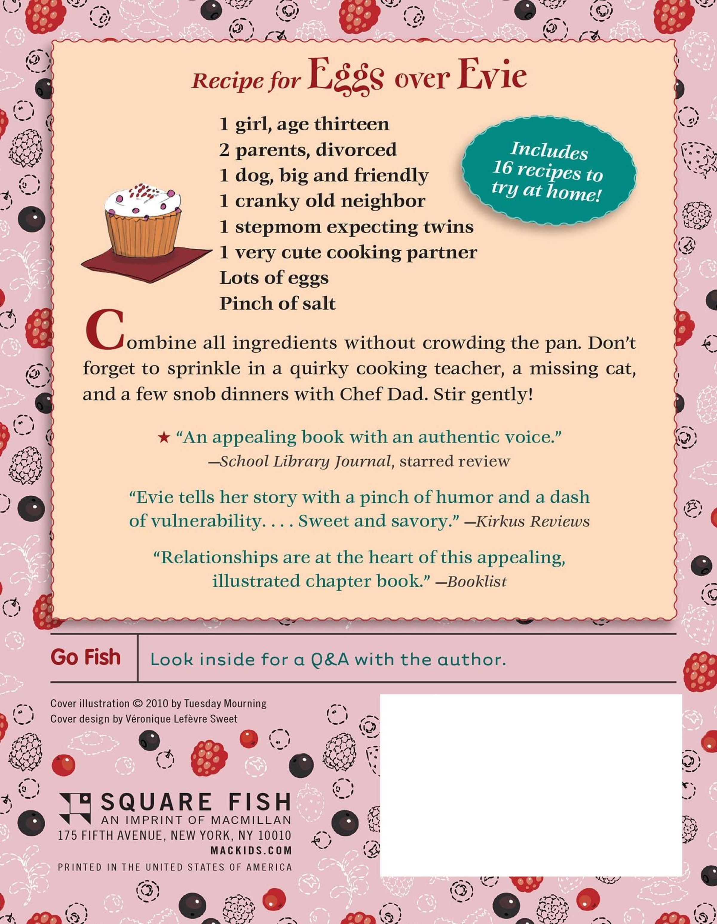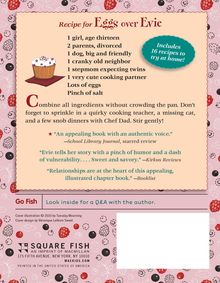 Twelve-year-old Evie Carson lives with her mom. In an apartment across the lake, Evie's celebrity-chef dad is starting a new life with his young second wife, Angie, who's expecting twins. To make matters worse, Evie's dad has custody of the beloved family dog. Navigating her new family situation is difficult, and Evie turns to her love of cooking as a way to stay connected to her father. Through cooking classes, Evie finds an unexpected friend in Corey, whose eccentric aunt Shanti might be able to make everyone a little happier. Evie learns to look outside herself, help others, and make friends where she never thought she could (she also learns to make a pretty darn good soufflé).