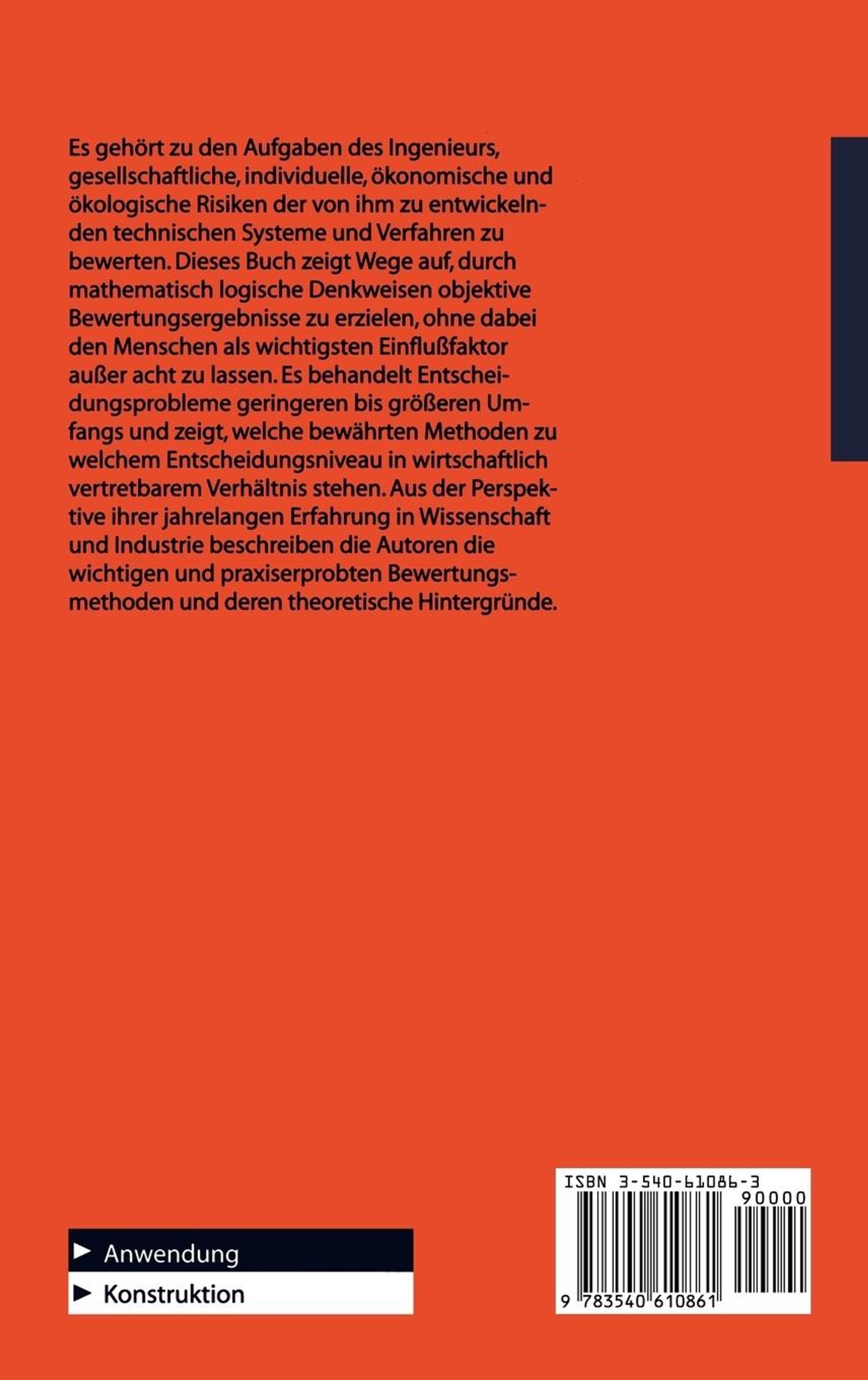 Es gehört zu den Aufgaben des Ingenieurs, gesellschaftliche, individuelle, ökonomische und ökologische Risiken der von ihm zu entwickelnden technischen Systeme und Verfahren zu bewerten. Dieses Buch zeigt Wege auf, durch mathematisch logische Denkweisen objektive Bewertungsergebnisse zu erzielen, ohne dabei den Menschen als wichtigsten Einflußfaktor außer acht zu lassen. Es behandelt Entscheidungsprobleme geringeren bis größeren Umfangs und zeigt, welche bewährten Methoden zu welchem Entscheidungsniveau in wirtschaftlich vertretbarem Verhältnis stehen. Aus der Perspektive ihrer jahrelangen Erfahrung in Wissenschaft und Industrie beschreiben die Autoren die wichtigen und praxiserprobten Bewertungsmethoden und deren theoretische Hintergründe.