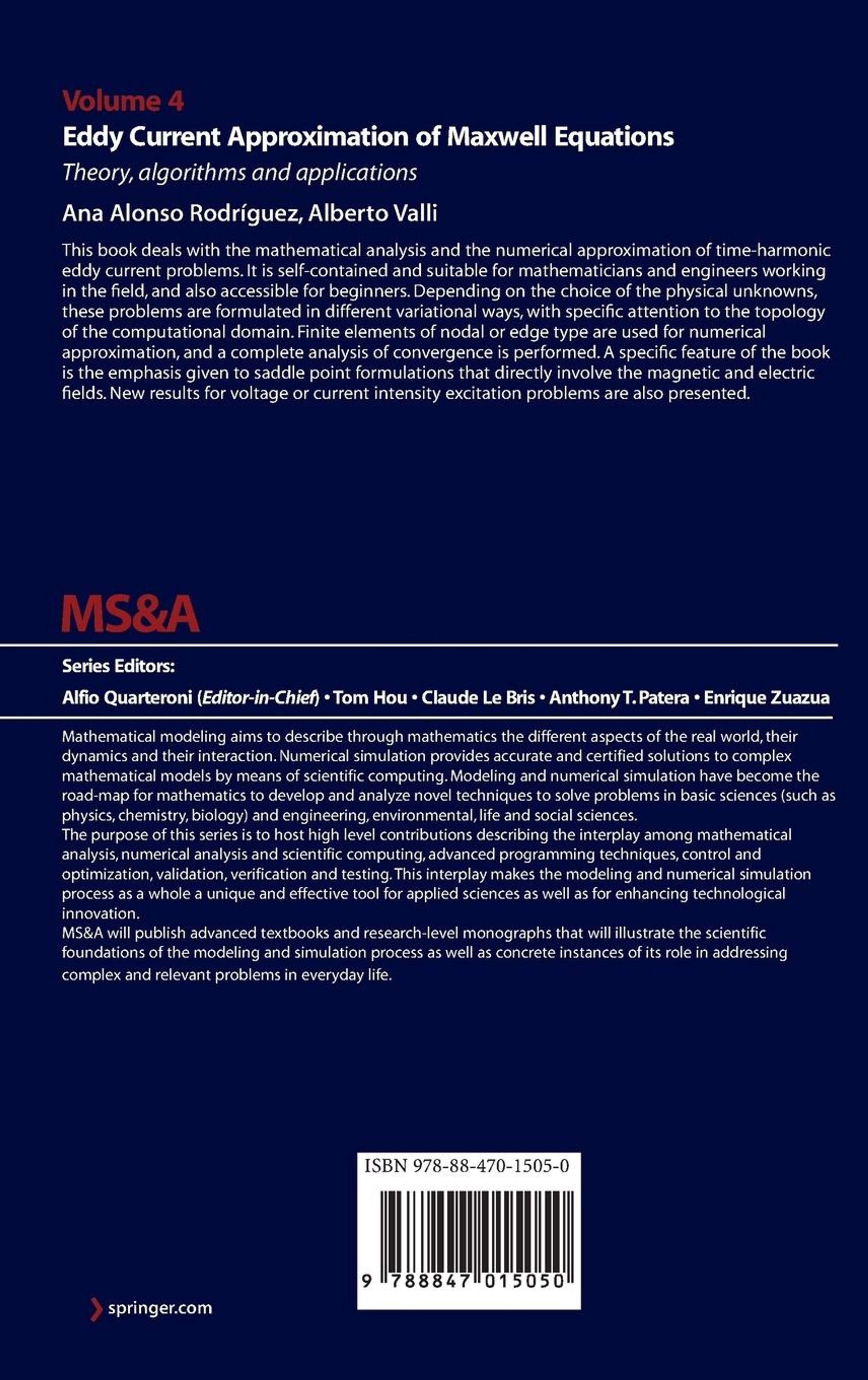 Setting the problem.- A mathematical justification of the eddy current model.- Existence and uniqueness of the solution.- Hybrid formulations for the electric and magnetic fields.- Formulations via scalar potentials.- Formulations via vector potentials.- Coupled FEM-BEM approaches.- Voltage and current intensity excitation.- Selected applications.