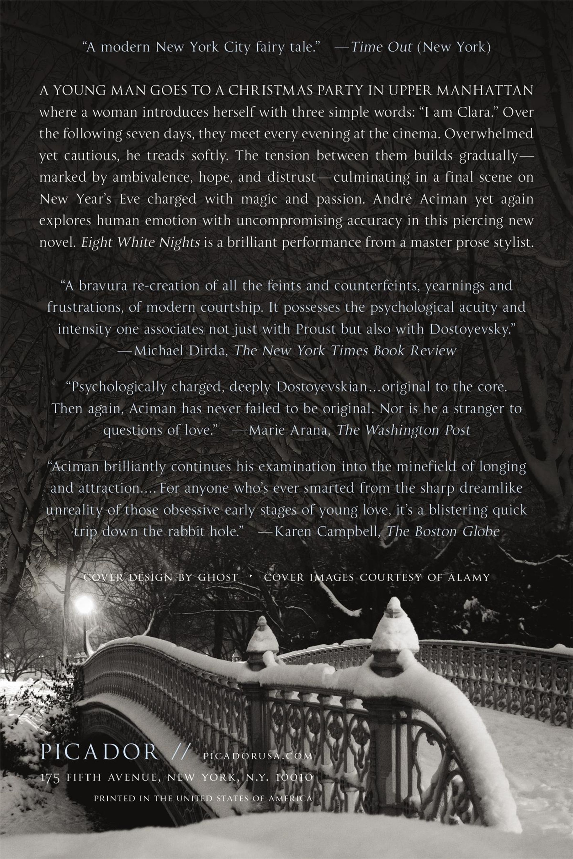 A young man goes to a Christmas party in upper Manhattan where a woman introduces herself with three simple words: "I am Clara." Over the following seven days, they meet every evening at the cinema. Overwhelmed yet cautious, he treads softly. The tension between them builds gradually-marked by ambivalence, hope, and distrust-culminating in a final scene on New Year's Eve charged with magic and the passion. André Aciman yet again explores human emotion with uncompromising accuracy in this piercing new novel. Eight White Nights is a brilliant performance from a master prose stylist.