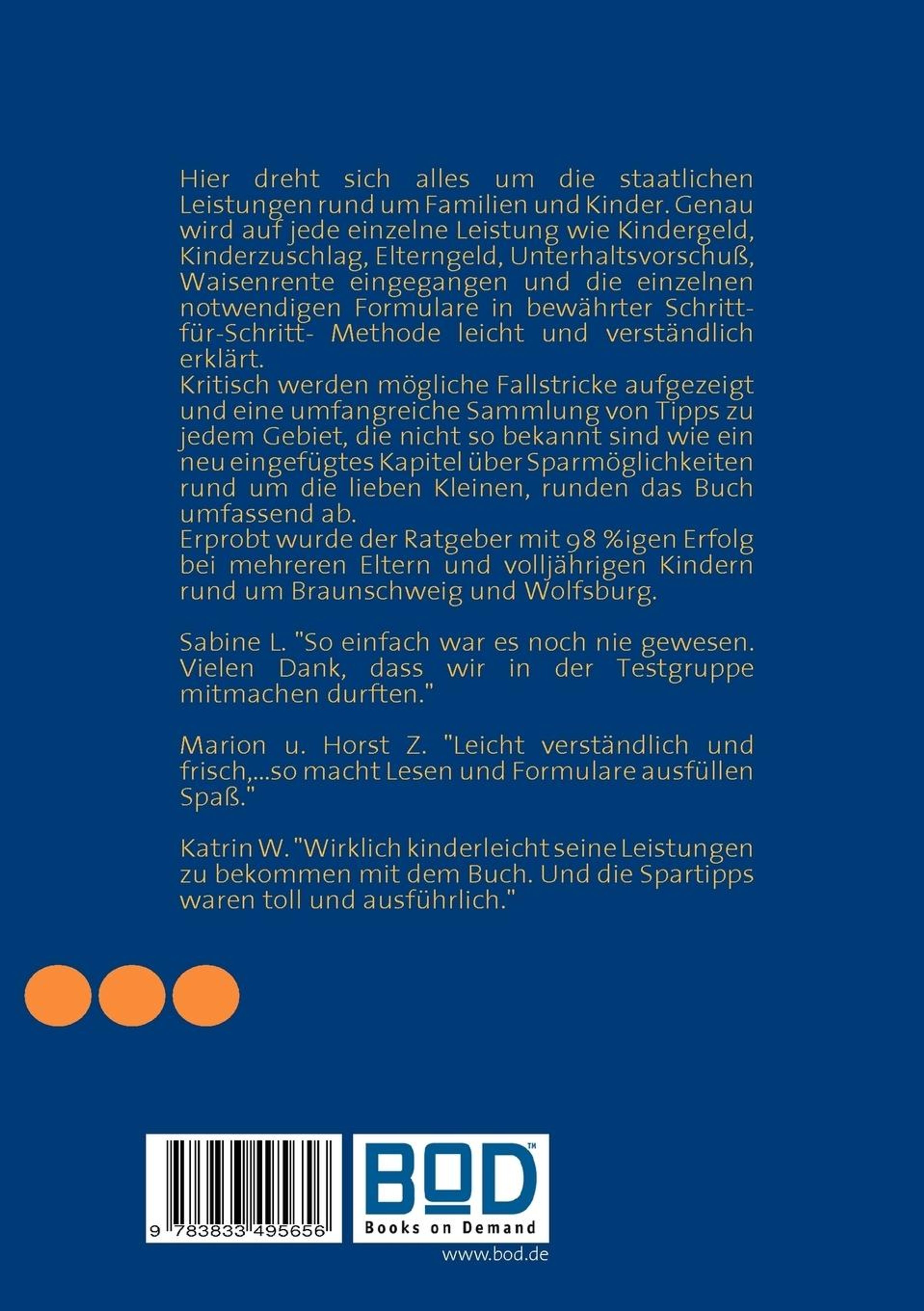 Hier dreht sich alles um die staatlichen Leistungen rund um Familien und Kinder. Genau wird auf jede einzelne Leistung wie Kindergeld, Kinderzuschlag, Elterngeld, Unterhaltsvorschuß, Waisenrente eingegangen und die einzelnen notwendigen Formulare in bewährter Schritt-für-Schritt- Methode leicht und verständlich erklärt. Kritisch werden mögliche Fallstricke aufgezeigt und eine umfangreiche Sammlung von Tipps zu jedem Gebiet, die nicht so bekannt sind wie ein neu eingefügtes Kapitel über Sparmöglichkeiten rund um die lieben Kleinen, runden das Buch umfassend ab. Erprobt wurde der Ratgeber mit 98 %igen Erfolg bei mehreren Eltern und volljährigen Kindern rund um Braunschweig und Wolfsburg.