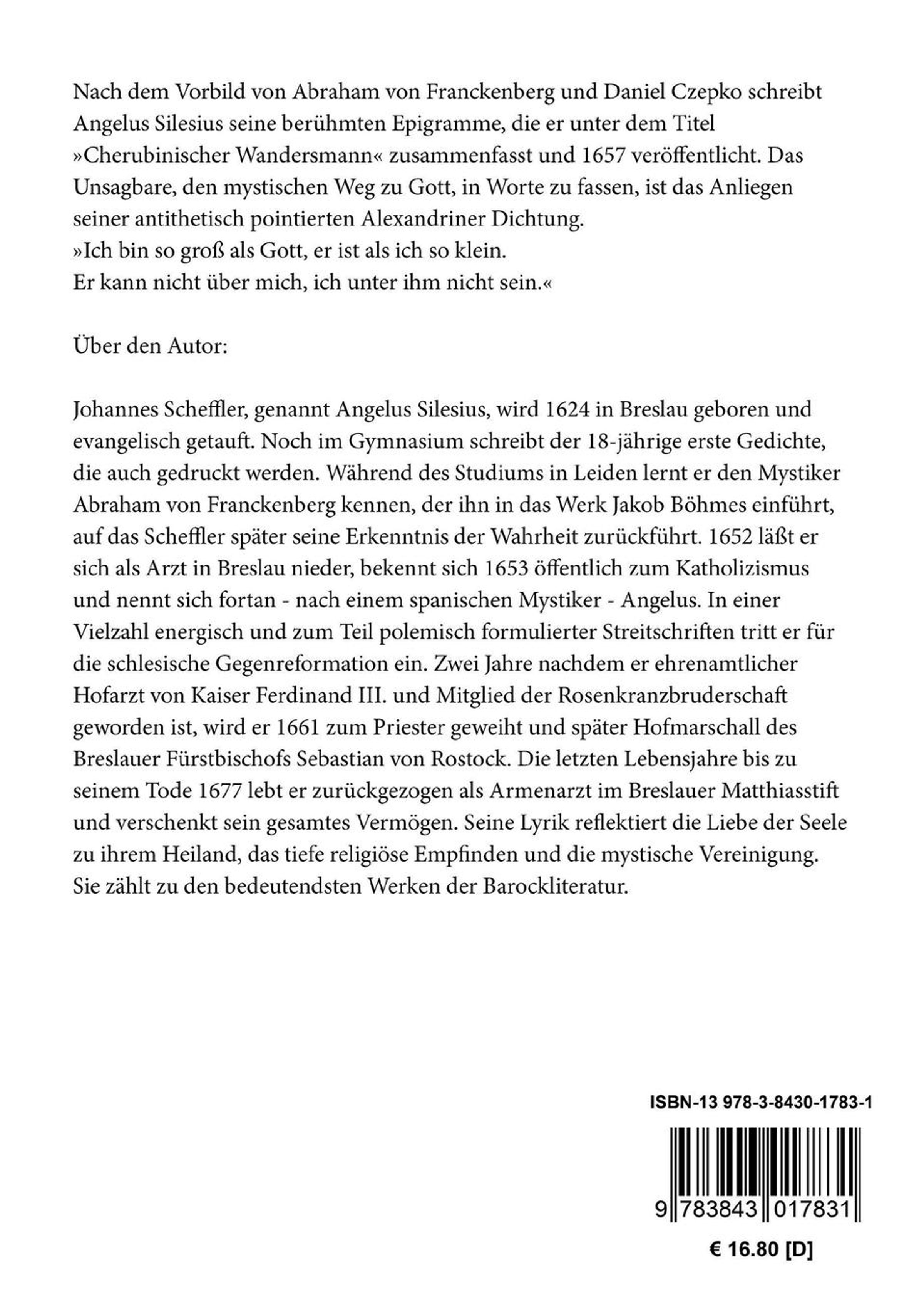 Johannes Scheffler, genannt Angelus Silesius, wird 1624 in Breslau geboren und evangelisch getauft. Noch im Gymnasium schreibt der 18-jährige erste Gedichte, die auch gedruckt werden. Während des Studiums in Leiden lernt er den Mystiker Abraham von Franckenberg kennen, der ihn in das Werk Jakob Böhmes einführt, auf das Scheffler später seine Erkenntnis der Wahrheit zurückführt. 1652 läßt er sich als Arzt in Breslau nieder, bekennt sich 1653 öffentlich zum Katholizismus und nennt sich fortan - nach einem spanischen Mystiker - Angelus. In einer Vielzahl energisch und zum Teil polemisch formulierter Streitschriften tritt er für die schlesische Gegenreformation ein. Zwei Jahre nachdem er ehrenamtlicher Hofarzt von Kaiser Ferdinand III. und Mitglied der Rosenkranzbruderschaft geworden ist, wird er 1661 zum Priester geweiht und später Hofmarschall des Breslauer Fürstbischofs Sebastian von Rostock. Die letzten Lebensjahre bis zu seinem Tode 1677 lebt er zurückgezogen als Armenarzt im Breslauer Matthiasstift und verschenkt sein gesamtes Vermögen. Seine Lyrik reflektiert die Liebe der Seele zu ihrem Heiland, das tiefe religiöse Empfinden und die mystische Vereinigung. Sie zählt zu den bedeutendsten Werken der Barockliteratur.