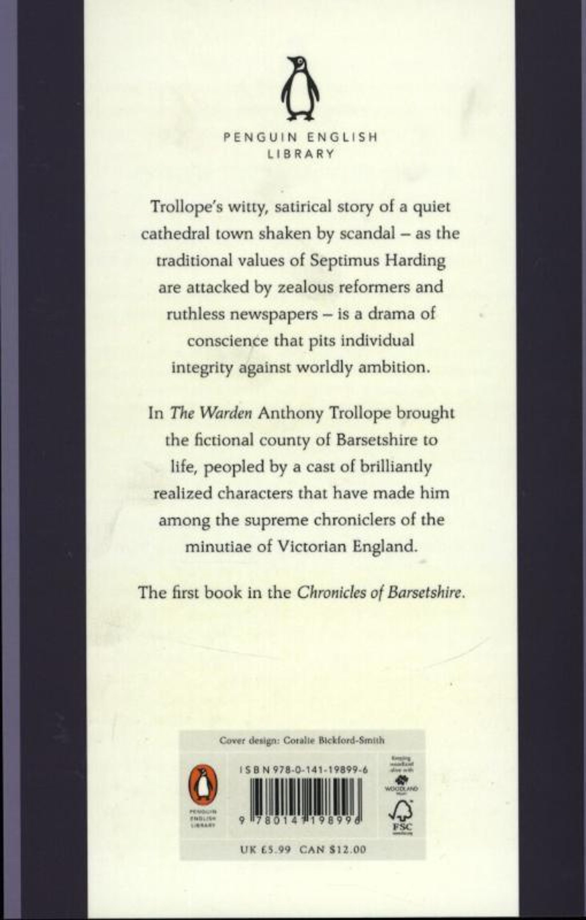 This is the "Penguin English Library Edition" of "The Warden" by Anthony Trollope. 'It was so hard that the pleasant waters of his little stream should be disturbed and muddied ...that his quiet paths should be made a battlefield: that the unobtrusive corner of the world which been allotted to him ...made miserable and unsound'. Trollope's witty, satirical story of a quiet cathedral town shaken by scandal - as the traditional values of Septimus Harding are attacked by zealous reformers and ruthless newspapers - is a drama of conscience that pits individual integrity against worldly ambition. In "The Warden" Anthony Trollope brought the fictional county of Barsetshire to life, peopled by a cast of brilliantly realised characters that have made him among the supreme chroniclers of the minutiae of Victorian England. It is the first book in the "Chronicles of Barsetshire". "The Penguin English Library" - 100 editions of the best fiction in English, from the eighteenth century and the very first novels to the beginning of the First World War.