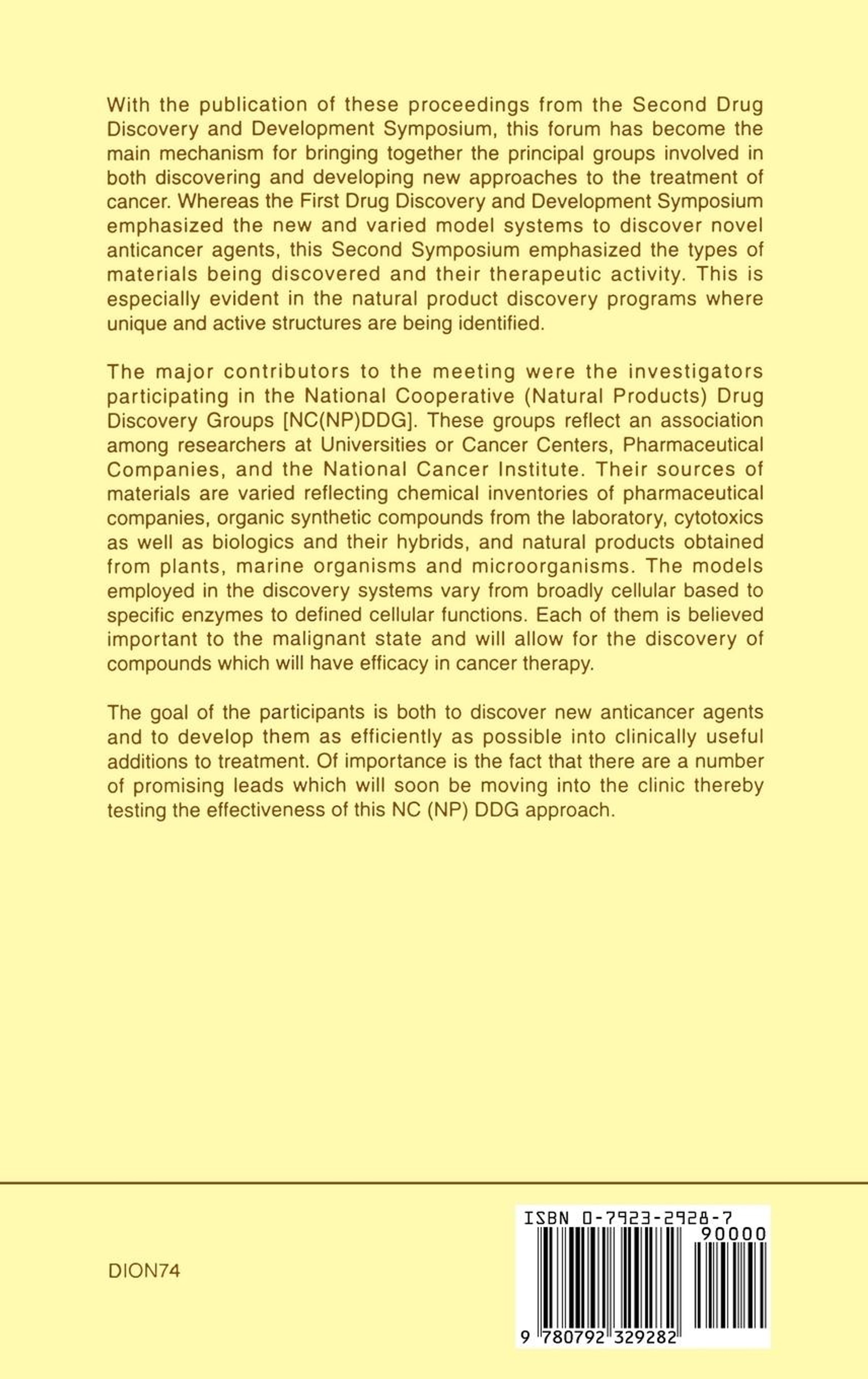 With the publication of these proceedings from the Second Drug Discovery and Development Symposium, this forum has become the main mechanism for bringing together the principal groups involved in both discovering and developing new approaches to the treatment of cancer. This Second Symposium emphasized the types of materials being discovered and their therapeutic activity. This is especially evident in the natural product discovery programs, where unique and active structures are being identified. The major contributors to the meeting were the investigators participating in the National Cooperative (Natural Products) Drug Discovery Groups [NC(NP)DDG]. These groups reflect an association among researchers at universities or cancer centers, pharmaceutical companies and the National Cancer Institute. Their sources of materials are varied, reflecting chemical inventories of pharmaceutical companies, organic synthetic compounds from the laboratory, cytotoxics as well as biologics and their hybrids, and natural products obtained from plants, marine organisms and microorganisms. The models employed in the discovery systems vary from broadly cellular based to specific enzymes to defined cellular functions. Each of them is believed important to the malignant state and will allow for the discovery of compounds which will have efficacy in cancer therapy. The goal of the participants is both to discover new anticancer agents and to develop them as efficiently as possible into clinically useful additions to treatment. Of importance is the fact that there are a number of promising leads which will soon be moving into the clinic thereby testing the effectiveness of this NC (NP) DDG approach.