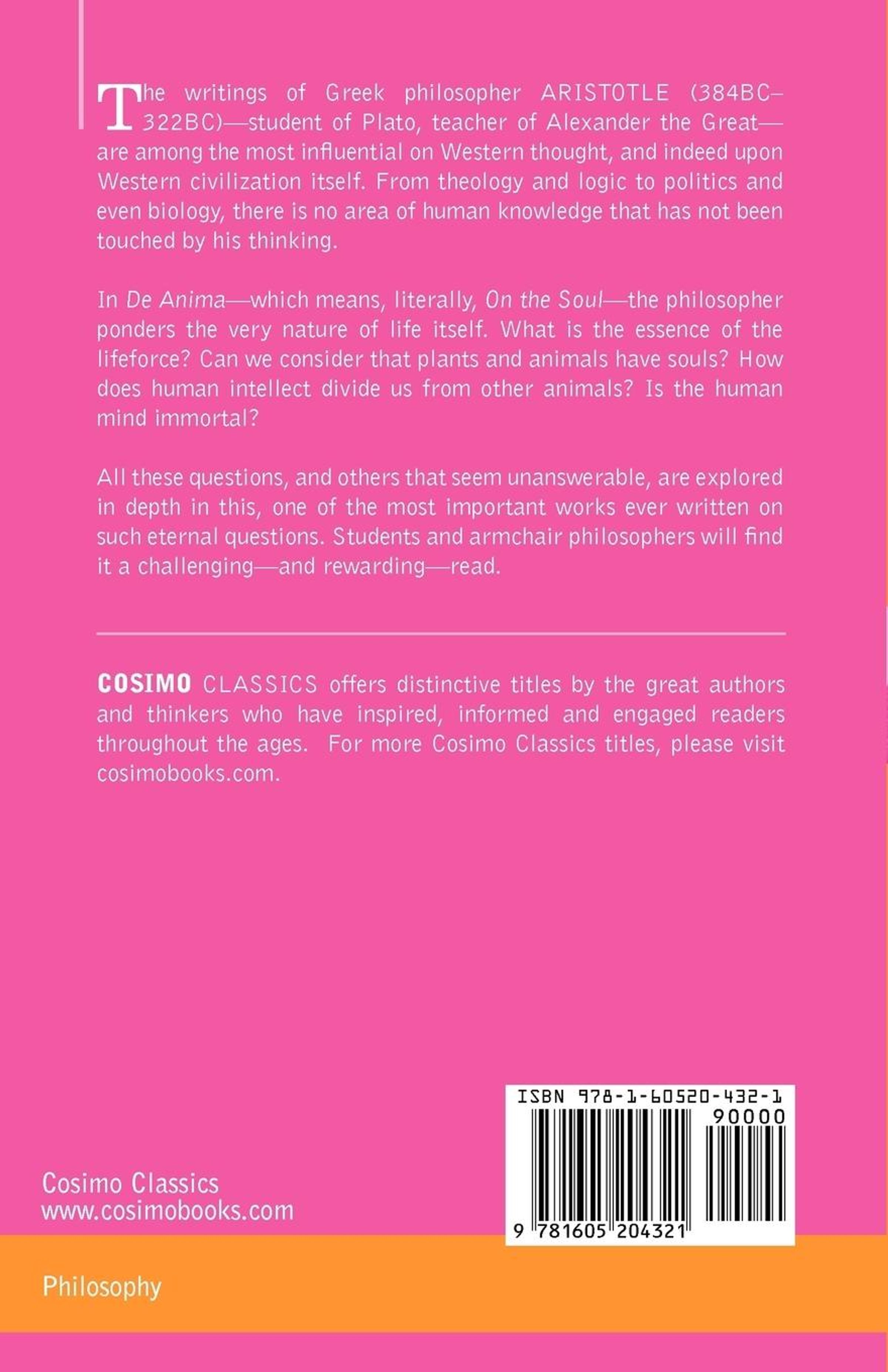 In De Anima-which means, literally, On the Soul-the philosopher ponders the very nature of life itself. What is the essence of the lifeforce? Can we consider that plants and animals have souls? How does human intellect divide us from other animals? Is the human mind immortal?