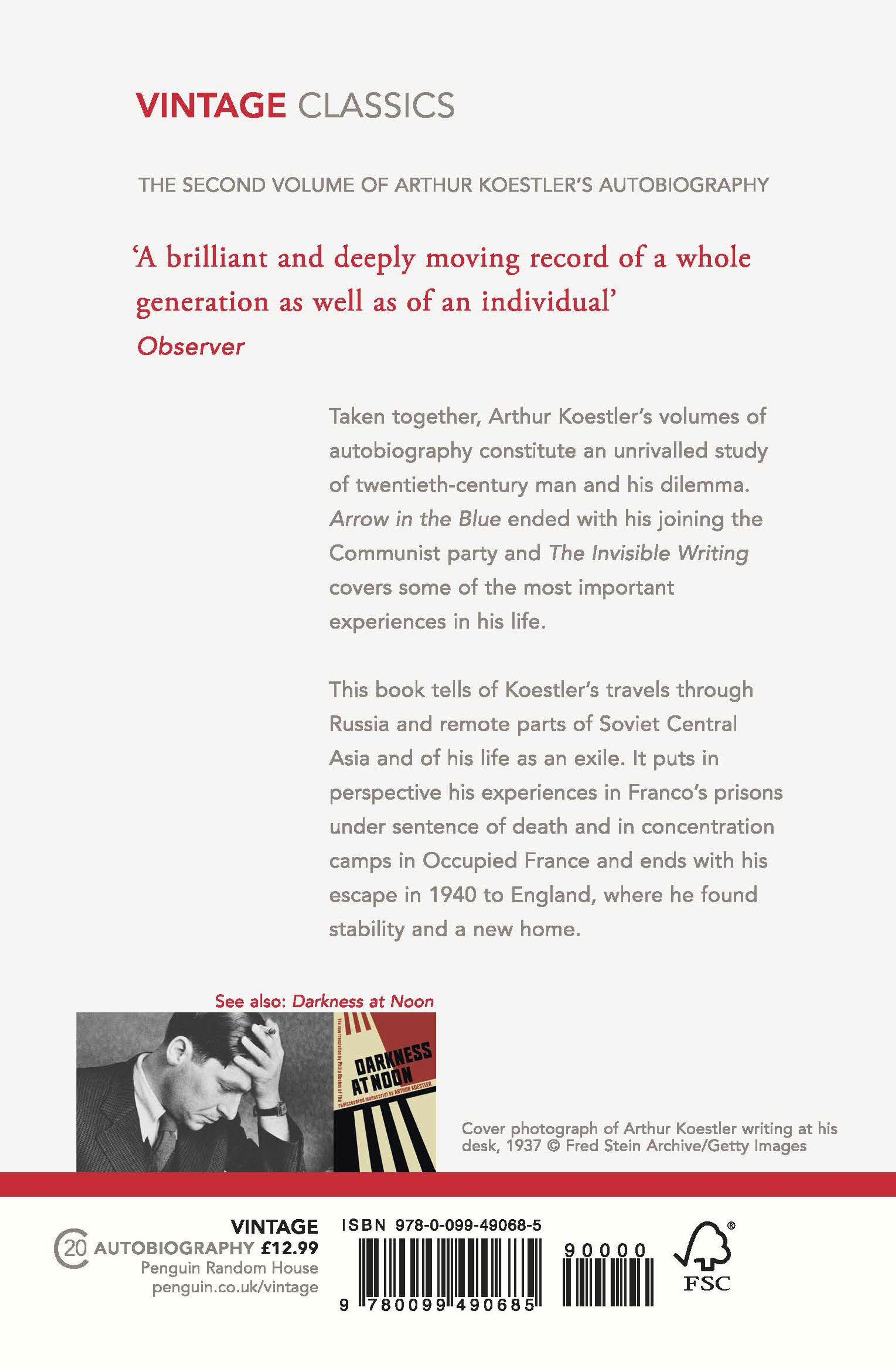 Taken together, Arthur Koestler's volumes of autobiography constitute an unrivalled study of a twentieth-century life. The Invisible Writing picks up where the first volume, Arrow in the Blue, ended, with Koestler joining the Communist Party. This second volume goes on to detail some of the most important, gruelling and electrifying experiences in his life.