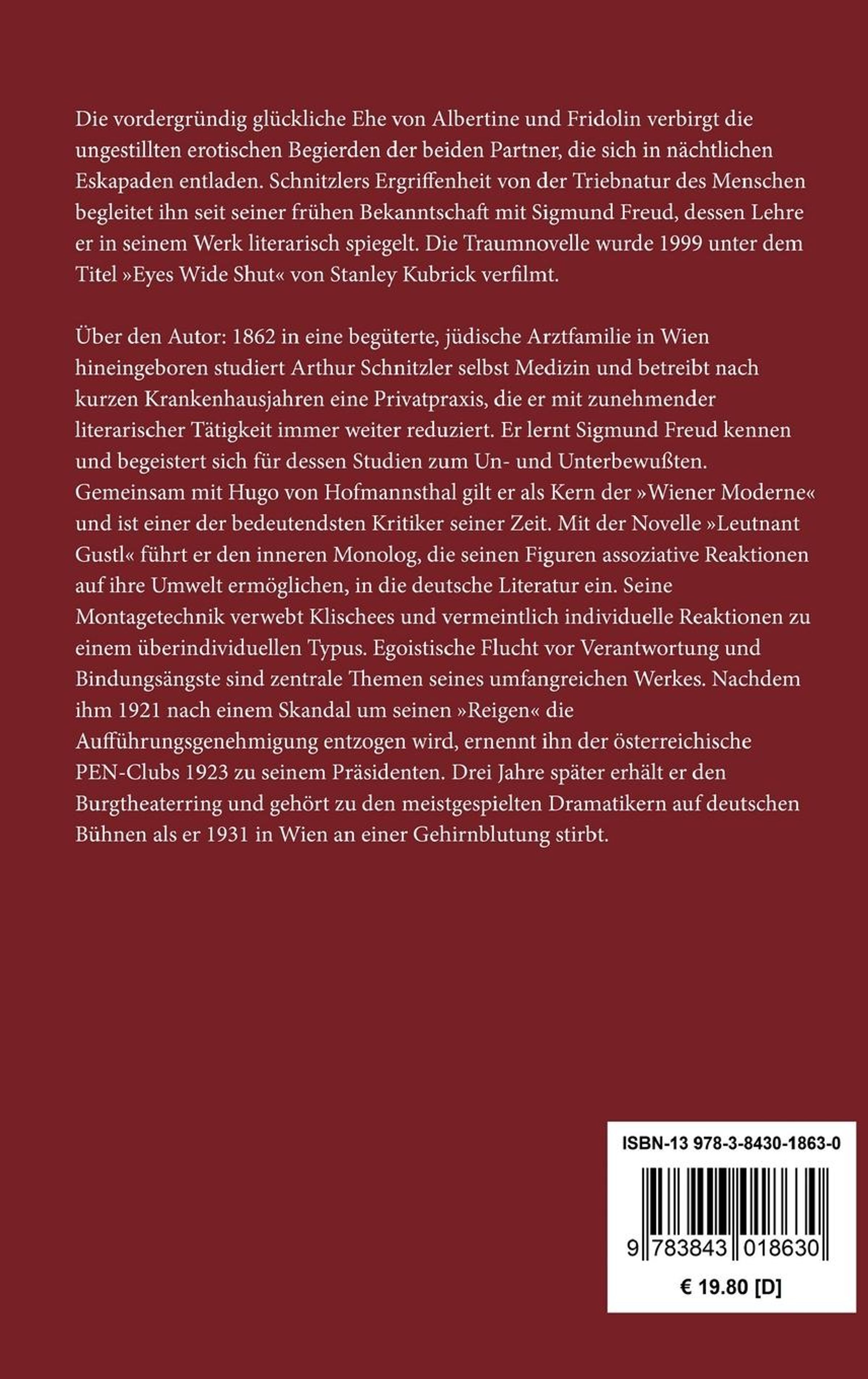 Die vordergründig glückliche Ehe von Albertine und Fridolin verbirgt die ungestillten erotischen Begierden der beiden Partner, die sich in nächtlichen Eskapaden entladen. Schnitzlers Ergriffenheit von der Triebnatur des Menschen begleitet ihn seit seiner frühen Bekanntschaft mit Sigmund Freud, dessen Lehre er in seinem Werk literarisch spiegelt. Die Traumnovelle wurde 1999 unter dem Titel >>Eyes Wide Shut<< von Stanley Kubrick verfilmt.
