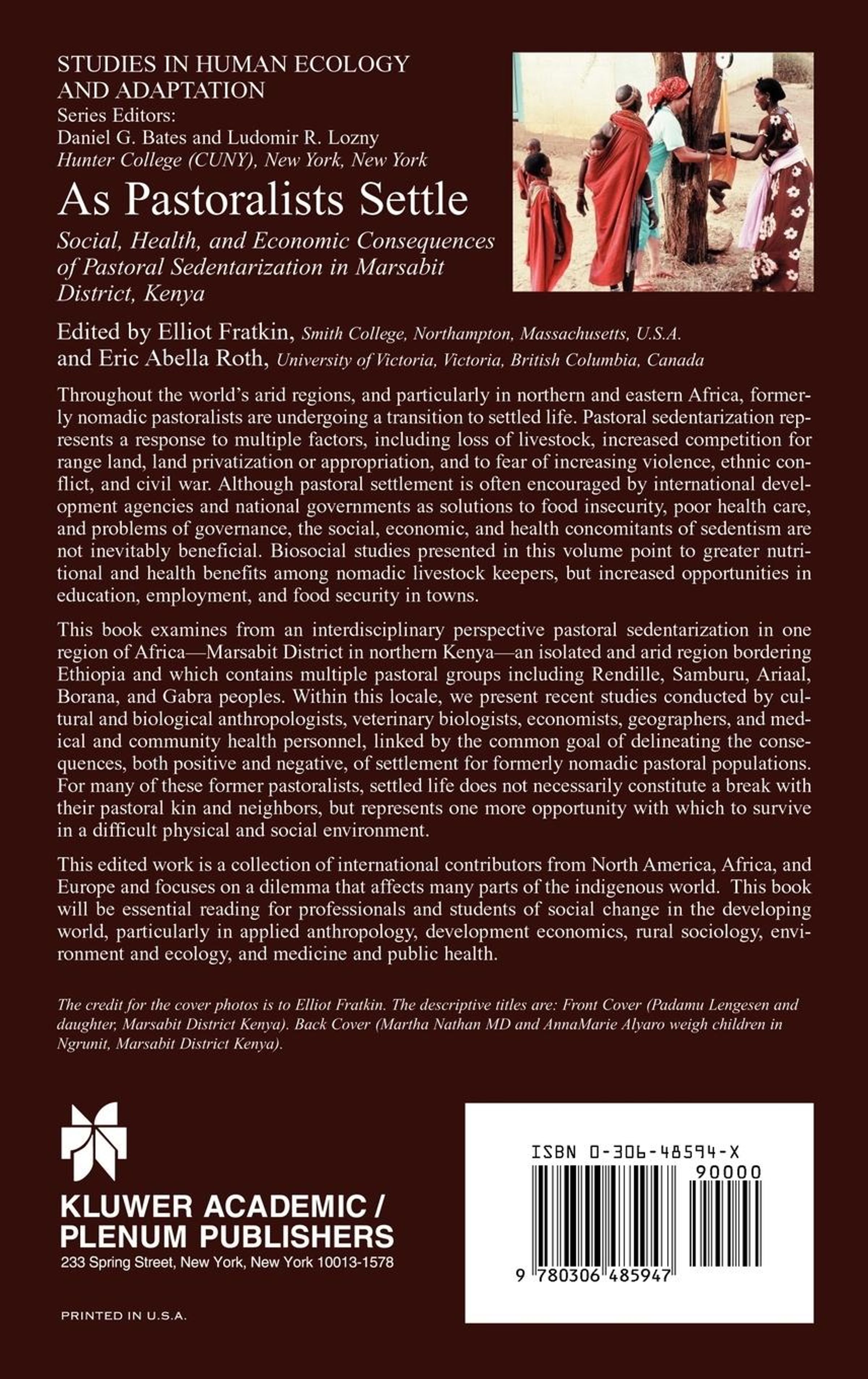 The Social, Health, and Economic Consequences of Pastoral Sedentarization in Marsabit District, Northern Kenya ERICABELLA ROTH AND ELLIOT FRATKIN 1. INTRODUCTION Formerly nomadic livestock-keeping pastoralists have settled in many regions of the world in the past century. Some groups, including those in the former Soviet Union, Iran, and Israel, have settled in response to state-enforced measures; others including Saami in Norway or Bedouins in Saudi Arabia, in response to changing economic opportunities. East Africa, home to many cattle- and camel-keeping pastoral societies, has been among the most recent to change. The shift to sedentism by East African pastoralists increased d- matically in the late 20th century as a result of sharp economic, political, demographic, and environmental changes. Prolonged drought, population growth, increased reliance on ag- culture, and political insecurities including civil war and ethnic conflict have all affected the ability of pastoralists to keep their herds. Still, the majority of pastoralist households in Kenya, Ethiopia, Somalia, and Tanzania remain committed to raising livestock, even as they adapt to farming or urban residence. Pastoral production remains a major economic focus in the savannas and scrub deserts of Africa, due to both its ecological adaptability and the economic incentive to market livestock and their products (Fratkin, 2001). Pastoralists settle for a variety of reasons, some in response to pushesaway from the pastoral economy, others to the pullsof urban or agricultural life.