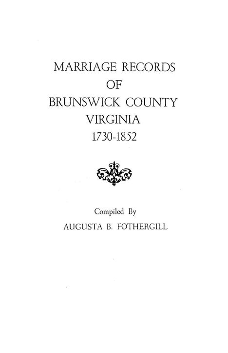 This compilation was originally undertaken at the request of the Board of Supervisors of Brunswick County, who suggested that Miss Fothergill copy and index the Brunswick County marriage bonds from 1752, when they first appear among miscellaneous papers, until the commencement of vital records in 1852. When once she set to the task, Miss Fothergill discovered that she could improve the basic list of marriages by adding inferential marriage proofs from estate settlements, wills, and deeds. The resulting compilation, running from 1730 to 1852, is a composite of more than 3, 000 marriage records. As is customary in such compilations, men are listed in alphabetical order, with an index of brides comprising a separate section. Incidental information found among the records, and employed here, includes references to places of residence and to guardians, sureties, and parents. All told the work indentifies 7, 500 brides, grooms, parents and sureties, and the exact date of the marriage or bond. With an improved index.