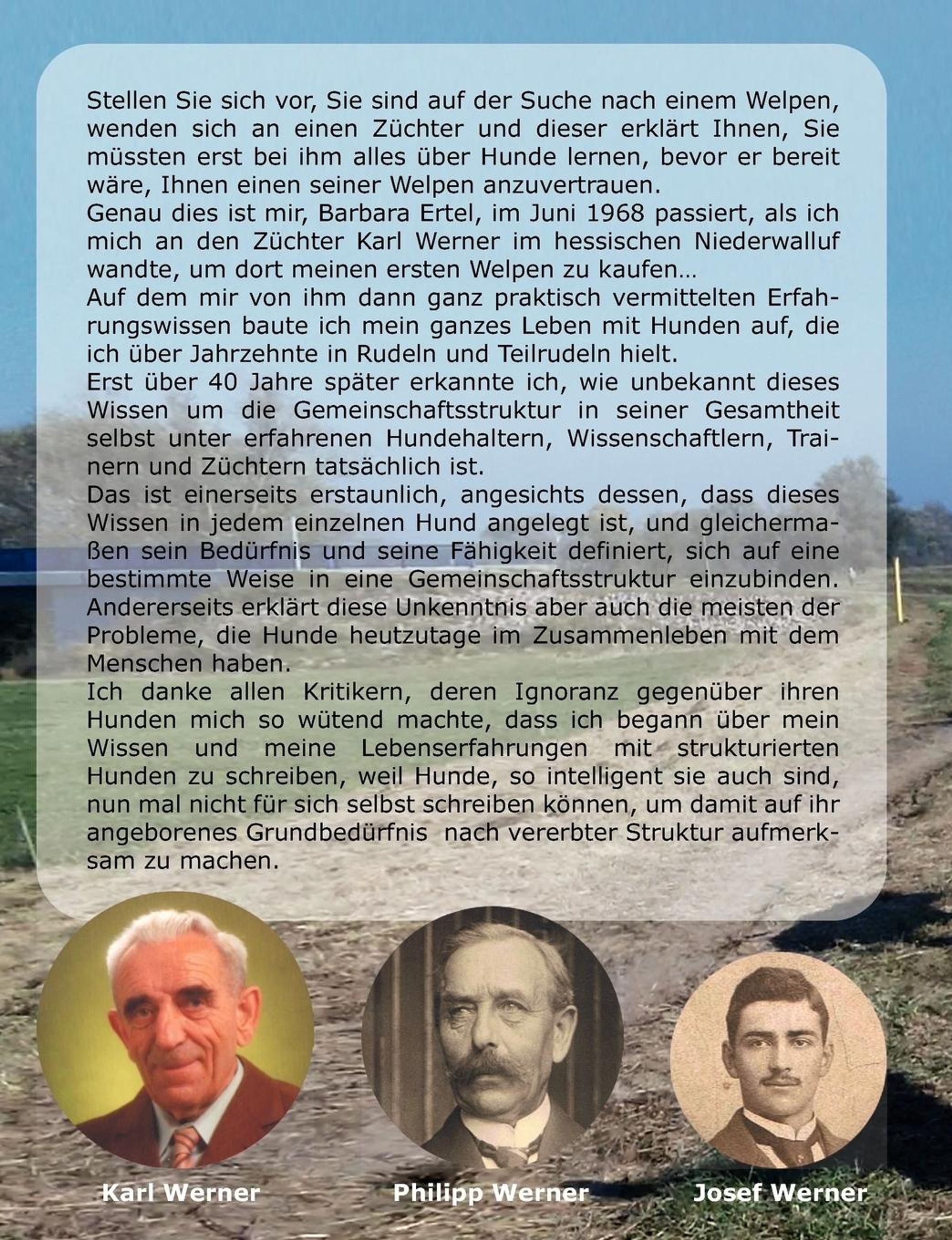 Stellen Sie sich vor, Sie sind auf der Suche nach einem Welpen, wenden sich an einen Züchter und dieser erklärt Ihnen, Sie müssten erst bei ihm alles über Hunde lernen, bevor er bereit wäre, Ihnen einen seiner Welpen anzuvertrauen. Genau dies ist mir, Barbara Ertel, im Juni 1968 passiert, als ich mich an den Züchter Karl Werner im hessischen Niederwalluf wandte, um dort meinen ersten Welpen zu kaufen Auf dem mir von ihm dann ganz praktisch vermittelten Erfahrungswissen baute ich mein ganzes Leben mit Hunden auf, die ich über Jahrzehnte in Rudeln und Teilrudeln hielt. Erst über 40 Jahre später erkannte ich, wie unbekannt dieses Wissen um die Gemeinschaftsstruktur in seiner Gesamtheit selbst unter erfahrenen Hundehaltern, Wissenschaftlern, Trainern und Züchtern tatsächlich ist. Das ist einerseits erstaunlich, angesichts dessen, dass dieses Wissen in jedem einzelnen Hund angelegt ist, und gleichermaßen sein Bedürfnis und seine Fähigkeit definiert, sich auf eine bestimmte Weise in eine Gemeinschaftsstruktur einzubinden. Andererseits erklärt diese Unkenntnis aber auch die meisten der Probleme, die Hunde heutzutage im Zusammenleben mit dem Menschen haben. Ich danke allen Kritikern, deren Ignoranz gegenüber ihren Hunden mich so wütend machte, dass ich begann über mein Wissen und meine Lebenserfahrungen mit strukturierten Hunden zu schreiben, weil Hunde, so intelligent sie auch sind, nun mal nicht für sich selbst schreiben können, um damit auf ihr angeborenes Grundbedürfnis nach vererbter Struktur aufmerksam zu machen.