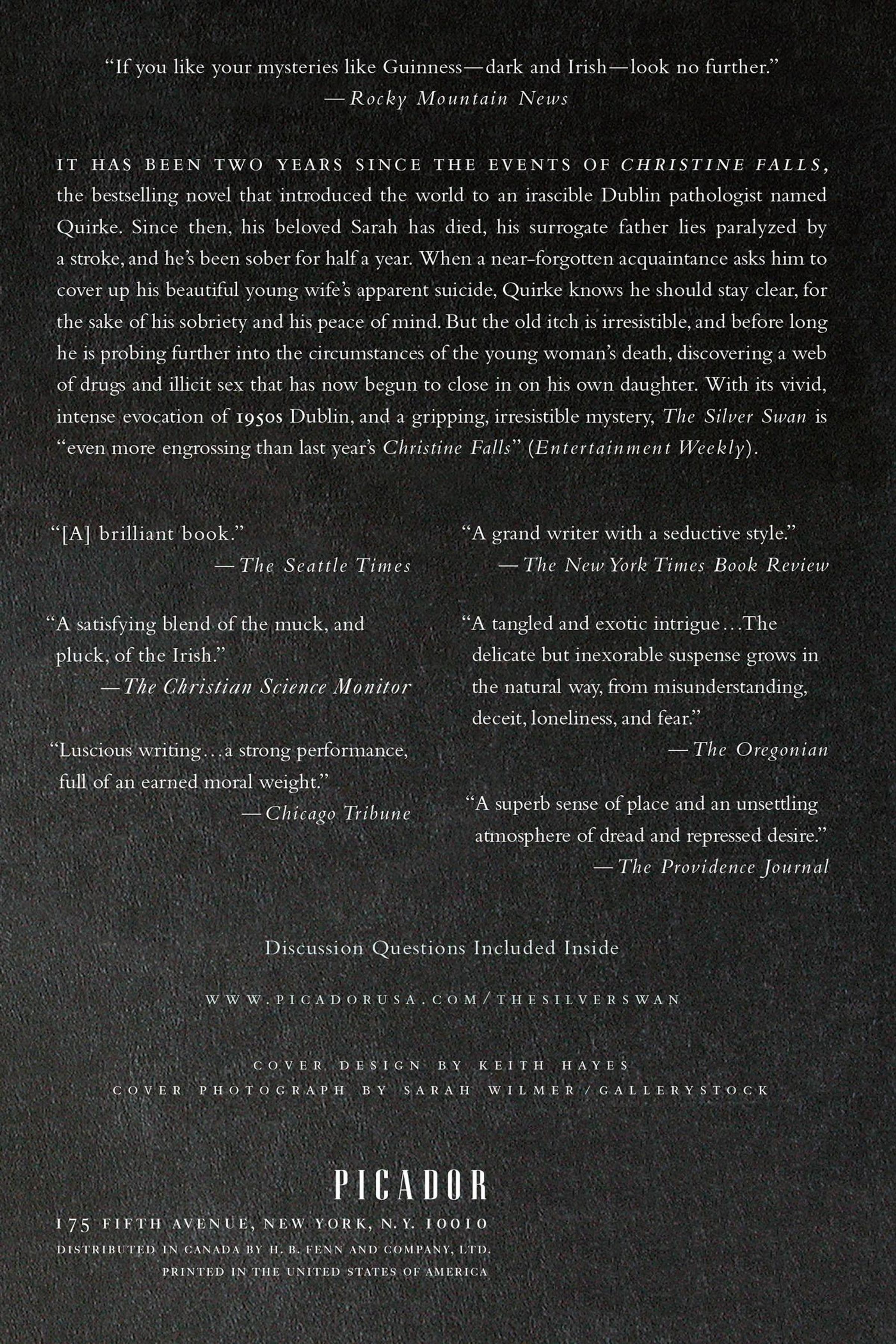 It has been two years since the events of Christine Falls , the bestselling novel that introduced the world to an irascible Dublin pathologist named Quirke. Quirke's beloved Sarah has died, his surrogate father lies paralyzed by a stroke, and he's been sober for half a year. When a near-forgotten acquaintance asks him to cover up his beautiful young wife's apparent suicide, Quirke knows he should stay clear, for the sake of his sobriety and his peace of mind. But his old itch is irresistible, and before long he is probing further into the circumstances of Deidre Hunt's death, into a web of drugs and illicit sex that may have snared his own daughter, Phoebe. With its vivid, intense evocation of 1950s Dublin, and intricate, psychologically complex storyline, The Silver Swan is "even more engrossing than last year's Christine Falls " (Entertainment Weekly).