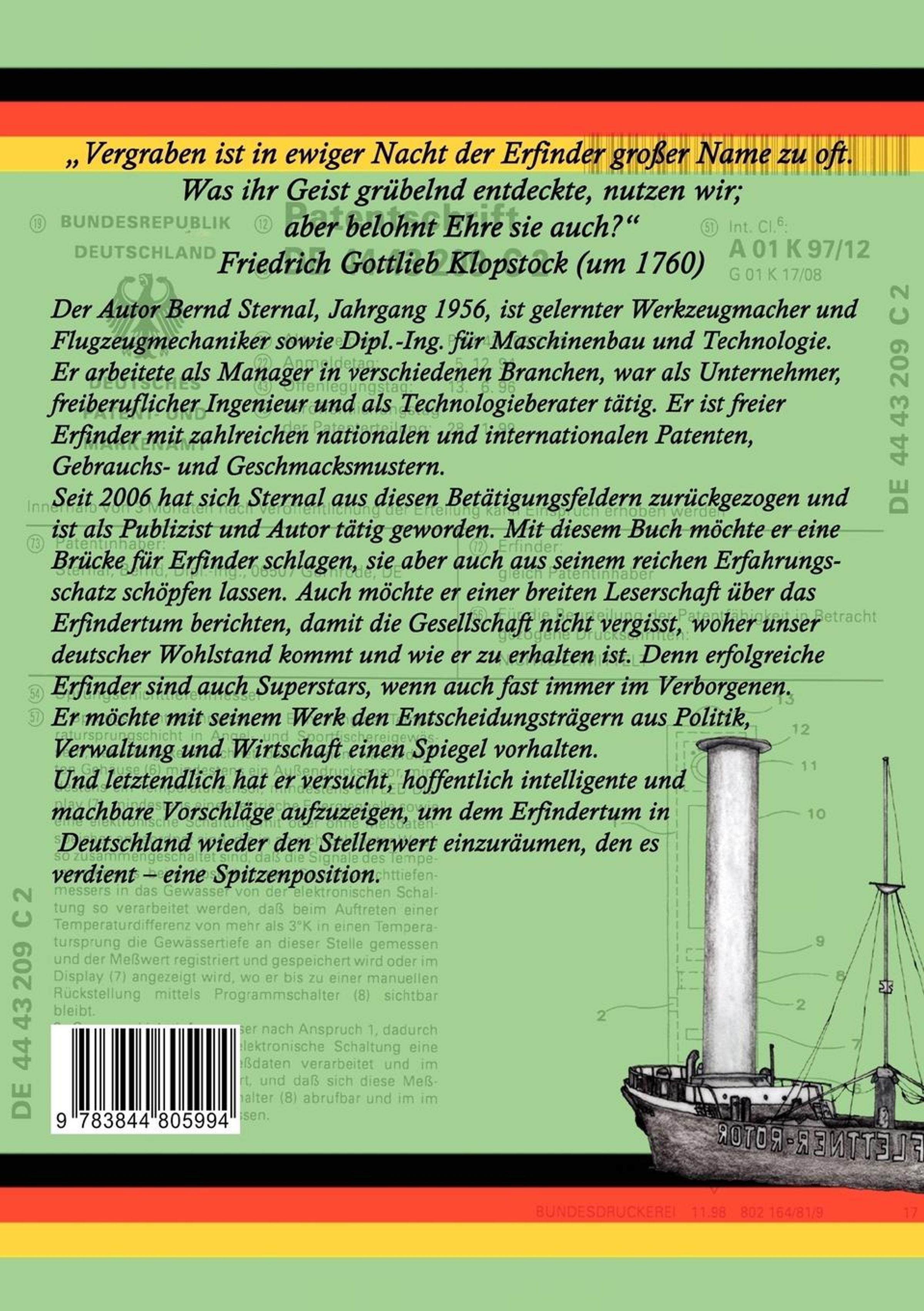 Vergraben ist in ewiger Nacht der Erfinder großer Name zu oft. Was ihr Geist grübelnd entdeckte, nutzen wir; aber belohnt Ehre sie auch? Friedrich Gottlieb Klopstock (um 1760) Der Autor Bernd Sternal, Jahrgang 1956, ist gelernter Werkzeugmacher und Flugzeugmechaniker sowie Dipl.-Ing. für Maschinenbau und Technologie. Er arbeitete als Manager in verschiedenen Branchen, war als Unternehmer, freiberuflicher Ingenieur und als Technologieberater tätig und er ist freier Erfinder mit zahlreichen nationalen und internationalen Patenten, Gebrauchs- und Geschmacksmustern. Seit 2006 hat sich Sternal aus diesen Betätigungsfeldern zurückgezogen und ist als Publizist und Autor tätig geworden. Mit diesem Buch möchte er eine Brücke für Erfinder schlagen, sie aber auch aus seinem reichen Erfahrungsschatz schöpfen lassen. Auch möchte er einer breiten Leserschaft über das Erfindertum berichten, damit die Gesellschaft nicht vergisst, woher unser deutscher Wohlstand kommt und wie er zu erhalten ist. Denn erfolgreiche Erfinder sind auch Superstars, wenn auch fast immer im Verborgenen. Auch möchte er mit seinem Werk den Entscheidungsträgern aus Politik, Verwaltung und Wirtschaft einen Spiegel vorhalten. Und letztendlich hat er versucht, hoffentlich intelligente und machbare Vorschläge aufzuzeigen, um dem Erfindertum in Deutschland wieder den Stellenwert einzuräumen, den es verdient eine Spitzen-Position.