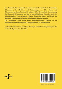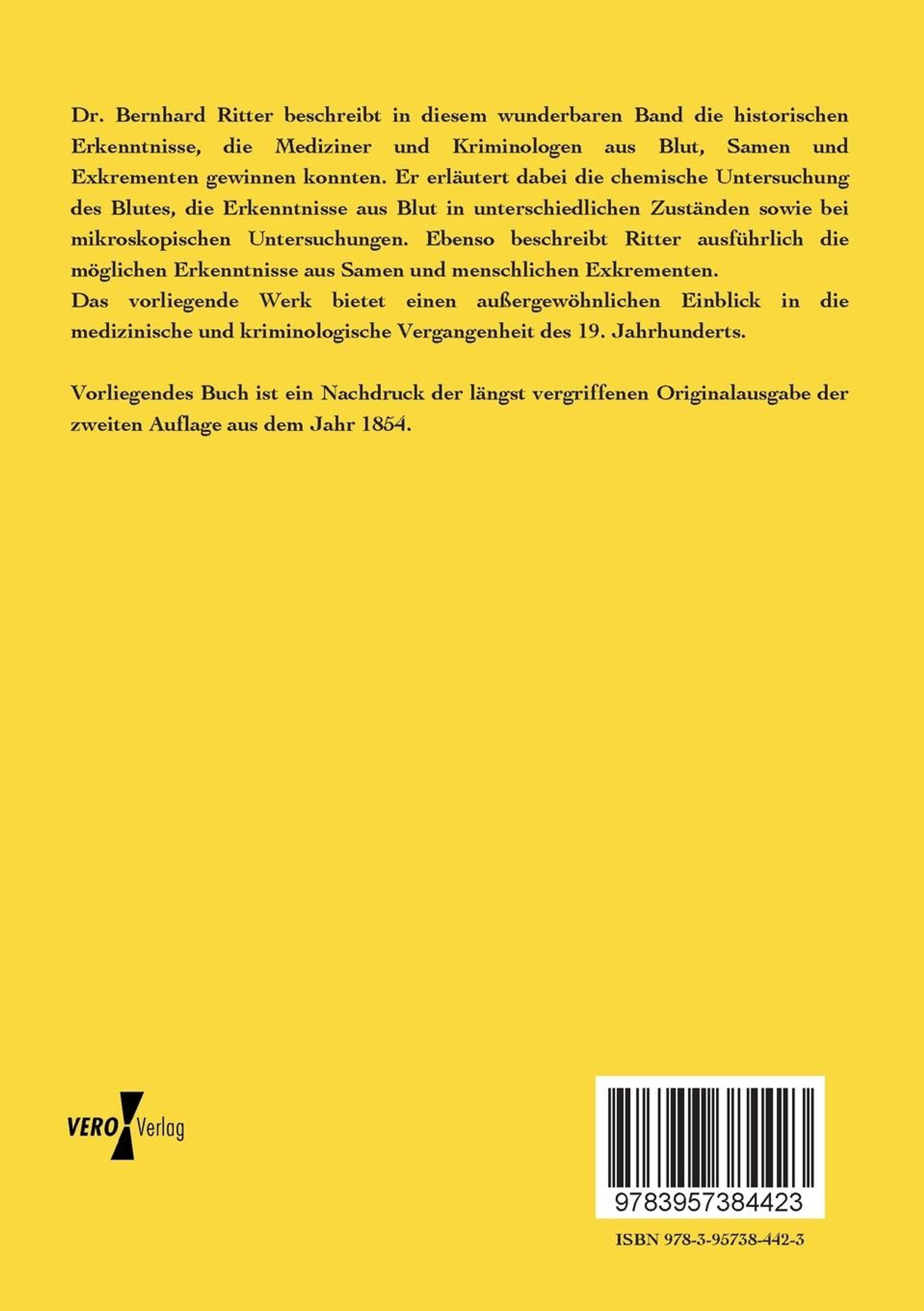 Dr. Bernhard Ritter beschreibt in diesem wunderbaren Band die historischen Erkenntnisse, die Mediziner und Kriminologen aus Blut, Samen und Exkrementen gewinnen konnten. Er erläutert dabei die chemische Untersuchung des Blutes, die Erkenntnisse aus Blut in unterschiedlichen Zuständen sowie bei mikroskopischen Untersuchungen. Ebenso beschreibt Ritter ausführlich die möglichen Erkenntnisse aus Samen und menschlichen Exkrementen. Das vorliegende Werk bietet einen außergewöhnlichen Einblick in die medizinische und kriminologische Vergangenheit des 19. Jahrhunderts.