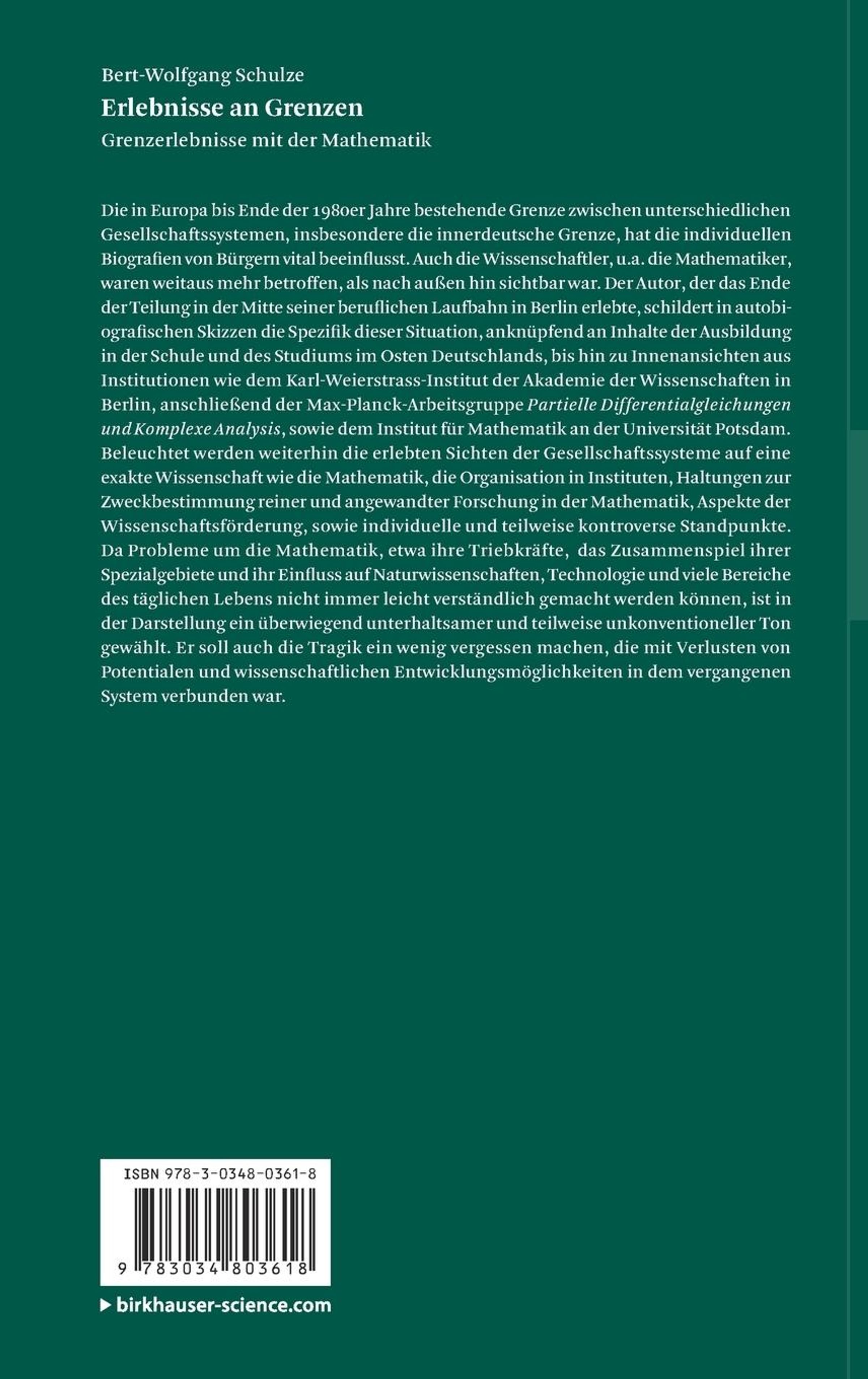 Die in Europa bis Ende der 1980er Jahre bestehende Grenze zwischen unterschiedlichen Gesellschaftssystemen, insbesondere die innerdeutsche Grenze, hat die individuellen Biografien von Bürgern vital beeinflusst. Auch die Wissenschaftler, u. a. die Mathematiker, waren weitaus mehr betroffen, als nach außen hin sichtbar war. Der Autor, der das Ende der Teilung in der Mitte seiner beruflichen Laufbahn in Berlin erlebte, schildert in autobiografischen Skizzen die Spezifik dieser Situation, anknüpfend an Inhalte der Ausbildung in der Schule und des Studiums im Osten Deutschlands, bis hin zu Innenansichten aus Institutionen wie dem Karl-Weierstrass-Institut der Akademie der Wissenschaften in Berlin, anschließend der Max-Planck-Arbeitsgruppe Partielle Differentialgleichungen und Komplexe Analysis, sowie dem Institut für Mathematik an der Universität Potsdam. Beleuchtet werden weiterhin die erlebten Sichten der Gesellschaftssysteme auf eine exakte Wissenschaft wie die Mathematik, die Organisation in Instituten, Haltungen zur Zweckbestimmung reiner und angewandter Forschung in der Mathematik, Aspekte der Wissenschaftsförderung, sowie individuelle und teilweise kontroverse Standpunkte. Da Probleme um die Mathematik, etwa ihre Triebkräfte, das Zusammenspiel ihrer Spezialgebiete und ihr Einfluss auf Naturwissenschaften, Technologie und viele Bereiche des täglichen Lebens nicht immer leicht verständlich gemacht werden können, ist in der Darstellung ein überwiegend unterhaltsamer und teilweise unkonventioneller Ton gewählt. Er soll auch die Tragik ein wenig vergessen machen, die mit Verlusten von Potentialen und wissenschaftlichen Entwicklungsmöglichkeiten in dem vergangenen System verbunden war.