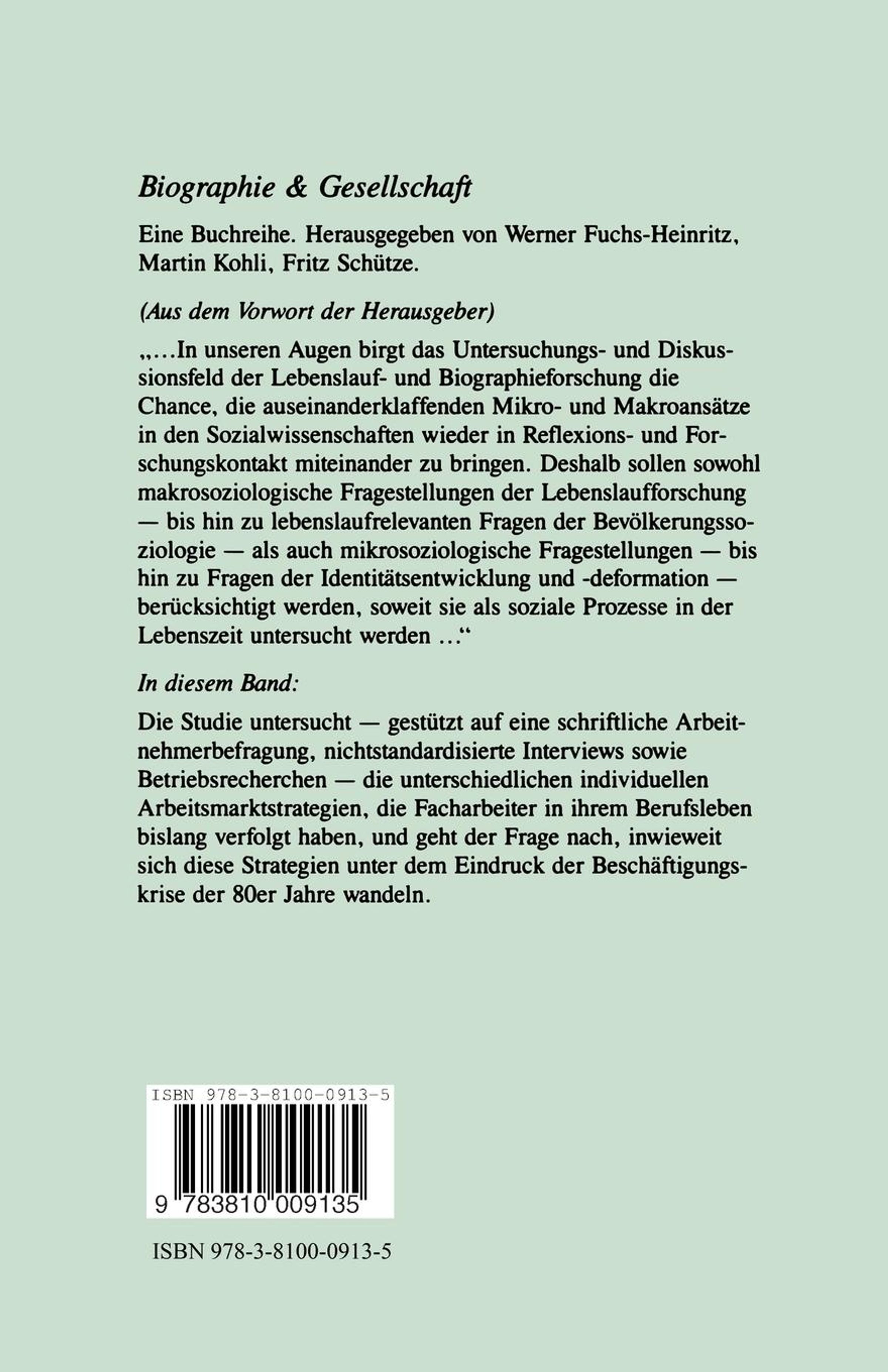 Vorbemerkung.- 1. Einleitung.- 1.1 Segmentation des Arbeitsmarktes und Arbeitsmarktverhalten.- 1.2 Biographische Perspektive und Arbeitsmarkt.- 1.3 Der Sozialtypus: Facharbeiter.- 1.4 Methode, Sample und Aufbau der Studie.- 2. Arbeitsmarktstrukturen und die Berufsverläufe von Facharbeitern.- 2.1 Die Arbeitsmarktsituation von Facharbeitern: Vom Facharbeitermangel zum Beschäftigungsrisiko.- 2.2 Regionale Unterschiede Gemeinsamkeiten in der Tendenz.- 2.3 Berufsverläufe von Facharbeitern: der erlernte Beruf stellt die Weichen.- 2.4 Verlaufsmuster bei einem Berufswechsel.- 2.5 Berufsverlaufsmuster: Facharbeiter bleiben.- 2.6 Stabile Wechsel ? Zur Verteilung der Risiken.- 2.7 Berufsspezifische Erwerbsverläufe und Risiken.- 3. Die Berufsbiographien der Facharbeiter: Balancen zwischen Autonomie und Zwang.- 3.1 Individuelles Arbeitsmarkthandeln und strukturelle Bedingungen.- 3.2 Arbeitsmarktstrategien und Orientierungen von Facharbeitern im berufsbiographischen Verlauf Eine Typologie.- 3.2.1 In dieser Sache kannst Du total kreativ arbeiten Die arbeitsinhaltlich orientierten Facharbeiter.- 3.2.1.1 Ich wollte gern was machen, wenn es fertig ist, daß das funktioniert Berufswahl und Ausbildungsplatzsuche.- 3.2.1.2 Ich will auch weiter, höher Arbeitsmarkthandeln und Berufeverläufe nach der Ausbildung.- 3.2.1.3 Es wär ne Arbeit gewesen, wo kein qualifizierter Facharbeiter ran muß Überbetriebliche Arbeitsmarktstrategien.- 3.2.1.4 Manche wechseln und wissen nicht mehr was sie wollen. Ich wollte nur dahin Die innerbetrieblichen Arbeitsmarktstrategien.- 3.2.1.5 Ich habe einfach Interesse wie ein Wissenschaftler, der was Neues sucht, der flippt darin aus Berufliche Qualifizierung als Strategie.- 3.2.2 Ich bin immer ein bißchen vorsichtig Die sicherheitsorientierten Facharbeiter.- 3.2.2.1 Wichtig war mir, daß ich eine Lehrstelle hatte Berufswahl und Ausbildungsplatzsuche.- 3.2.2.2 Bleib nicht hier, wer weiß wie lange das noch gut geht Die antizipierte Krise.- 3.2.2.3 Es ist alles unsicher draußen Sicherung des Arbeitsplatzes durch Verbleib im Betrieb.- 3.2.2.4 Bin ganz gut durchgerutscht Innerbetriebliche Strategien und Qualifikationsverhalten.- 3.2.3 Wenn man genügend Geld hätte, würde keiner arbeiten Die lohnorientierten Facharbeiter.- 3.2.3.1 Mir war es egal, ob Du was lernst oder in den Hafen gehst Berufewahl und Ausbildungsplatzsuche.- 3.2.3.2 Egal, ob man im Großbetrieb oder im Kleinbetrieb arbeitet, Hauptsache das Geld stimmt Betriebswechsel als überbetriebliche Arbeitsmarktstrategie.- 3.2.3.3 Das laß ich auf mich zukommen Die innerbetrieblichen Strategien.- 3.2.3.4 Da müßte man schon eine genügende Liebe zum Beruf haben Das Qualifikationsverhalten.- 3.2.4 Da dacht ich mir: das war ich noch nicht Also bin ich hin Die Optimierer .- 3.2.4.1 War ein Beruf mit weiteren Ausbildungsmöglichkeiten Berufswahl und Ausbildungsplatzsuche.- 3.2.4.2 Nach vielen Meinungsverschiedenheiten hab ich mir gesagt: Du machst den Abflug Der überbetriebliche Arbeitsplatzwechsel.- 3.2.4.3 Hauptsache, erst mal im Betrieb sein hier waren Wege offen Die Spekulation auf den internen Arbeitsmarkt des Großbetriebes.- 3.2.4.4 Je besser man qualifiziert ist, umso besser kann man sich verkaufen Die Qualifizierungsstrategie.- 3.2.4.5 Wenn sich was ergeben würde, würde ich überlegen und abwägen Die Kosten-Nutzen-Rechnung als Handlungsmodus.- 3.2.4.6 Das, was ich jetzt mache, entspricht meinen gegenwärtigen Interessen Lebensphasen als Orientierungspunkte für Motive und Strategie.- 3.2.5 Ich hab immer zu allem Ja und Amen gesagt Die inaktiven Facharbeiter.- 3.2.5.1 Fernsehmechaniker wollte ich werden Maler ist auch nicht schlecht Berufswahl und Ausbildungsplatzsuche.- 3.2.5.2 Da hab ich Mut gefaßt, zu sagen: Ich kündige! Der Betriebswechsel als Ausnahme.- 3.2.5.3 Vorstellbar ist das aber ich arbeite nicht darauf hin Innerbetriebliche Strategien und Qualifikationsverhalten.- 3.2.5.4 Man paßt sich eben an Die Anpassung an die berufliche Realität