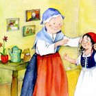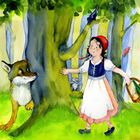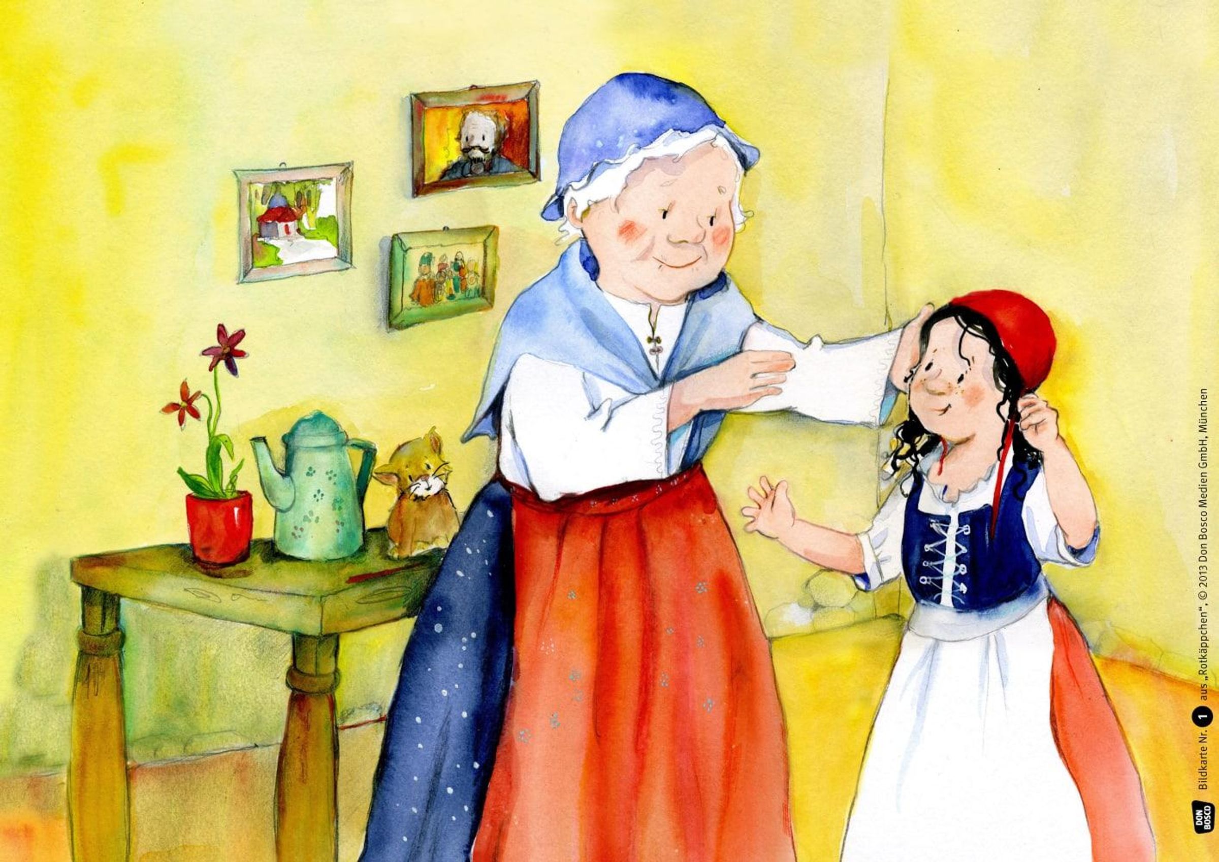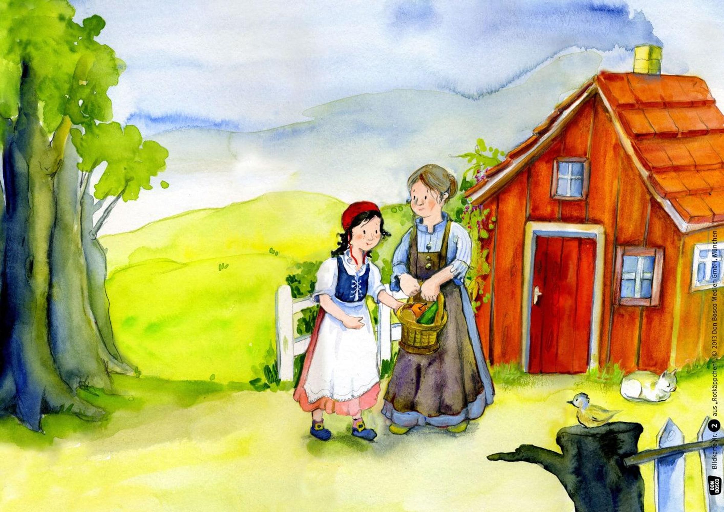 Rotkäppchen bringt seiner kranken Oma Kuchen und Wein. Auf dem Weg durch den Wald spricht ein Wolf sie an und horcht sie aus, wo die Großmutter wohnt, denn er will sie beide verschlingen. Während Rotkäppchen noch Blumen pflückt, frisst der böse Wolf die Oma und indem er seine Stimme verstellt, überlistet er auch das Rotkäppchen und verschlingt es bei lebendigem Leib. Ein Jäger findet den Wolf im Bett der Oma und rettet die beiden aus dem Bauch des Wolfes. - Ein Märchen aus der Sammlung der Gebrüder Grimm.