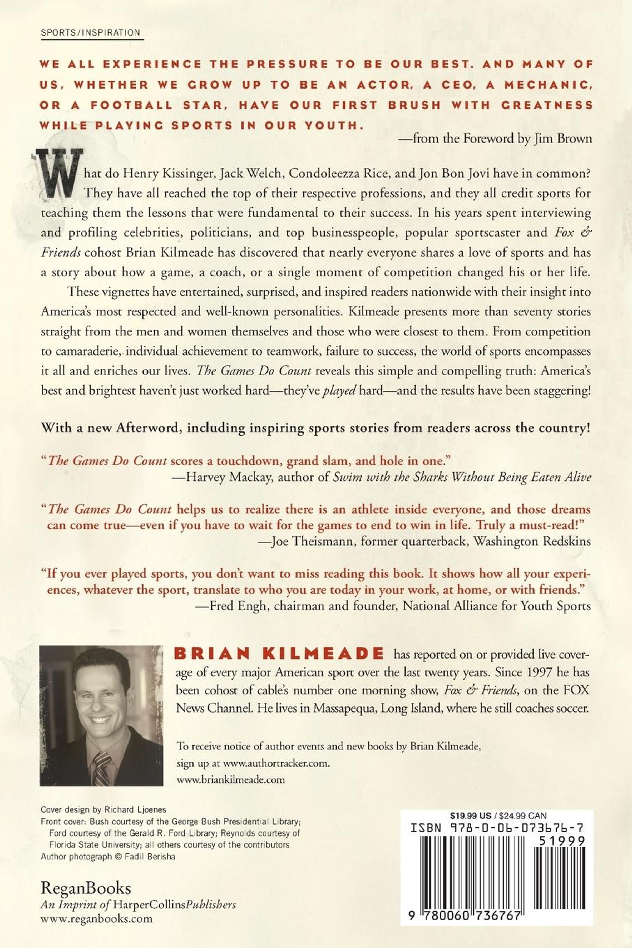 What do Henry Kissinger, Jack Welch, Condoleezza Rice, and Jon Bon Jovi have in common? They have all reached the top of their respective professions, and they all credit sports for teaching them the lessons that were fundamental to their success. In his years spent interviewing and profiling celebrities, politicians, and top businesspeople, popular sportscaster and Fox & Friends cohost Brian Kilmeade has discovered that nearly everyone shares a love of sports and has a story about how a game, a coach, or a single moment of competition changed his or her life. These vignettes have entertained, surprised, and inspired readers nationwide with their insight into America's most respected and well-known personalities. Kilmeade presents more than seventy stories straight from the men and women themselves and those who were closest to them. From competition to camaraderie, individual achievement to teamwork, failure to success, the world of sports encompasses it all and enriches our lives. The Games Do Count reveals this simple and compelling truth: America's best and brightest haven't just worked hard -- they've played hard -- and the results have been staggering!