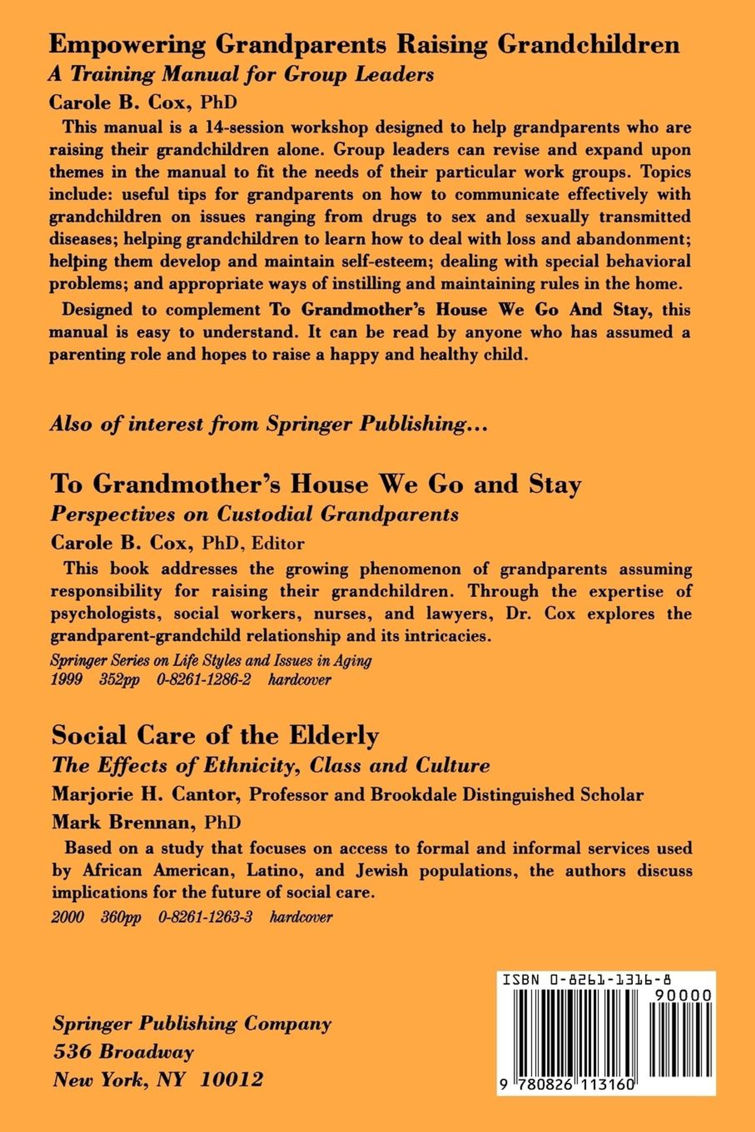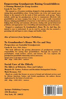 This manual is a 14-session workshop designed to help grandparents who are raising their grandchildren alone. Group leaders can revise and expand upon the themes presented here to fit the needs of their particular work groups. Some of the main issues that are explored are: useful tips for grandparents on how to communicate effectively with their grandchildren on all topics ranging from drugs and sex, to sexually transmitted diseases; helping them learn how to deal with loss and abandonment issues; helping them develop and maintain self-esteem; dealing with special behavior problems; and appropriate ways of instilling and maintaining rules in the home. Designed to complement To Grandmother's House We Go and Stay, it is very reader-friendly and easy to understand, and can be read by anyone who has assumed a parenting role of any sort and is interested in raising a happy and healthy child.