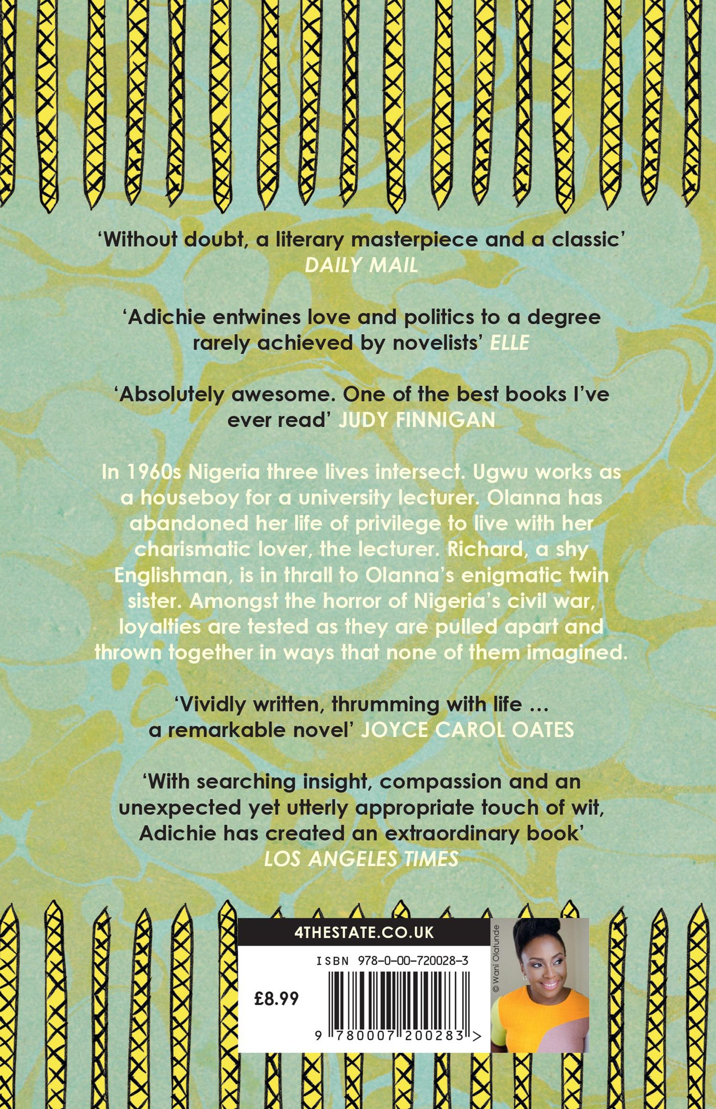 Set in Nigeria during the 1960s, at the time of a vicious civil war in which a million people died and thousands were massacred in cold blood. The three main characters in the novel are swept up in the violence during these turbulent years. One is a young boy from a poor village who is employed at a university lecturer's house. The other is a young middle-class woman, Olanna, who has to confront the reality of the massacre of her relatives. And the third is a white man, a writer who lives in Nigeria for no clear reason, and who falls in love with Olanna's sister, a remote and enigmatic character. As these people's lives intersect, they have to question their own responses to the unfolding political events...