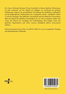 Der Autor, Christian Hermann Weisse, beschreibt in diesem Band das Christentum. Er geht umfassend auf den Begriff der Religion ein, beschreibt die göttliche Offenbarung, erläutert die geschichtliche Entwicklung des kirchlichen Lehrbegriffs und die philosophische Glaubenslehre der evangelischen Kirche. Ausführlich widmet er sich der Theologie, dem biblischen Gottesbegriff und den biblischen Gottesnamen, führt den Begriff der göttlichen Dreieinigkeit aus. In weiteren Kapiteln widmet sich Weisse der Materie als Grundlage der Weltschöpfung, dem heiligen Geist, den göttlichen Eigenschaften und vielen weiteren theologisch äußerst interessanten Inhalten.