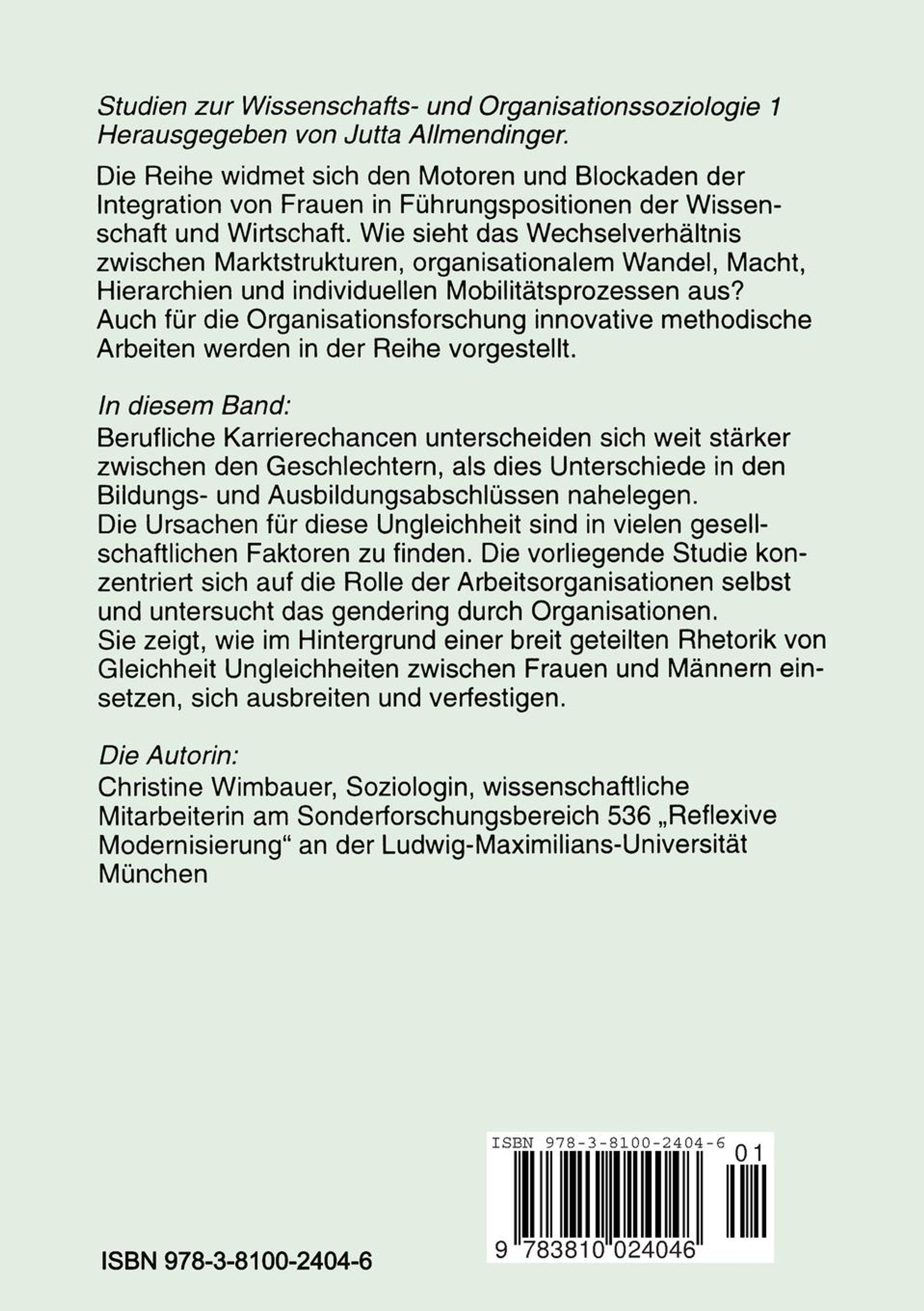 1. Einleitung.- 2. Geschlechtsspezifische Integration in den Arbeitsmarkt und in Organisationen.- 3. Die Fraunhofer-Gesellschaft: Anwendungsorientierte Wissenschaft.- 4. Design, Daten und Methode der Untersuchung.- 5. Organisationale Strukturen und Kontextbedingungen der Forschungseinrichtung.- 6. Auswirkungen der organisationalen Strukturen auf die Individuen.- 7. Zur Geschlechtsspezifik der organisationalen Anforderungen.- 8. Rückblick und Ausblick.- 9. Anhang.- 10. Literaturverzeichnis.