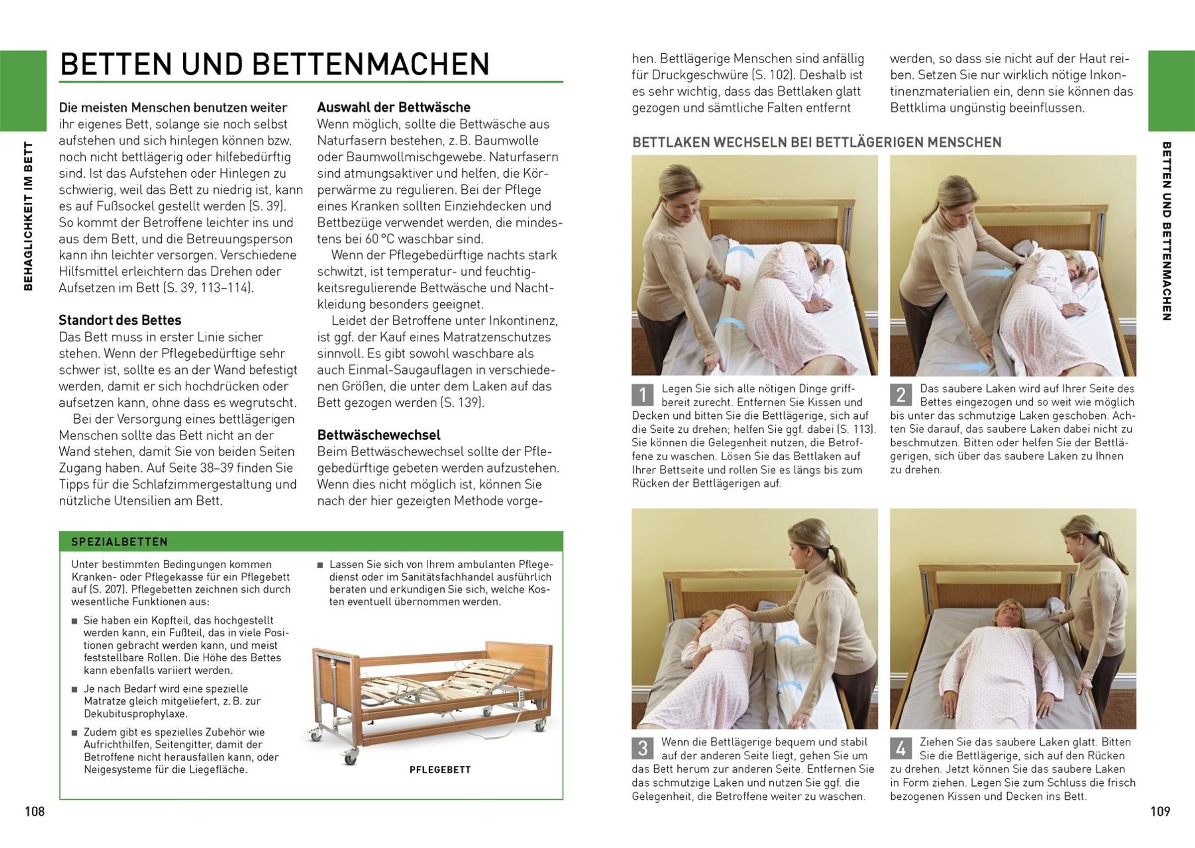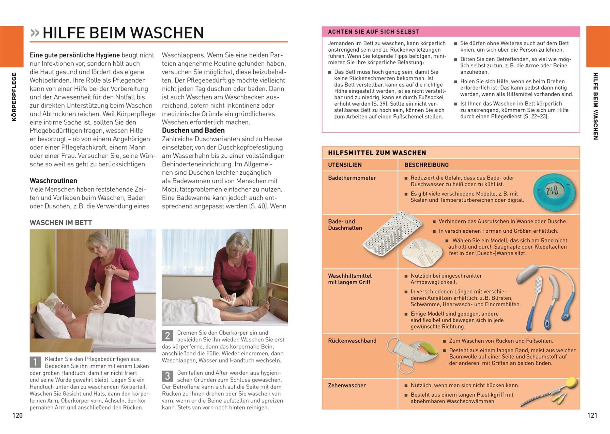 Der kompetente Leitfaden hält eine Fülle an praktischen Informationen und Anleitungen bereit: Er leistet Hilfe bei der Organisation und Vorbereitung und beschreibt detailliert mit Schritt-für-Schritt-Abbildungen, wie die Pflegehandlungen und Hilfestellungen auszuführen sind, zum Beispiel das Waschen bettlägeriger Menschen. Von der Körperpflege und der richtigen Ernährung über Erste Hilfe bis zum Umgang mit Demenz werden alle wichtigen Themen besprochen. Außerdem gibt Ihnen das Praxisbuch Tipps und Ratschläge, wie Sie zusätzliche Unterstützung beantragen und organisieren können. Im Anhang finden sich wichtige Adressen und Informationsmöglichkeiten für Deutschland, Österreich und die Schweiz.