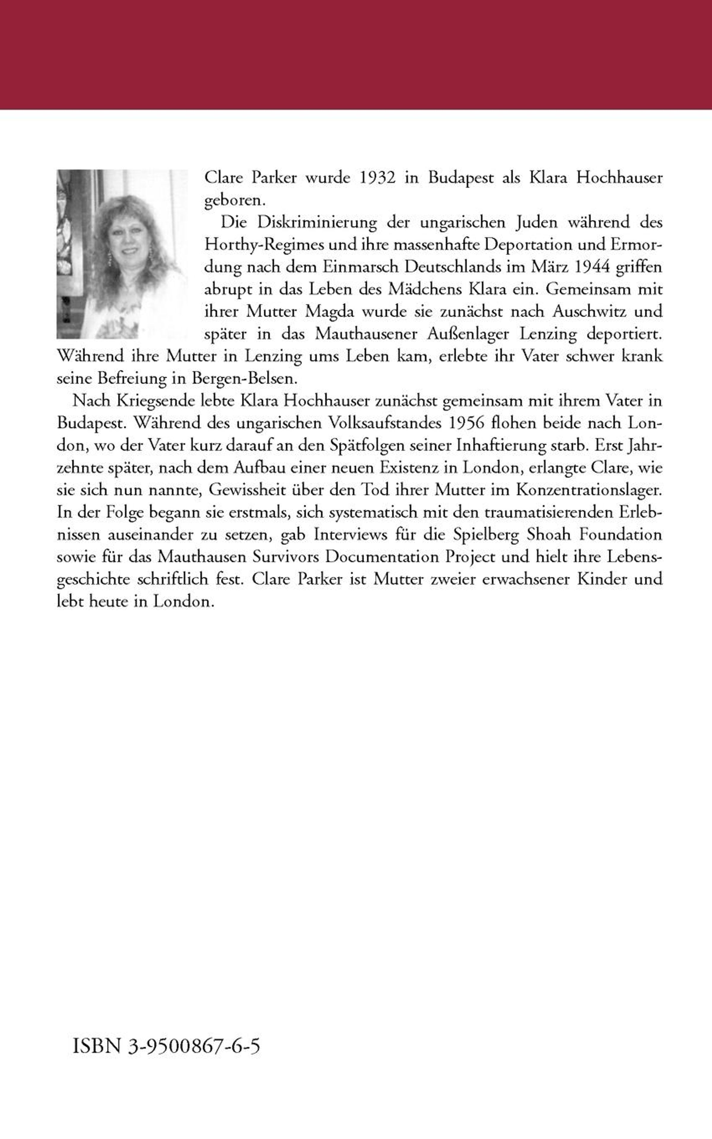Clare Parker wurde 1932 in Budapest als Klara Hochhauser geboren. Die Diskriminierung der ungarischen Juden während des Horthy-Regimes und ihre massenhafte Deportation und Ermordung nach dem Einmarsch Deutschlands im März 1944 griffen abrupt in das Leben des Mädchens Klara ein. Gemeinsam mit ihrer Mutter Magda wurde sie zunächst nach Auschwitz und später in das Mauthausener Außenlager Lenzing deportiert. Während ihre Mutter in Lenzing ums Leben kam, erlebte ihr Vater schwer krank seine Befreiung in Bergen-Belsen. Nach Kriegsende lebte Klara Hochhauser zunächst gemeinsam mit ihrem Vater in Budapest. Während des ungarischen Volksaufstandes 1956 flohen beide nach London, wo der Vater kurz darauf an den Spätfolgen seiner Inhaftierung starb. Erst Jahrzehnte später, nach dem Aufbau einer neuen Existenz in London, erlangte Clare, wie sie sich nun nannte, Gewissheit über den Tod ihrer Mutter im Konzentrationslager. In der Folge begann sie erstmals, sich systematisch mit den traumatisierenden Erlebnissen auseinander zu setzen, gab Interviews für die Spielberg Shoah Foundation sowie für das Mauthausen Survivors Documentation Project und hielt ihre Lebensgeschichte schriftlich fest. Clare Parker ist Mutter zweier erwachsener Kinder und lebt heute in London.