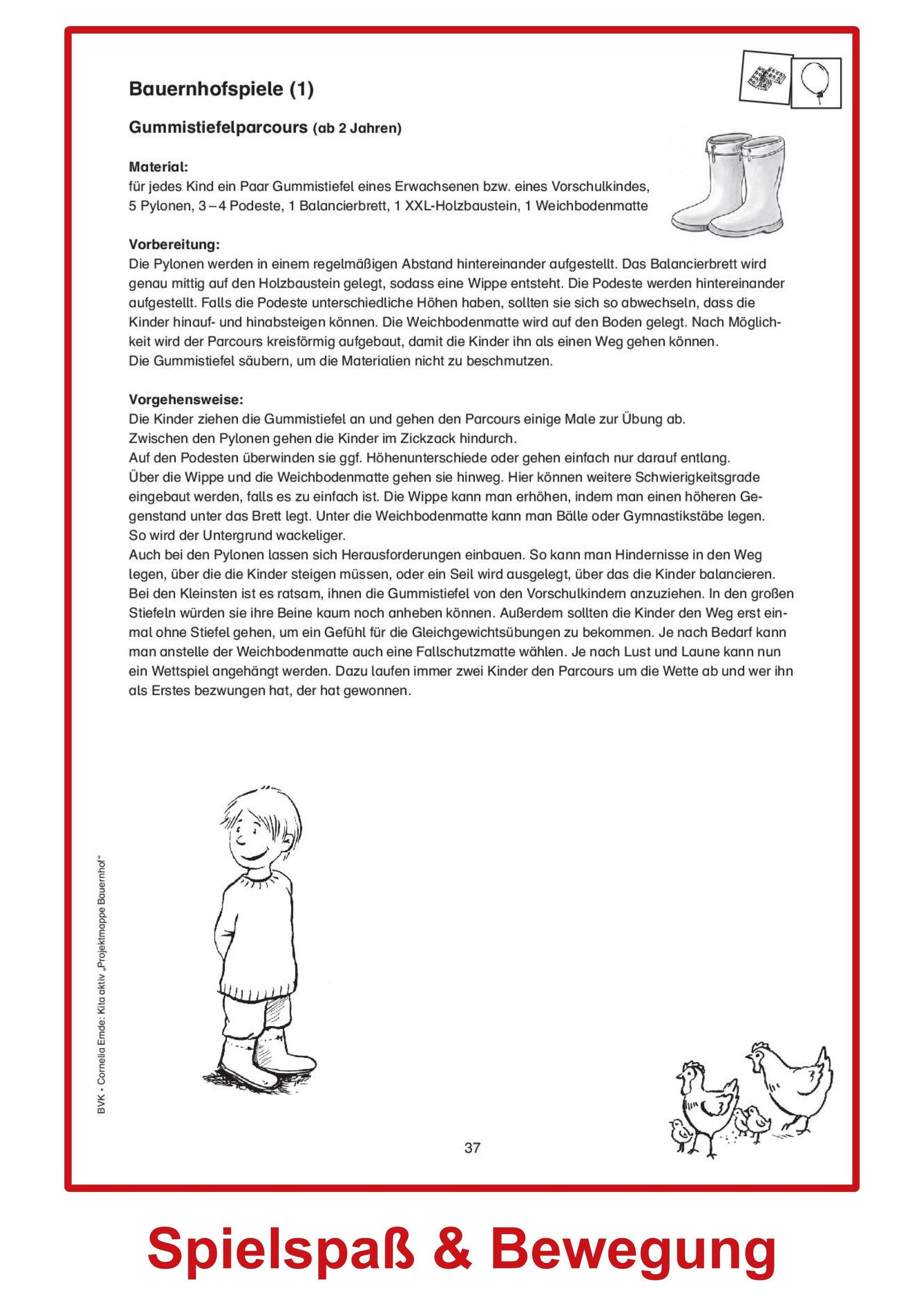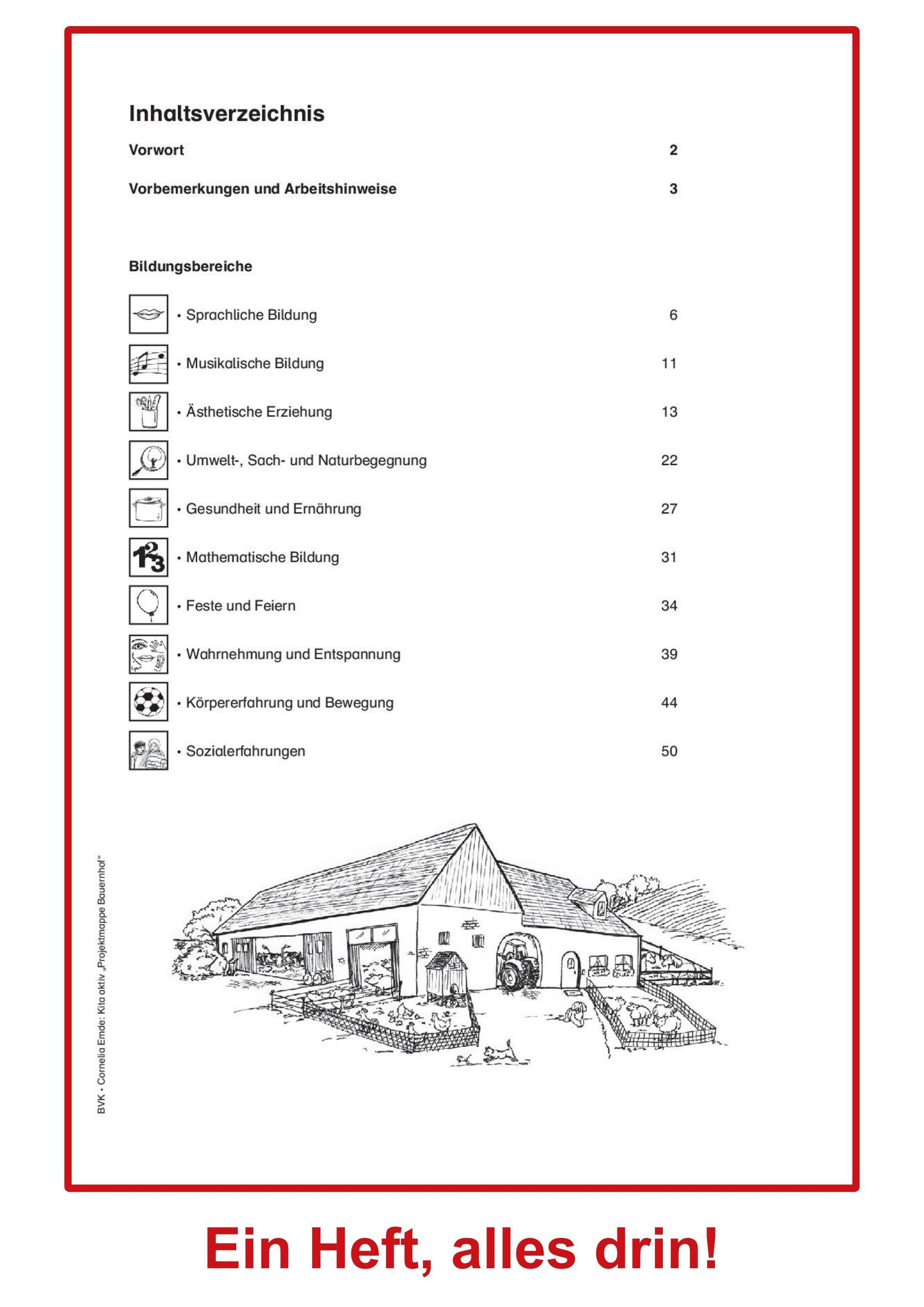 Aus dem Inhalt: Tiergeräusche üben - Mitmach-Geschichte - Der Getreidehalmtanz - Bauernhoflied - Tiermasken basteln - Bauernhof-Spielebild - Getreidehalmkrone basteln - Saft pressen - Butter selbst gemacht - Der Bauernhofmarkt - Gummistiefelparcours - Strohwühlen - Schlammbad - Im Hühnerstall - Treckerführerschein ...