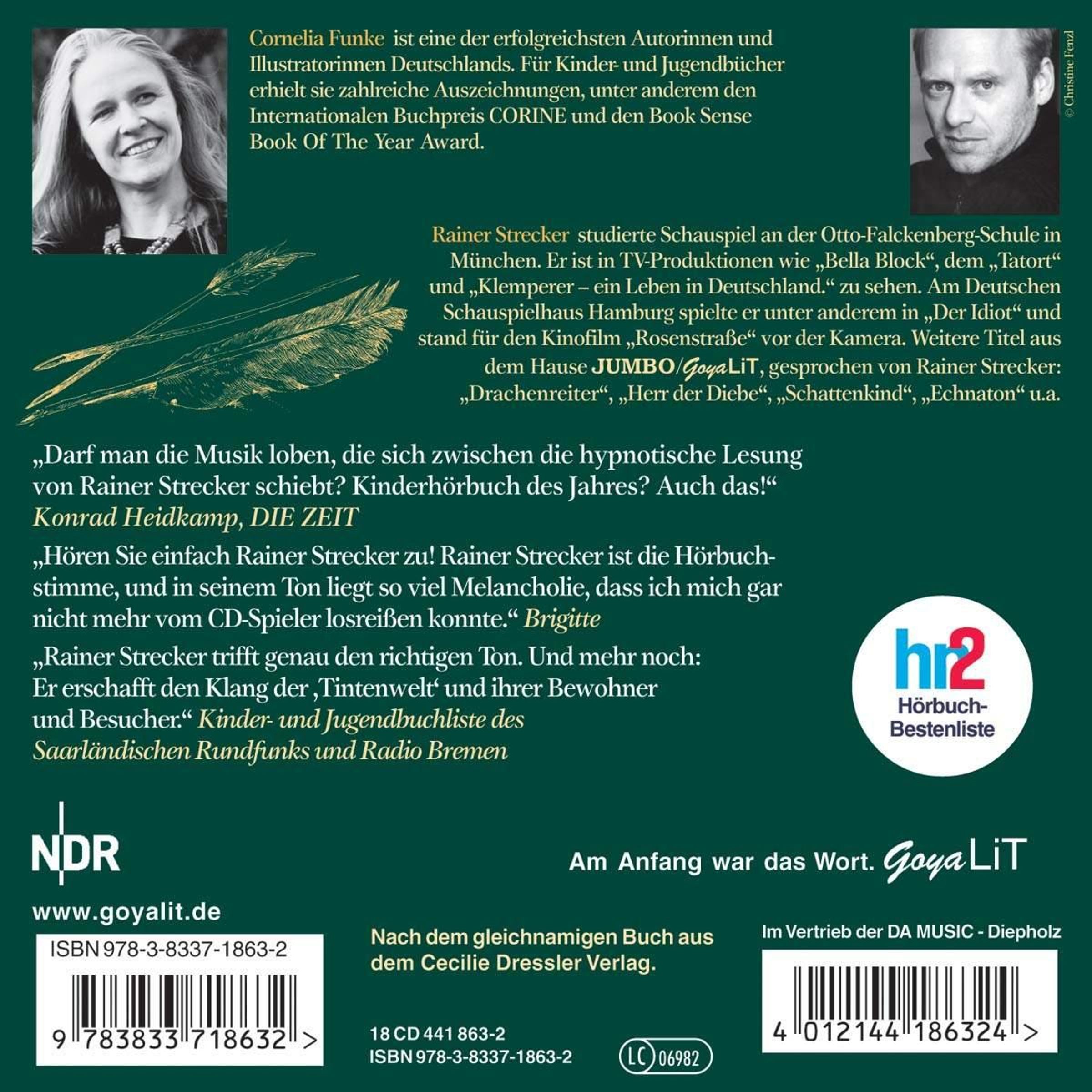 Cornelia Funke wurde 1958 in Dorsten/Westfalen geboren, zog nach dem Abitur nach Hamburg und absolvierte eine Ausbildung als Diplompädagogin. Drei Jahre lang arbeitete sie als Erzieherin auf einem Bauspielplatz und studierte parallel dazu Buchillustration an der Fachhochschule für Gestaltung in Hamburg.§Nach Abschluss des Studiums war Cornelia Funke zunächst ausschließlich als Illustratorin für Kinderbücher tätig - eine Arbeit, die sie dazu anregte, selbst Geschichten für junge Leserinnen und Leser zu schreiben. So wurde sie mit 28 Jahren freischaffende Autorin und Illustratorin.§Ihre freie Zeit verbringt Cornelia Funke am liebsten mit ihrer Familie. Außerdem ist sie ein großer Filmfan, reist gern und liest, so viel sie kann.§Seit Mai 2005 wohnt Cornelia Funke mit ihrer Familie in Los Angeles; zuvor lebte sie am Stadtrand von Hamburg.§2008 erhielt sie den "Roswitha-Preis" der Stadt Bad Gandersheim und den Medienpreis "Bambi", 2009 den Jacob-Grimm-Preis.Tracklisting