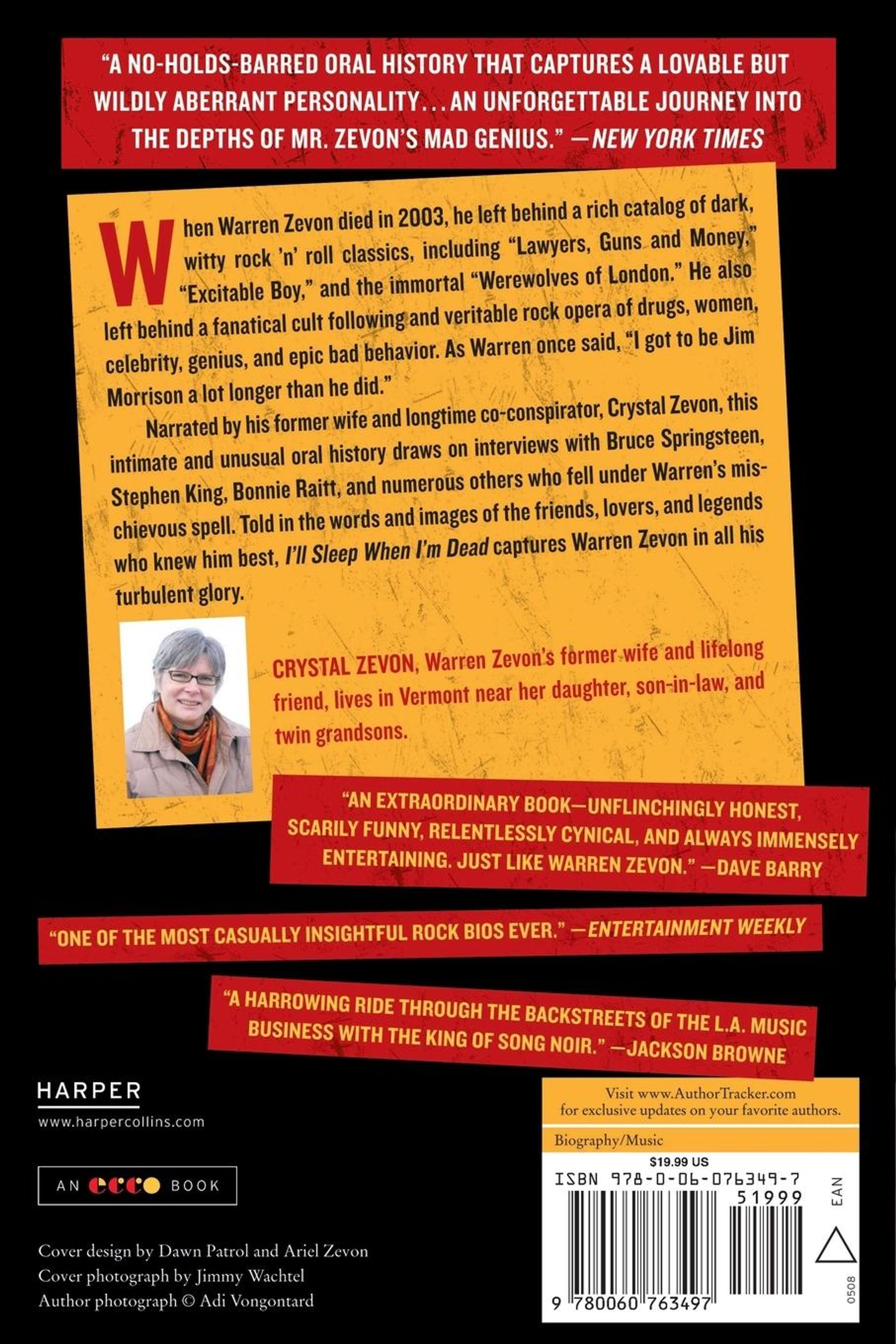 When Warren Zevon died in 2003, he left behind a rich catalog of dark, witty rock 'n' roll classics, including "Lawyers, Guns and Money," "Excitable Boy," and the immortal "Werewolves of London." He also left behind a fanatical cult following and veritable rock opera of drugs, women, celebrity, genius, and epic bad behavior. As Warren once said, "I got to be Jim Morrison a lot longer than he did." Narrated by his former wife and longtime co-conspirator, Crystal Zevon, this intimate and unusual oral history draws on interviews with Bruce Springsteen, Stephen King, Bonnie Raitt, and numerous others who fell under Warren's mischievous spell. Told in the words and images of the friends, lovers, and legends who knew him best, I'll Sleep When I'm Dead captures Warren Zevon in all his turbulent glory.